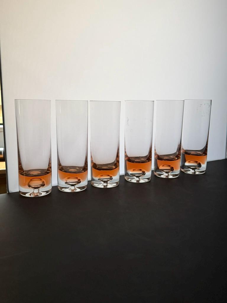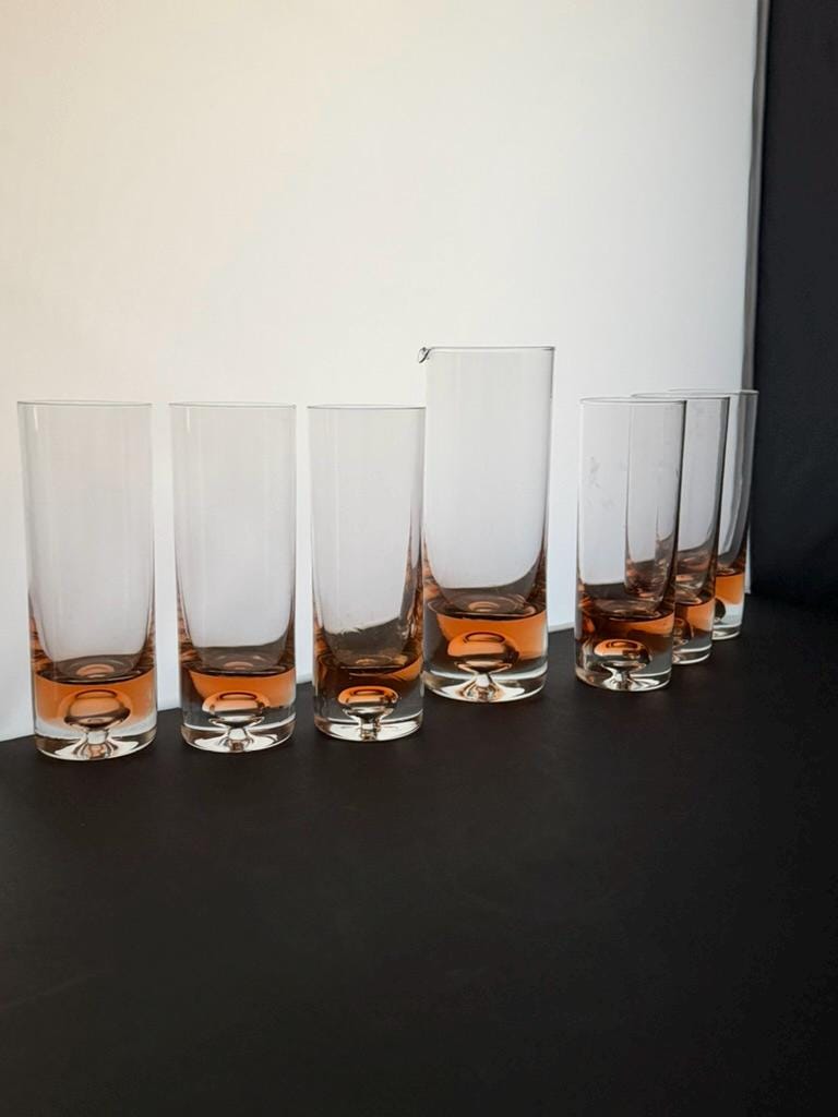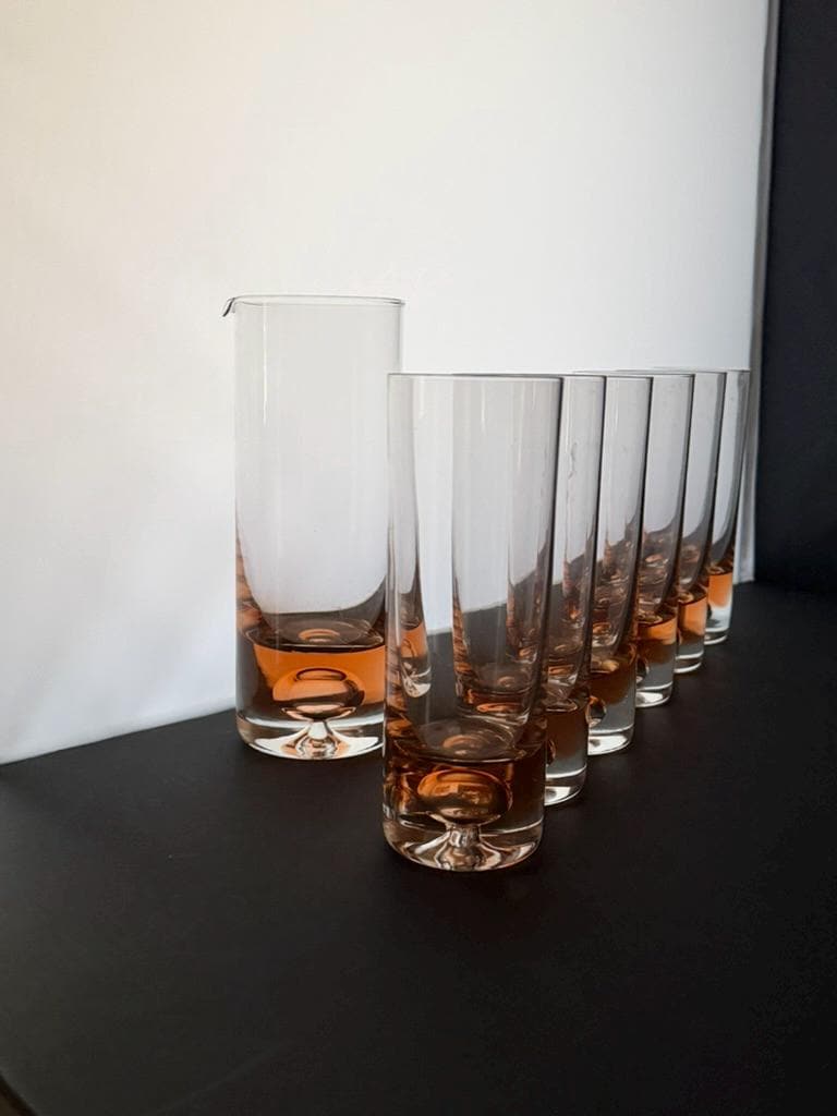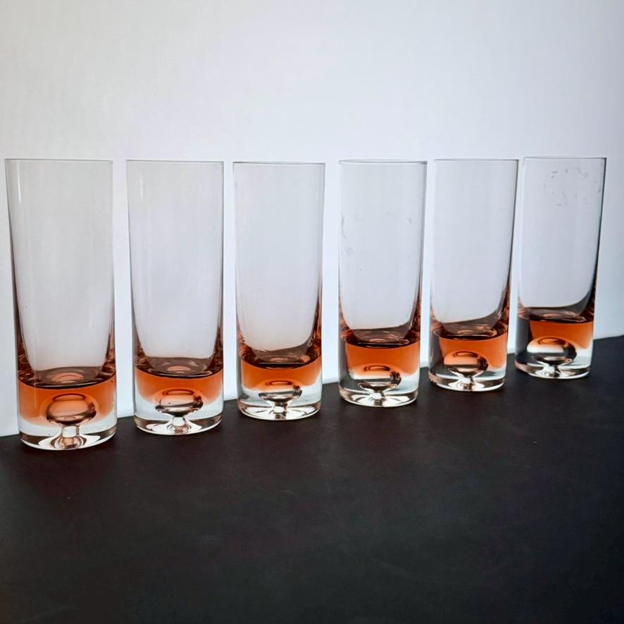 Bring timeless Scandinavian elegance to your table with this exquisite vintage set of six handblown coral pink longdrink glasses and a matching carafe. Crafted in Sweden during the 1970s, this set epitomizes the clean, sophisticated aesthetic of Scandinavian design. The glasses and carafe feature a subtle air bubble detail at the base, showcasing the artistry of handblown crystal craftsmanship.
