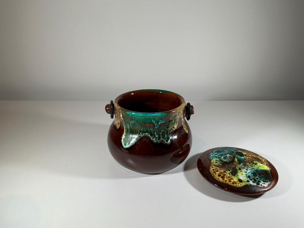 Enhance your home decor with this vintage Vallauris bonbonnière in shades of brown, green, and yellow. This elegant French pottery is perfect for storing candies or tiny treasures.