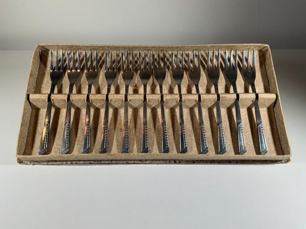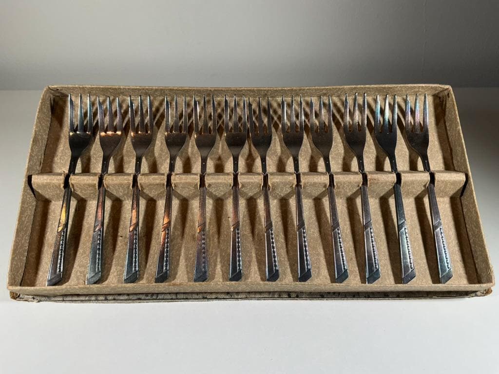 Enhance your dining experience with this set of 12 vintage Art Deco silver-plated dessert forks in its original packaging.