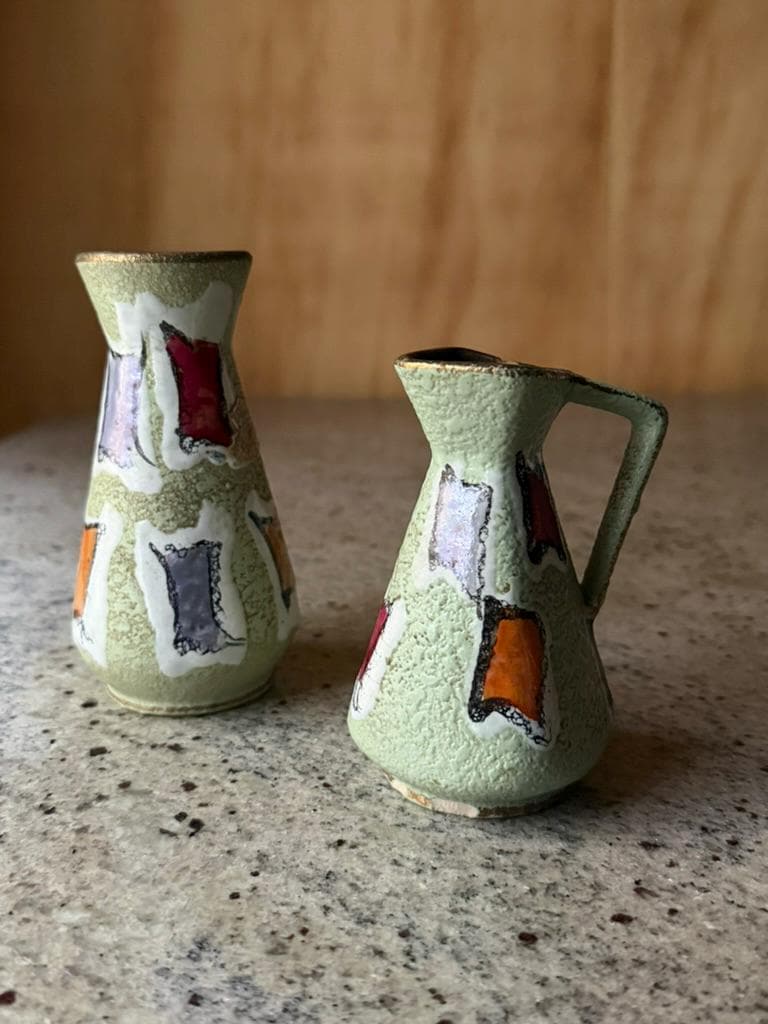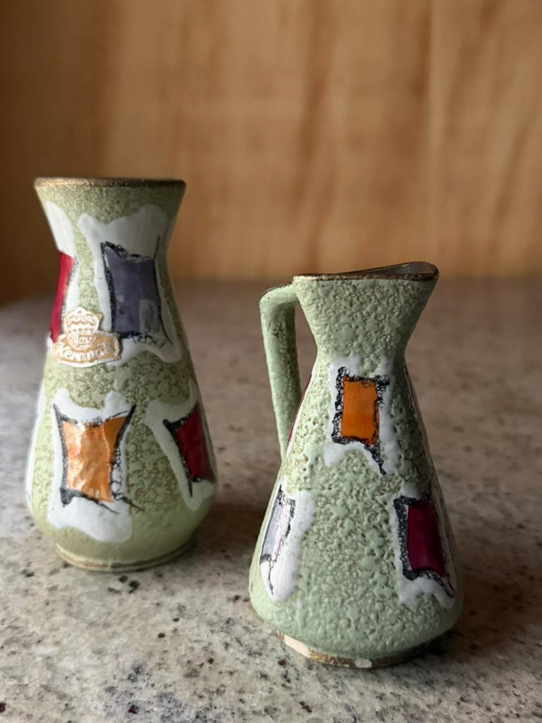 Add a touch of mid-century charm to your collection with this vintage 1970s Scheurich miniature vase and jar from West Germany. Featuring the original label, this collectible piece is perfect for enthusiasts of retro decor and German pottery.