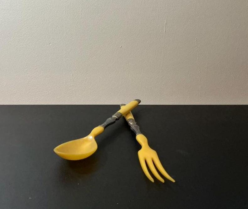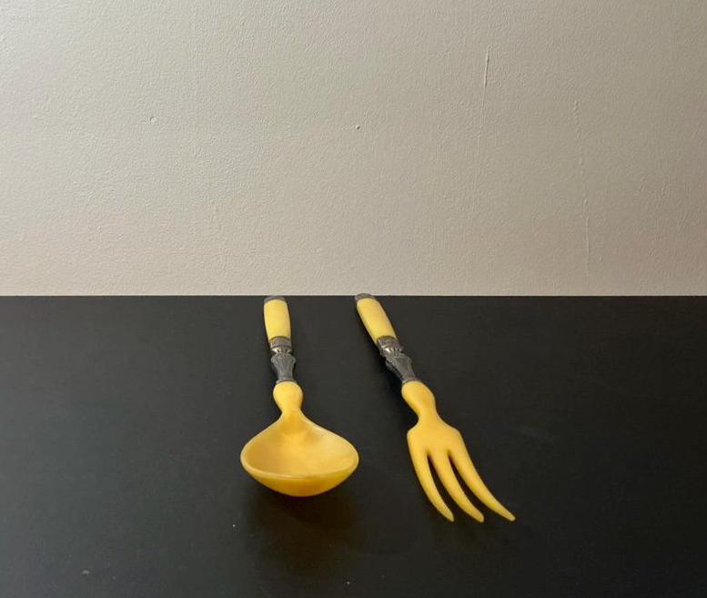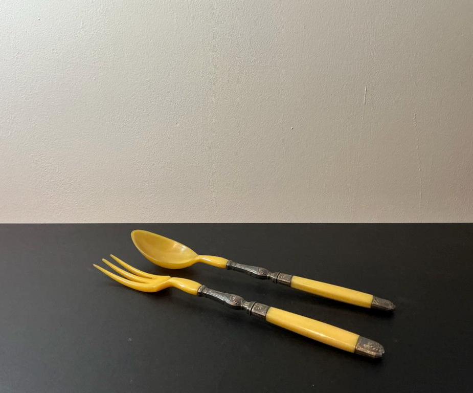 Vintage Horn and Silver Salad Serving Set | Antique Fork & Spoon Set