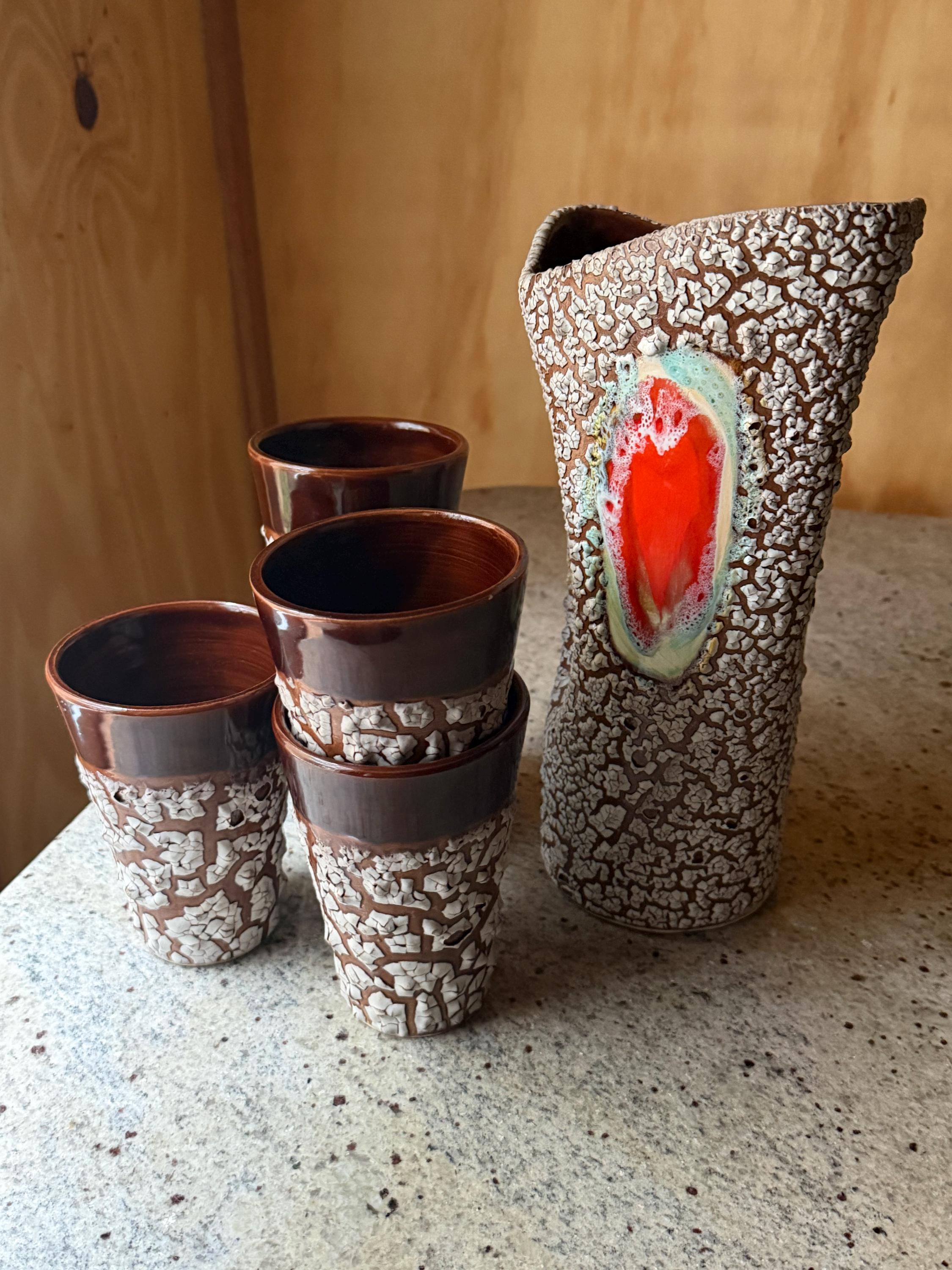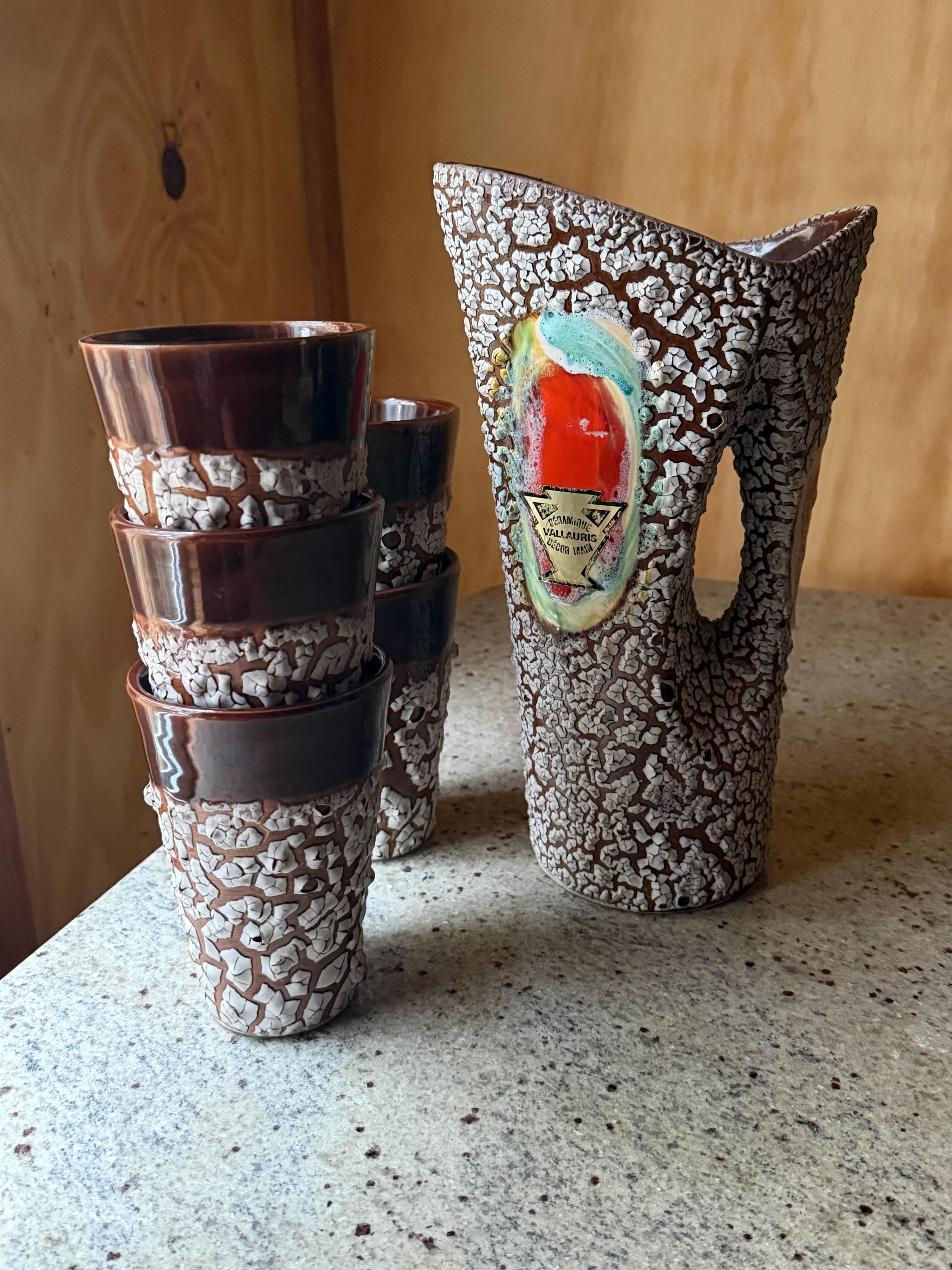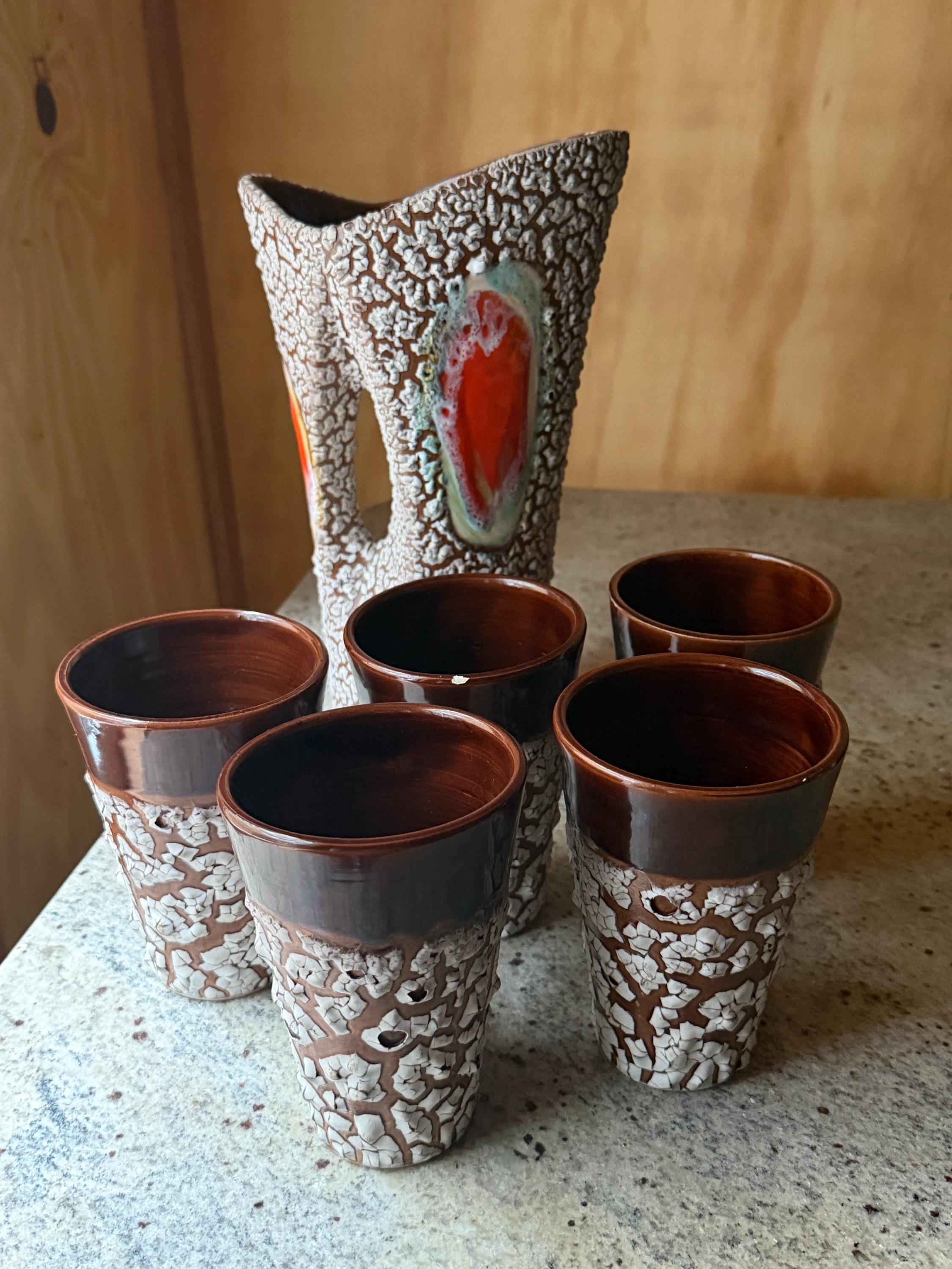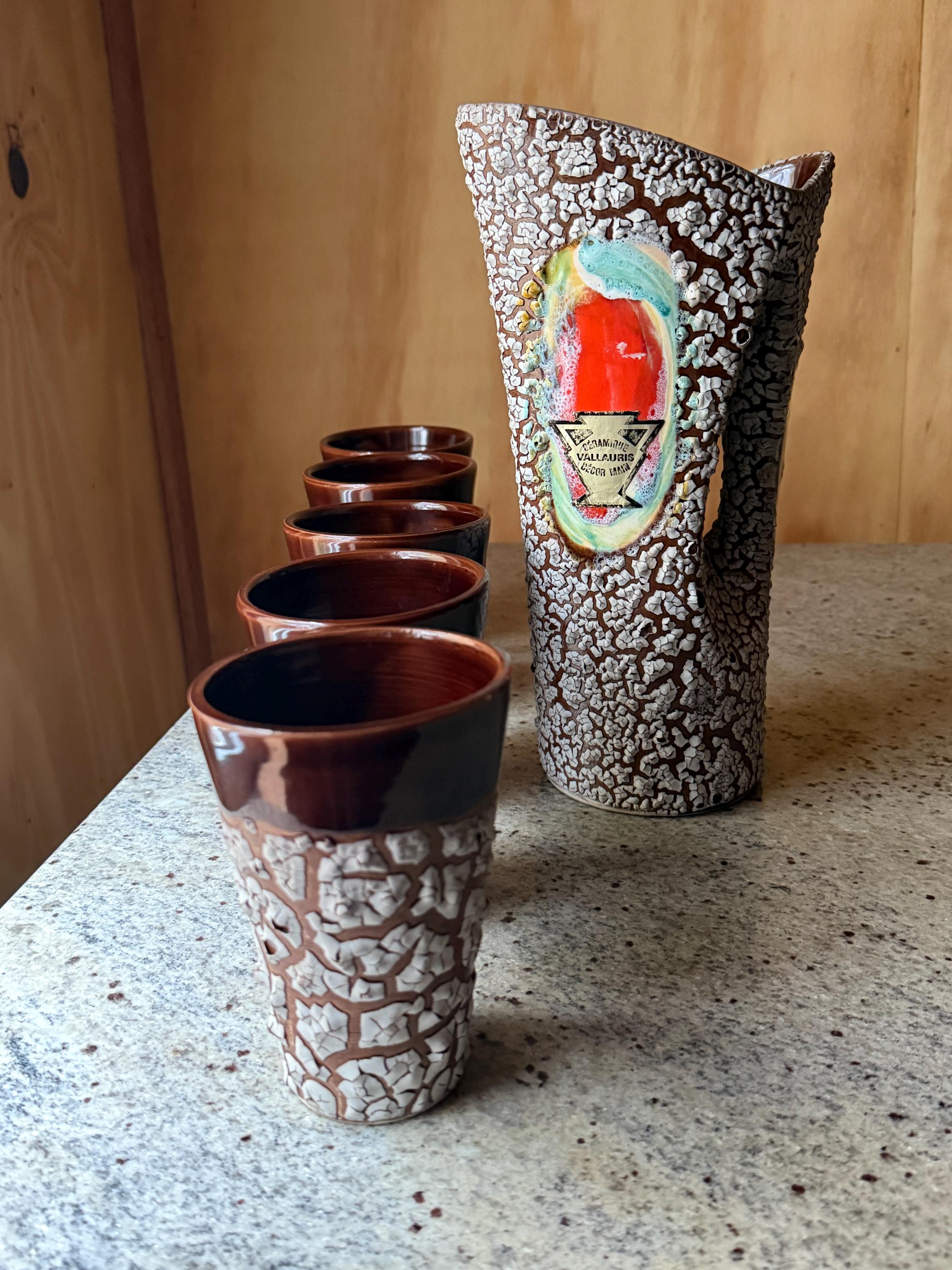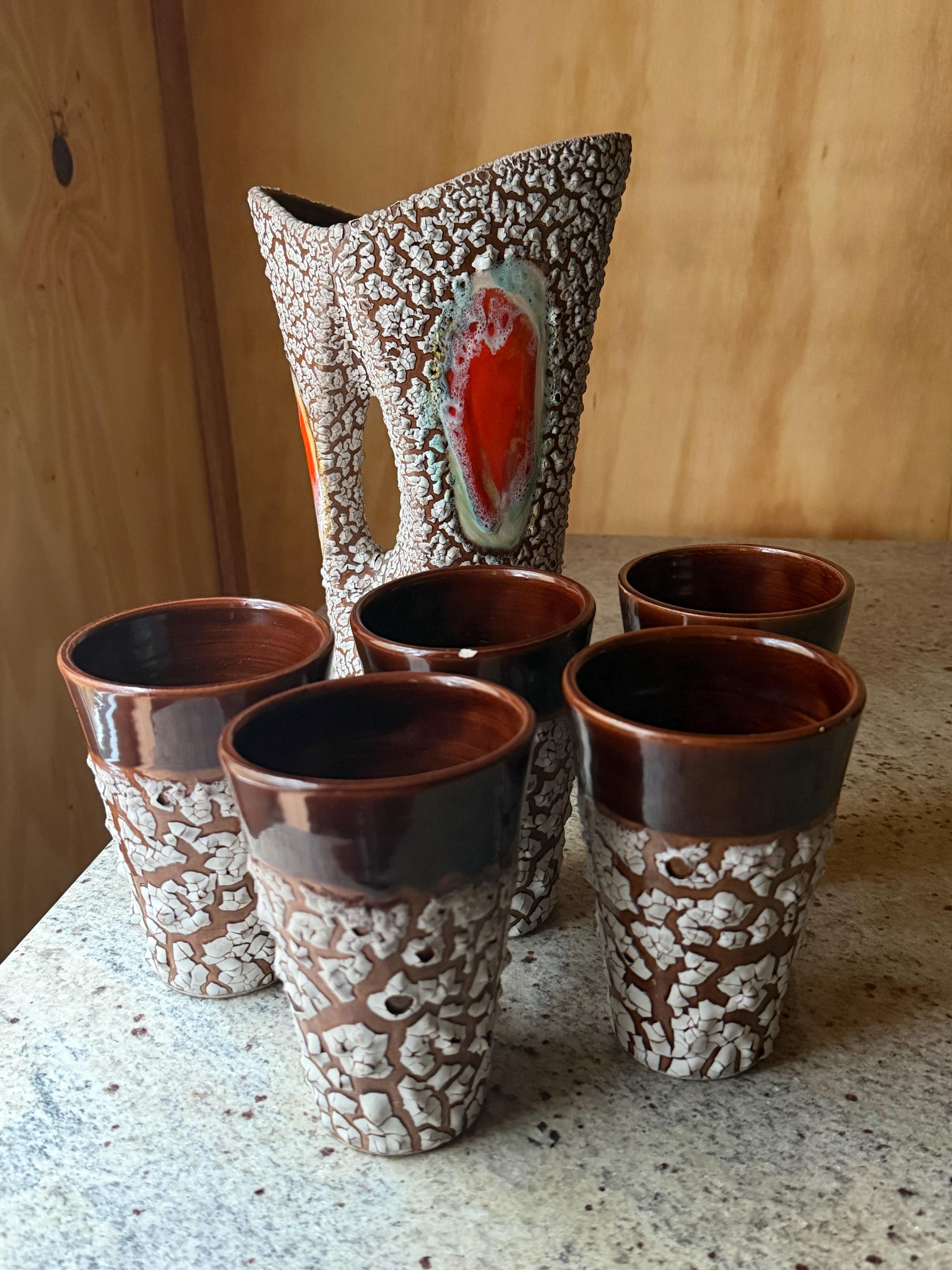 Vintage Vallauris Ceramic Pitcher/Carafe/Jug with 5 Glasses Set | Fat Lava Cracked/Flamed Pottery 1970s French Pottery Art