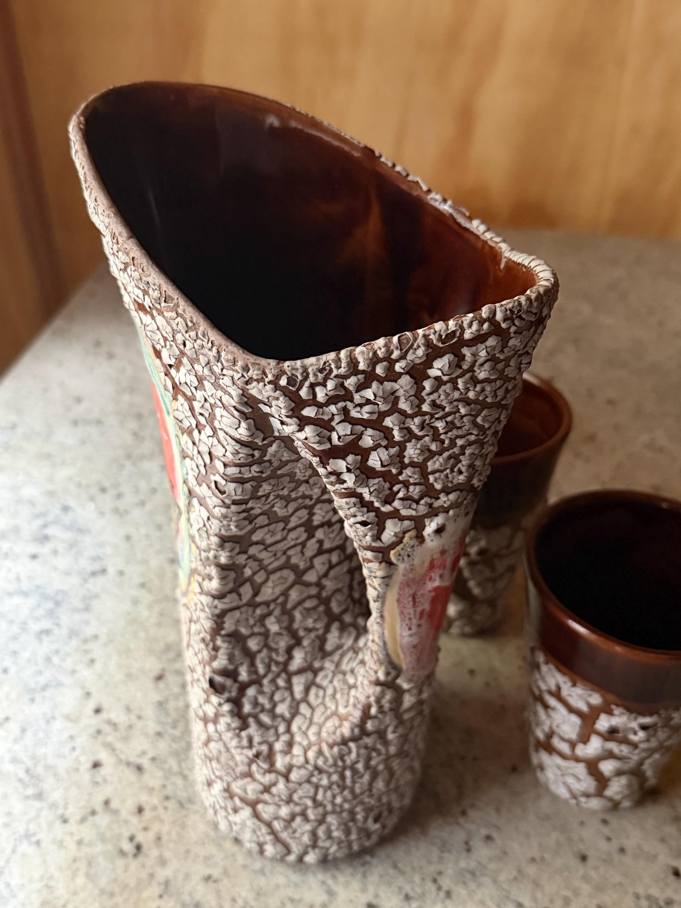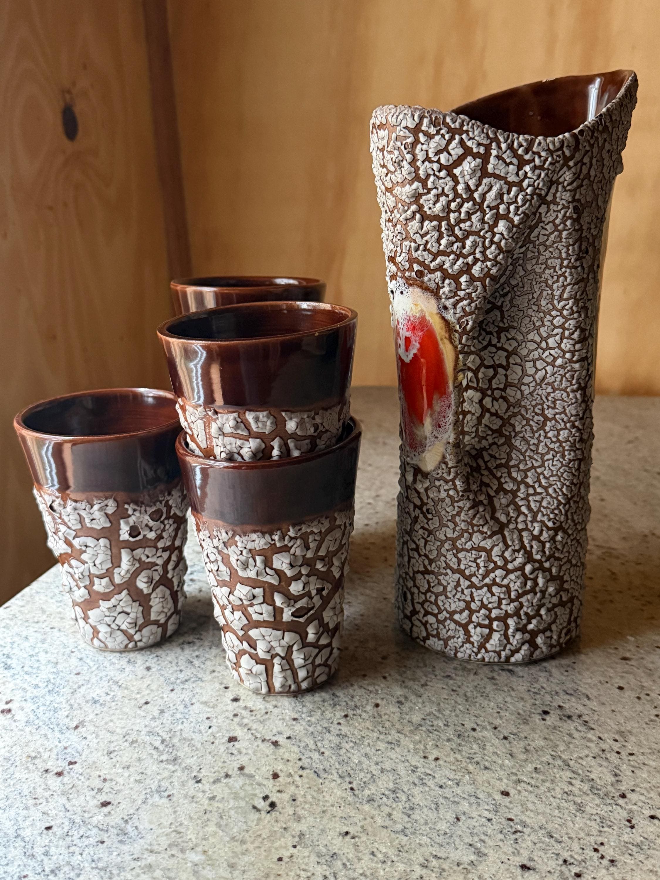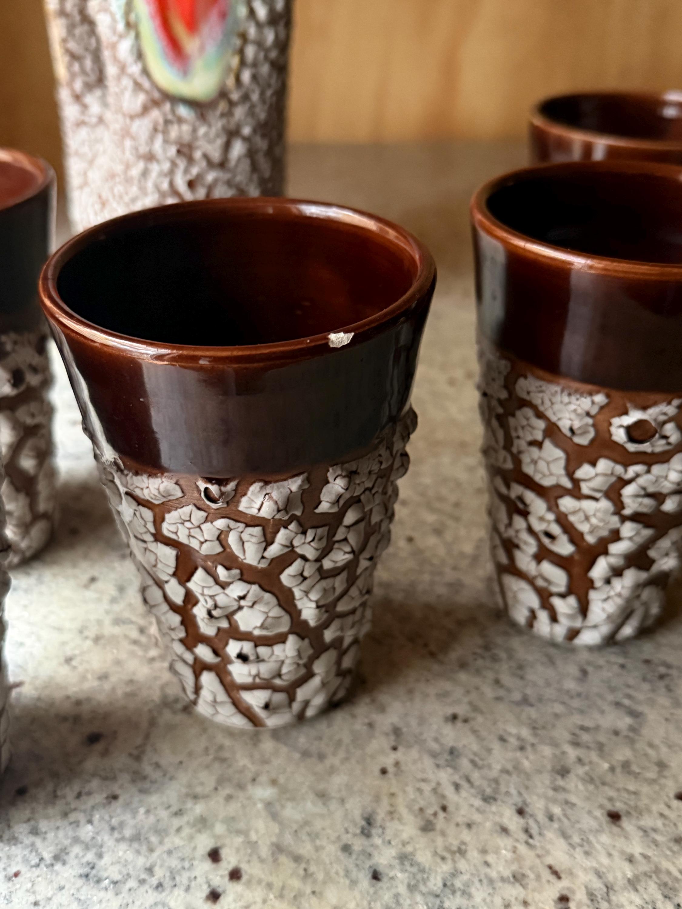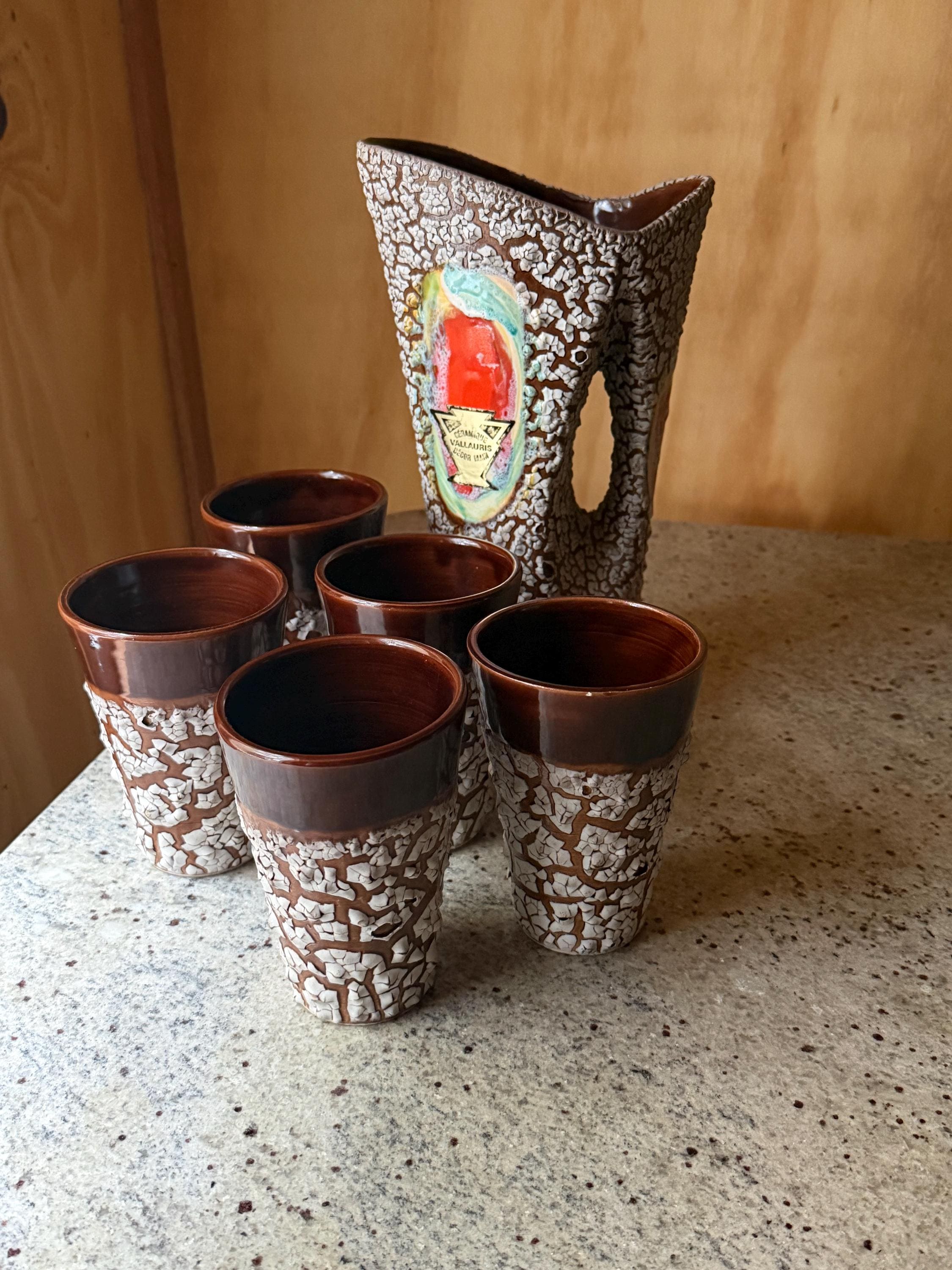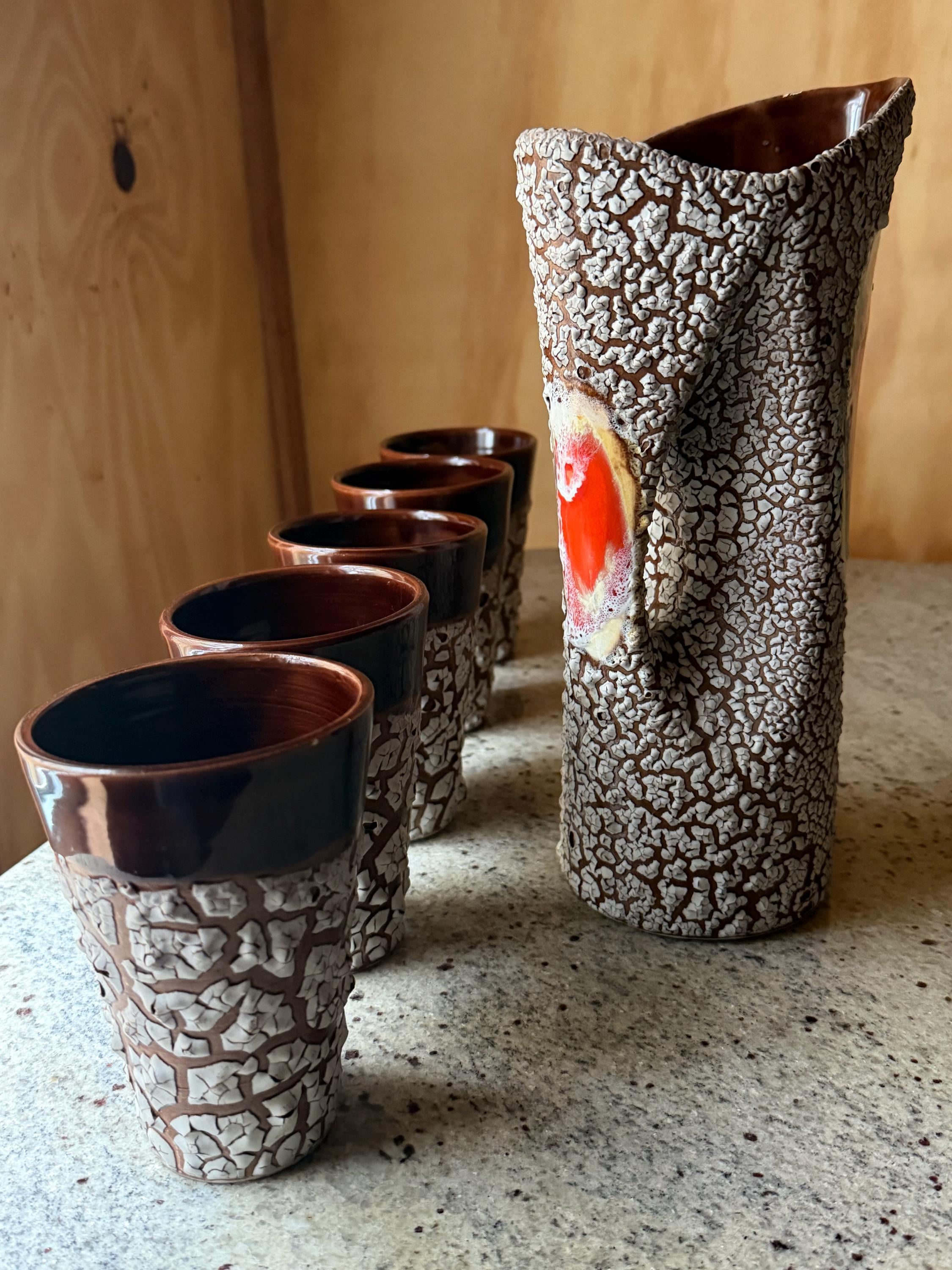 Vintage Vallauris Ceramic Pitcher/Carafe/Jug with 5 Glasses Set | Fat Lava Cracked/Flamed Pottery 1970s French Pottery Art