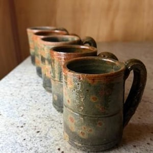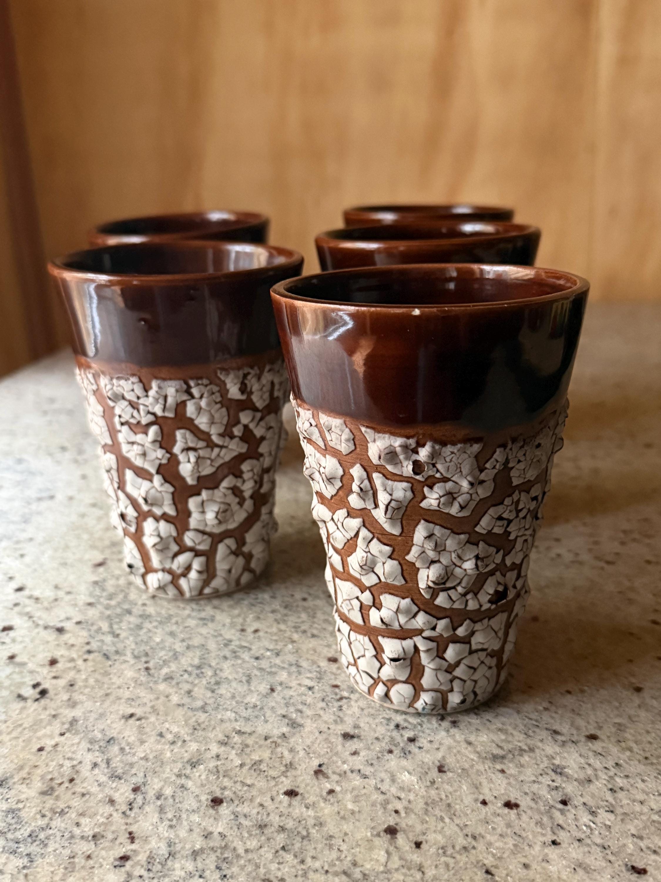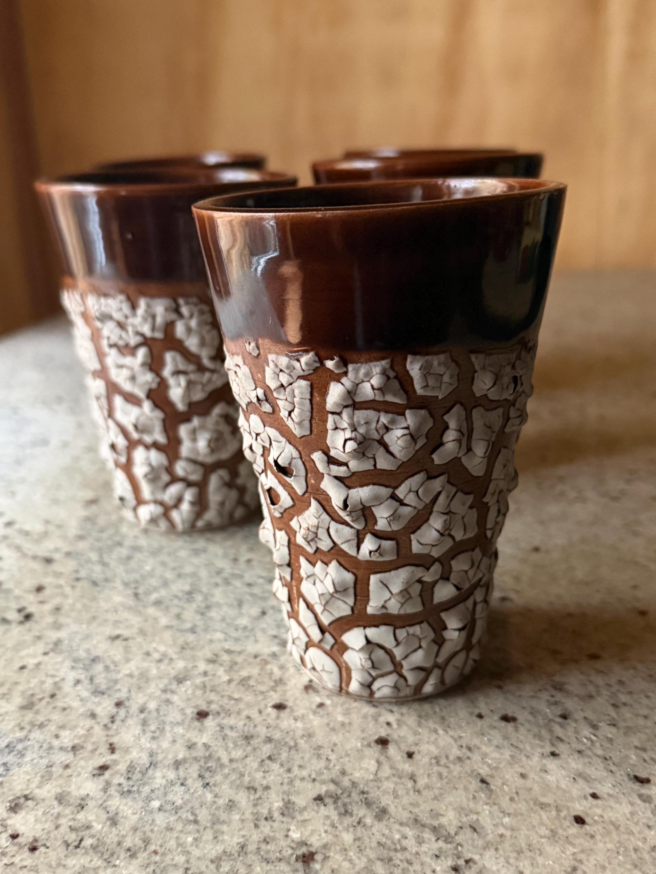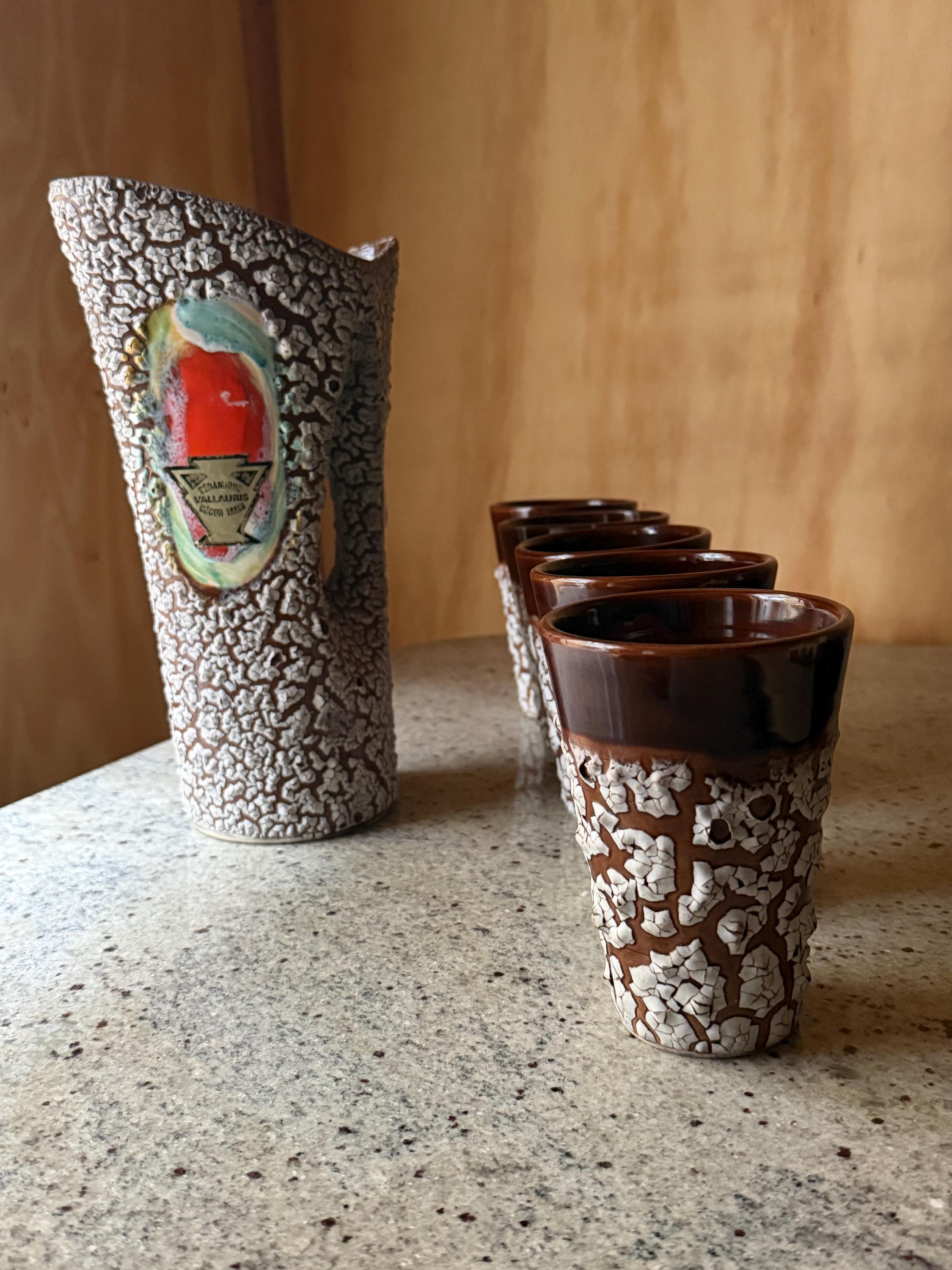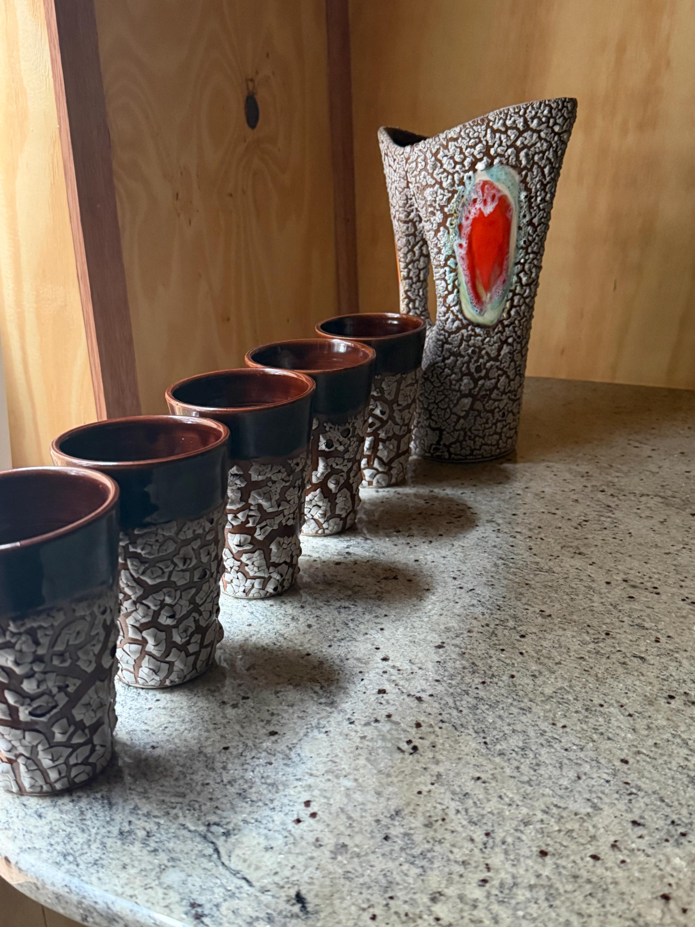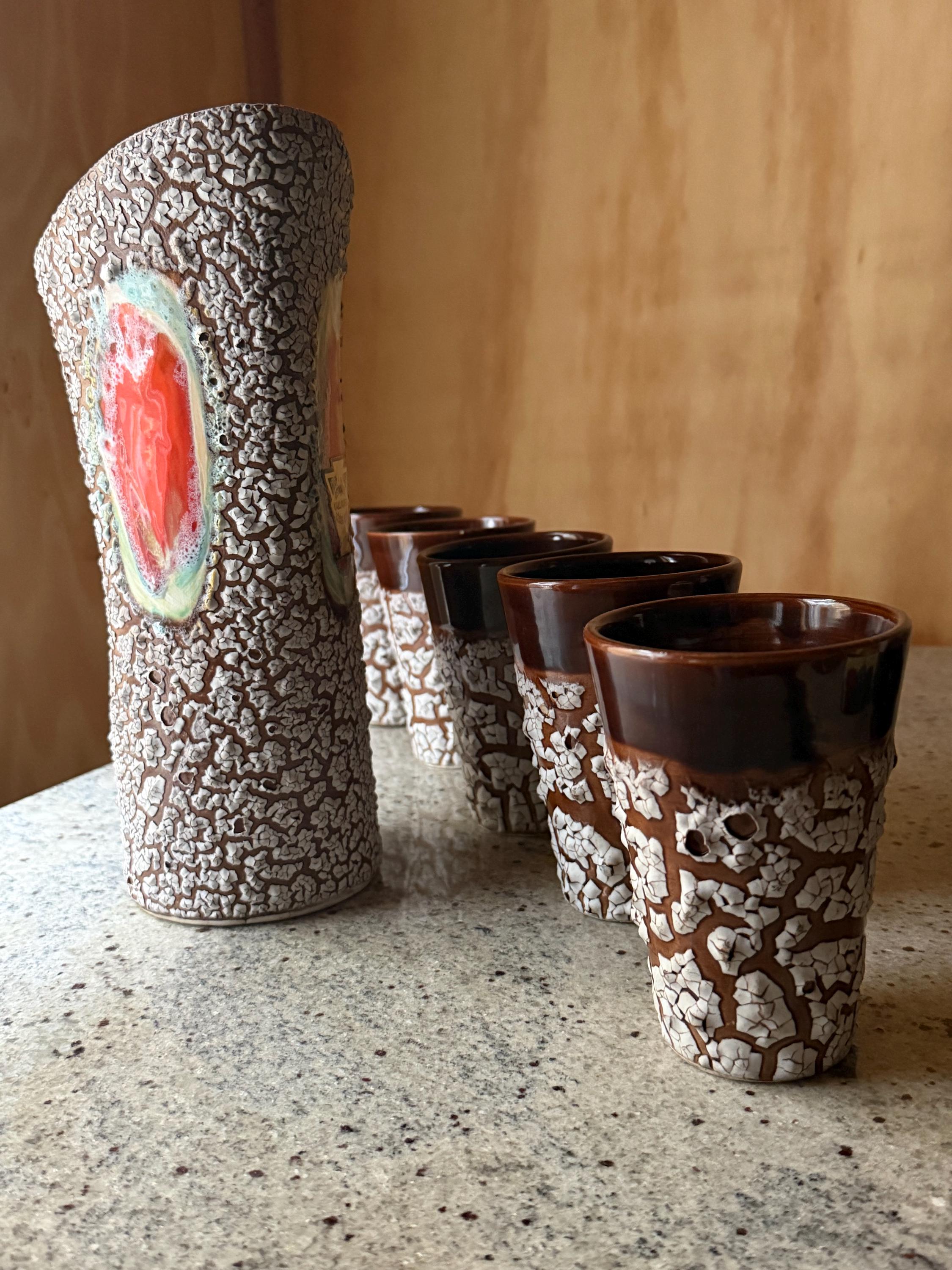 Vintage Vallauris Ceramic Pitcher/Carafe/Jug with 5 Glasses Set | Fat Lava Cracked/Flamed Pottery 1970s French Pottery Art