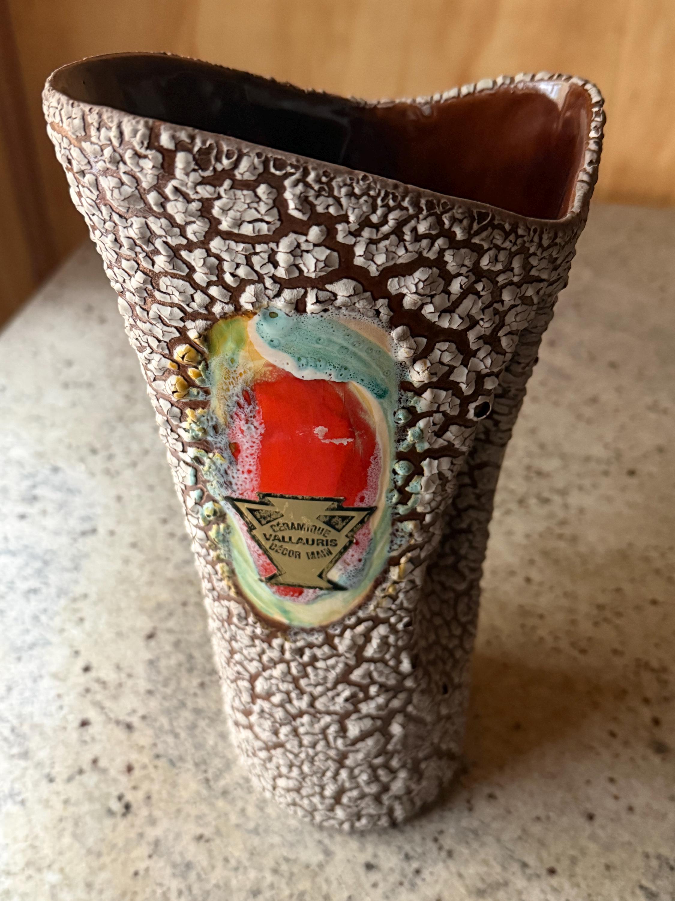 Ideal for serving drinks or as a display piece, the set includes a tall, elegantly crafted pitcher and five matching glasses. Minor chips on one glass and the pitcher rim are barely noticeable and do not diminish the charm or authenticity. The original Vallauris label remains intact, enhancing its collectible appeal.