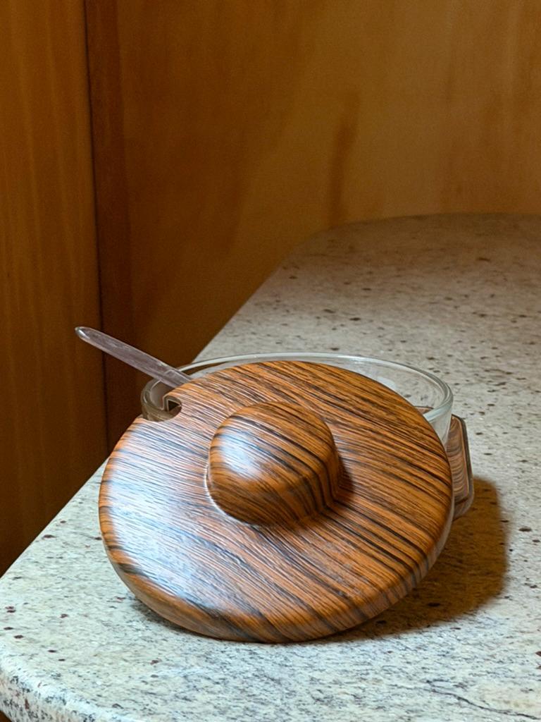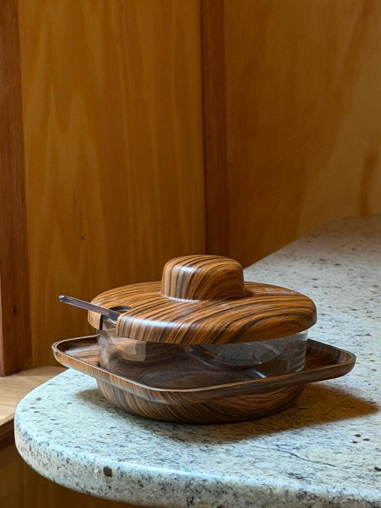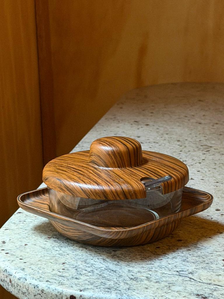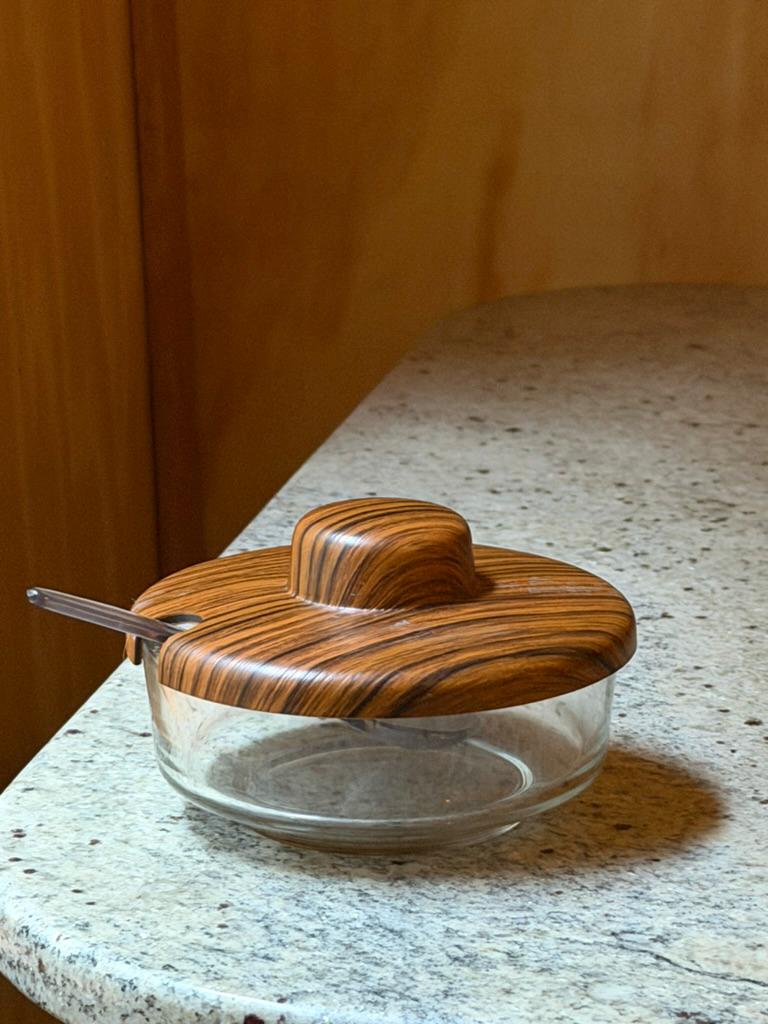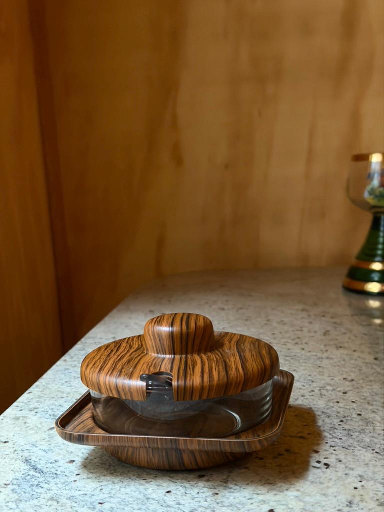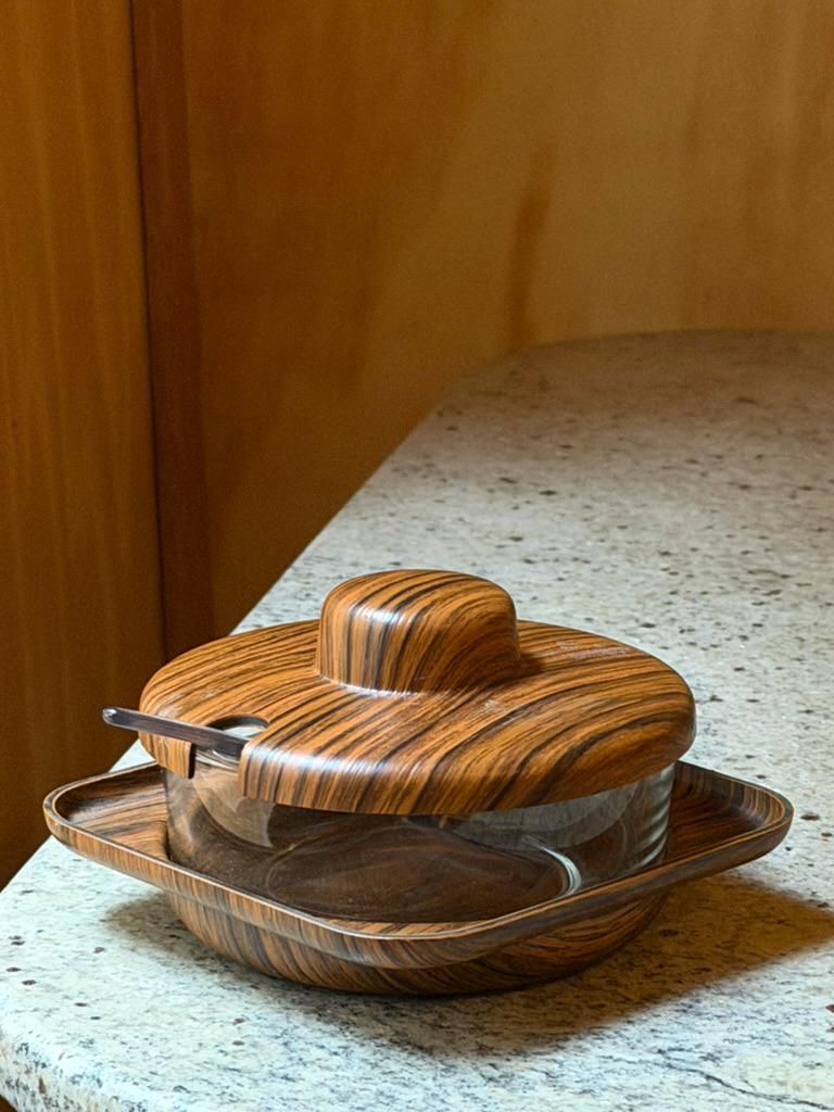 Crafted in Italy during the 1960s-1970s, this glass storage with a faux woodgrain lid and matching holder exudes retro charm. Its sleek lines and Scandinavian-inspired design make it a must-have for collectors and anyone looking to add a sophisticated accent to their space. Whether hosting a dinner or styling your kitchen, this jar will be a conversation starter.