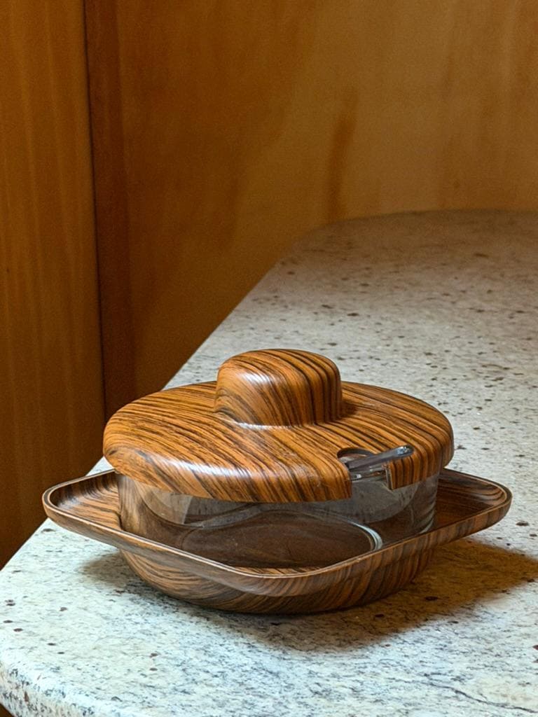 Material: Durable molded plastic exterior with faux wood look and a transparent inner jar