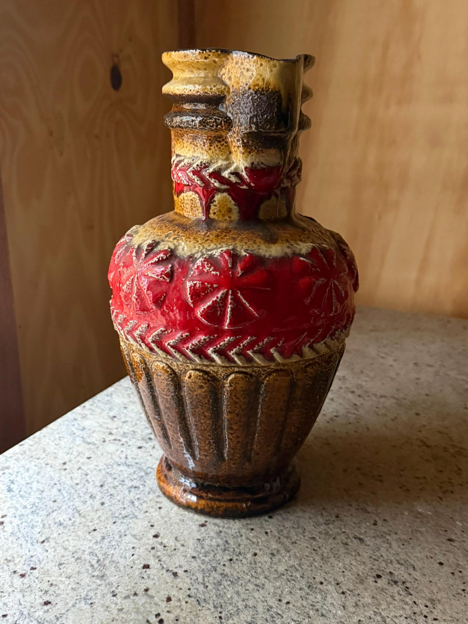 Add a touch of mid-century modern charm to your space with this stunning vintage floor vase by Bay Keramik. Crafted in Western Germany during the 1960s, this vase features bold, warm tones of red, brown, and yellow that evoke the vibrant design trends of the era. Its striking color palette and sleek shape make it an eye-catching statement piece for your home or office.