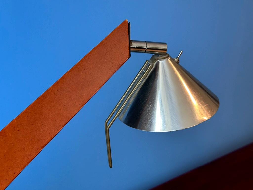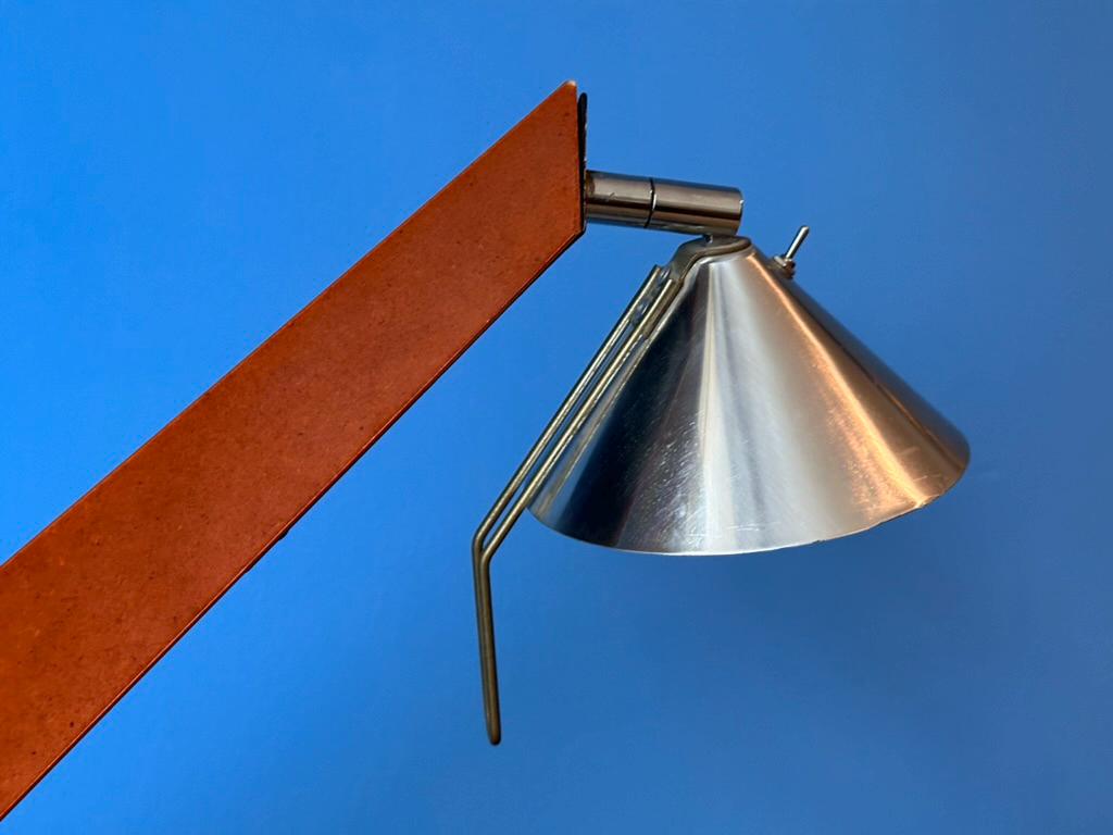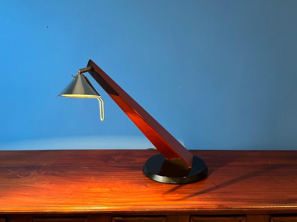 Add a touch of Scandinavian postmodern style to your space with this rare Epilog desk lamp by Tord Bjorklund for IKEA (1993). Crafted with black and brown laminated wood and a metal adjustable lampshade, it features a sleek design and a convenient on/off switch on top. A functional vintage collector's piece in good condition with minor signs of wear (see pictures).