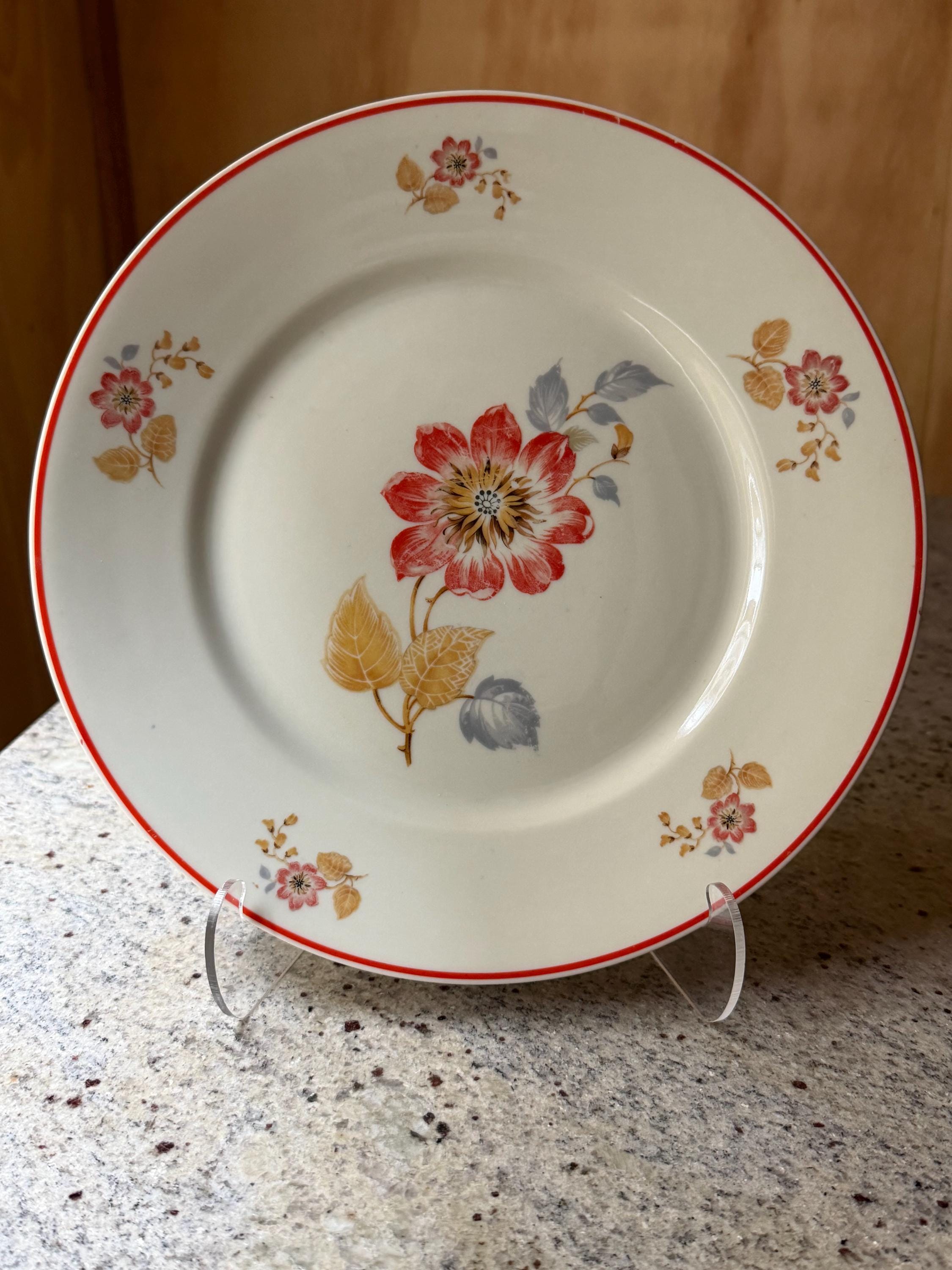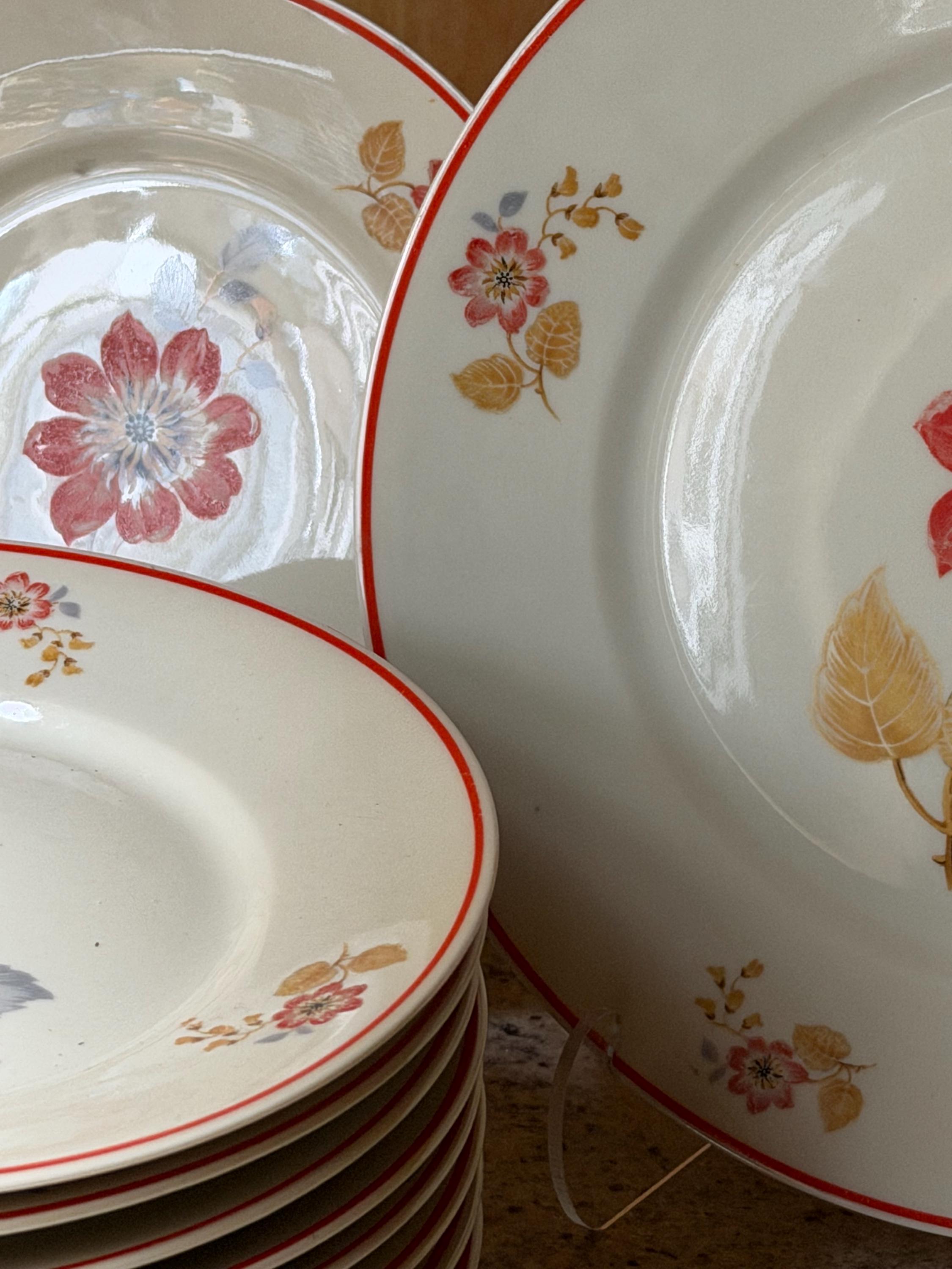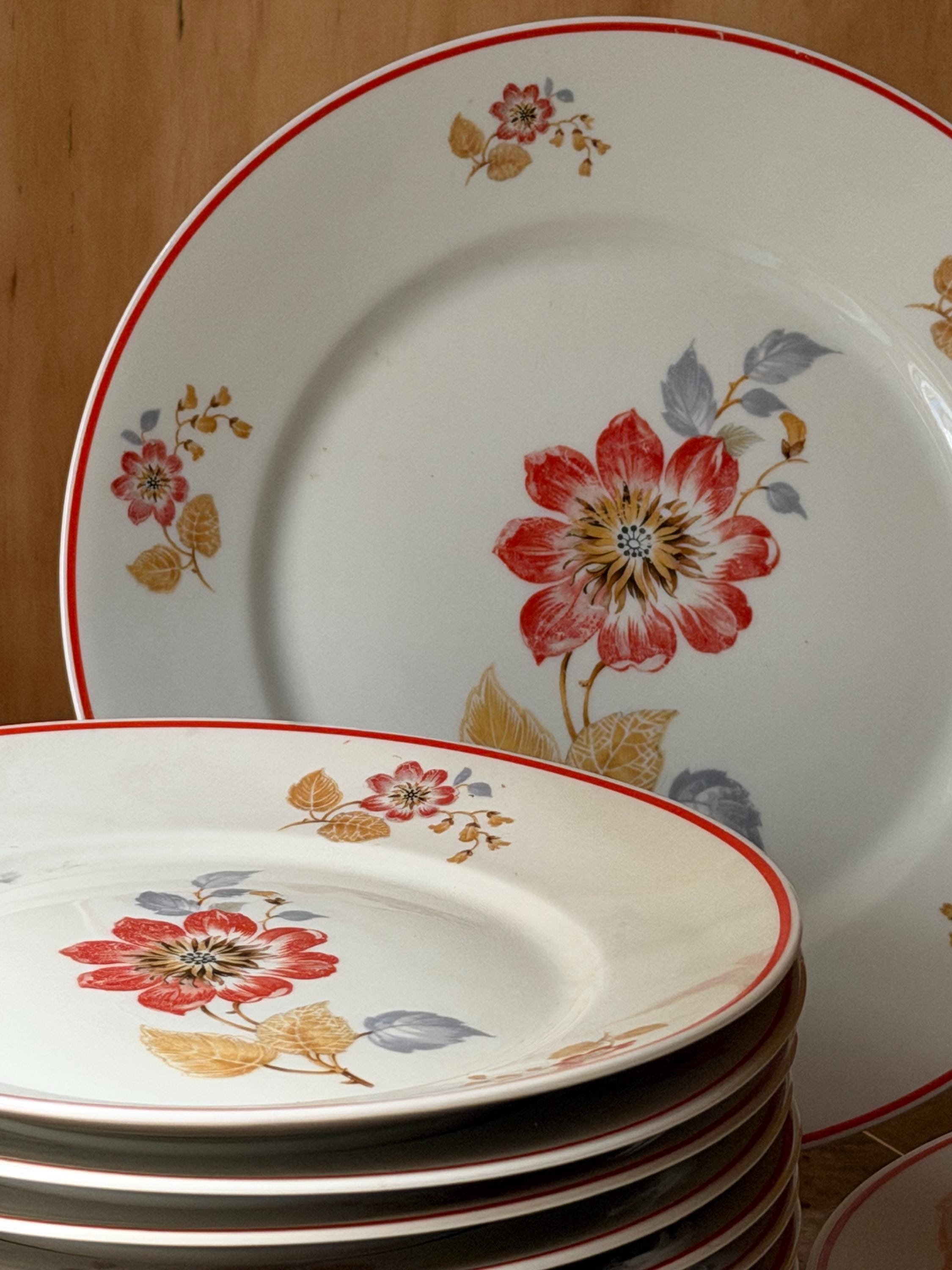 Each plate features a large floral motif in warm shades of red, yellow, and grey-blue, framed by a fine red rim.