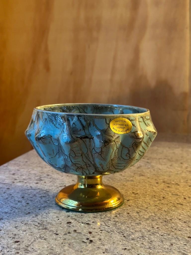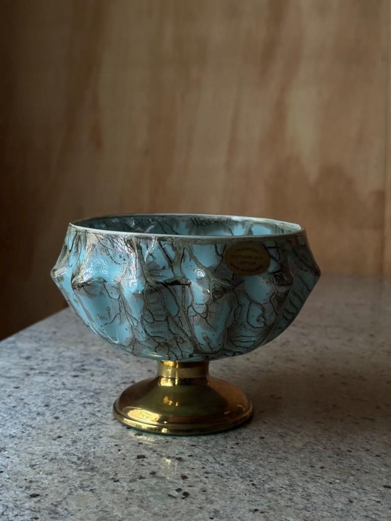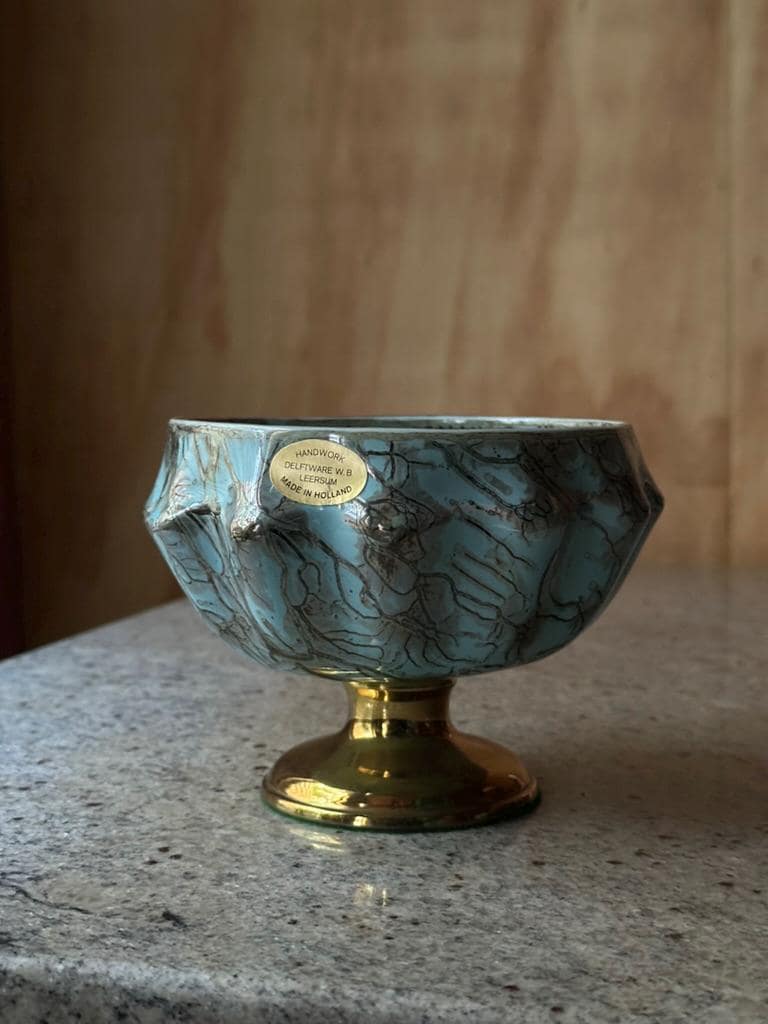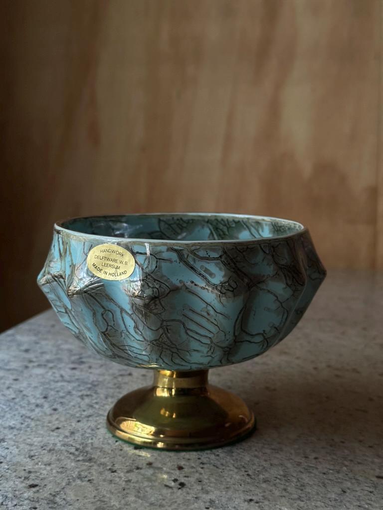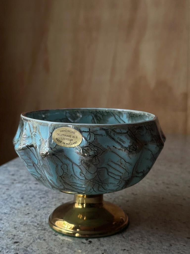 A striking example of Dutch studio Delftware, this pedestal bowl was hand-crafted by W.B. Leersum in the Netherlands and still retains its original maker’s label: