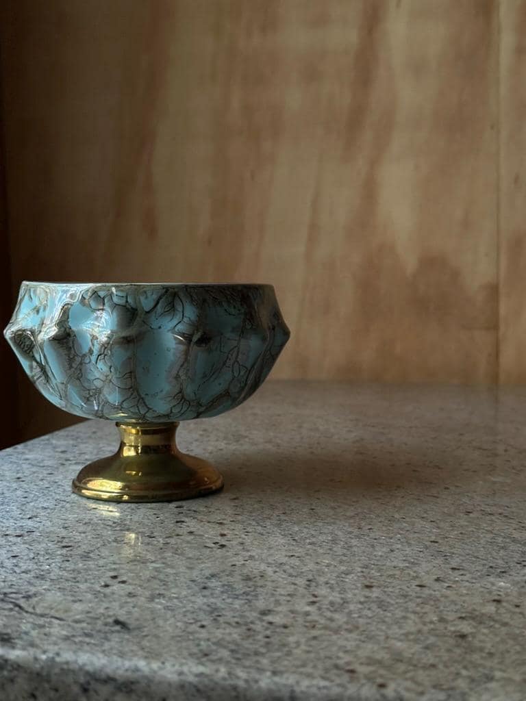 This piece stands on an elegant gilt pedestal base, supporting a sculptural bowl in soft robin-egg blue, finished with an expressive crackle glaze and raised organic relief.