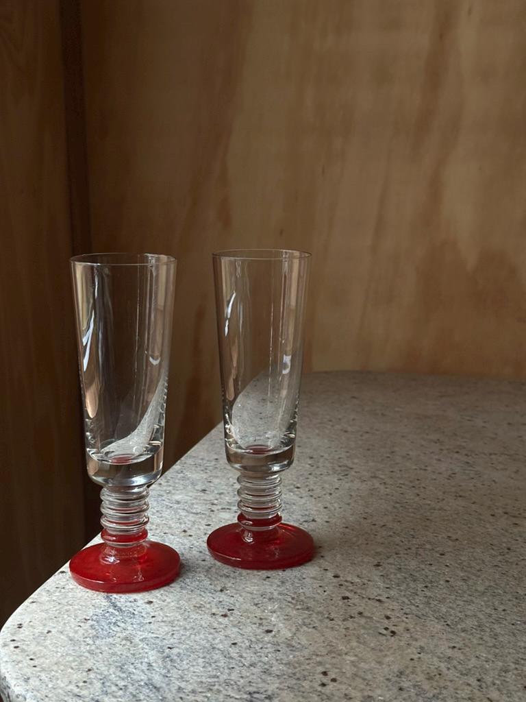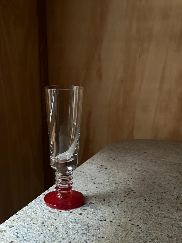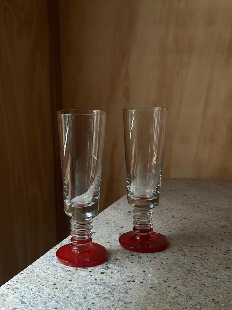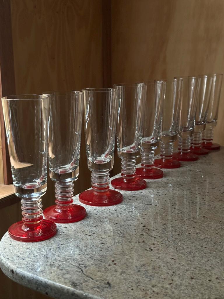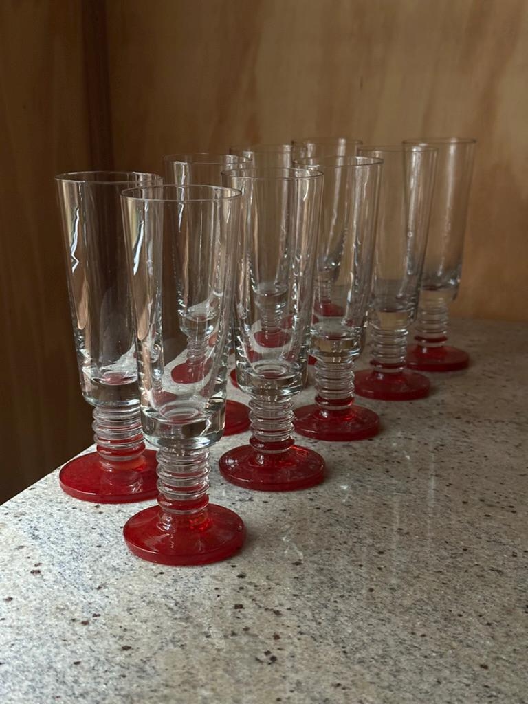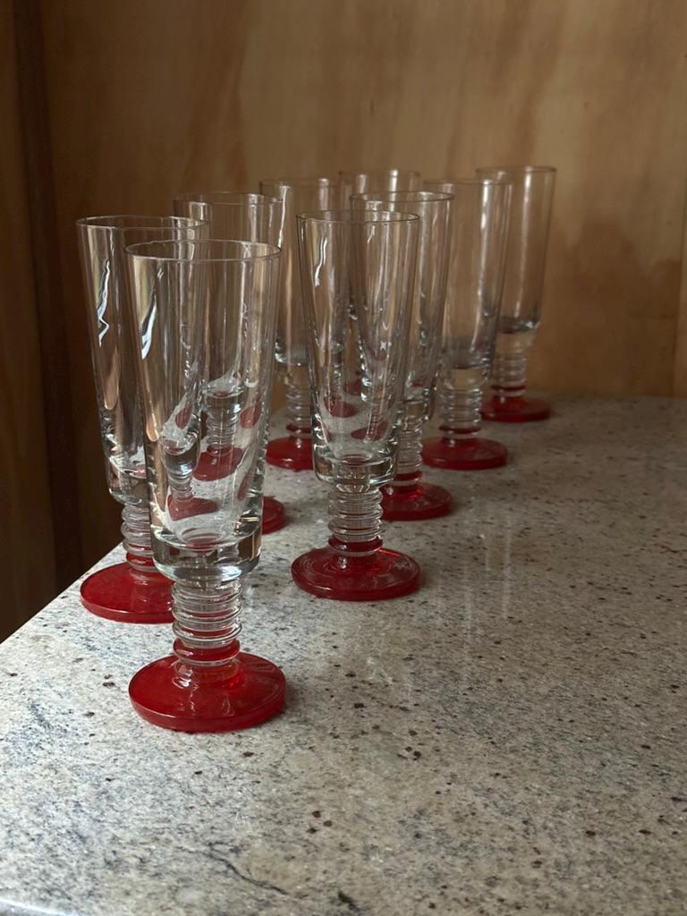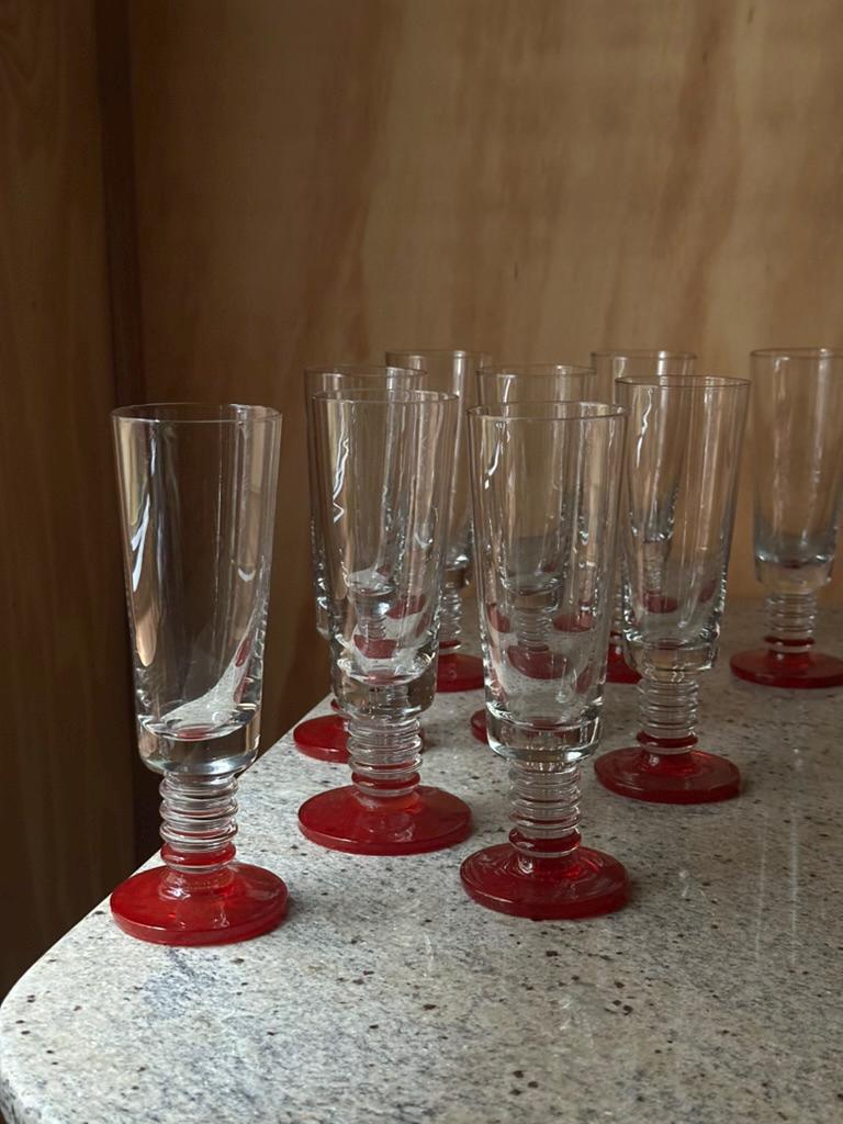 Vintage Hand-Blown Champagne Flutes – Set of 9, Red Base Modernist Barware