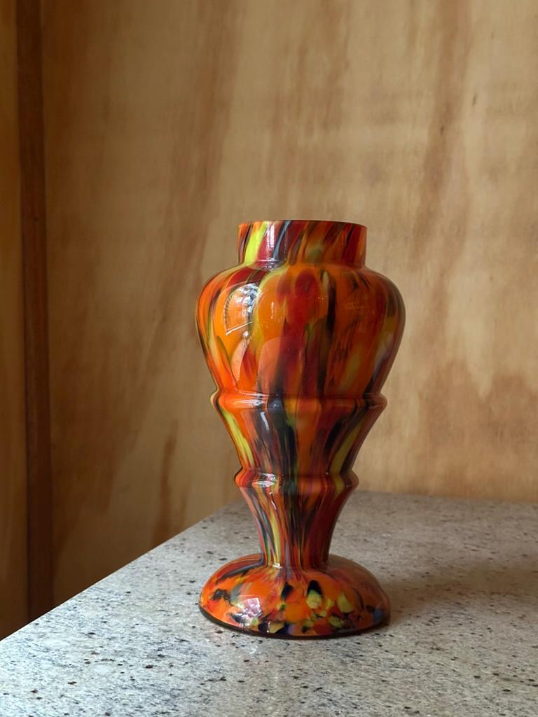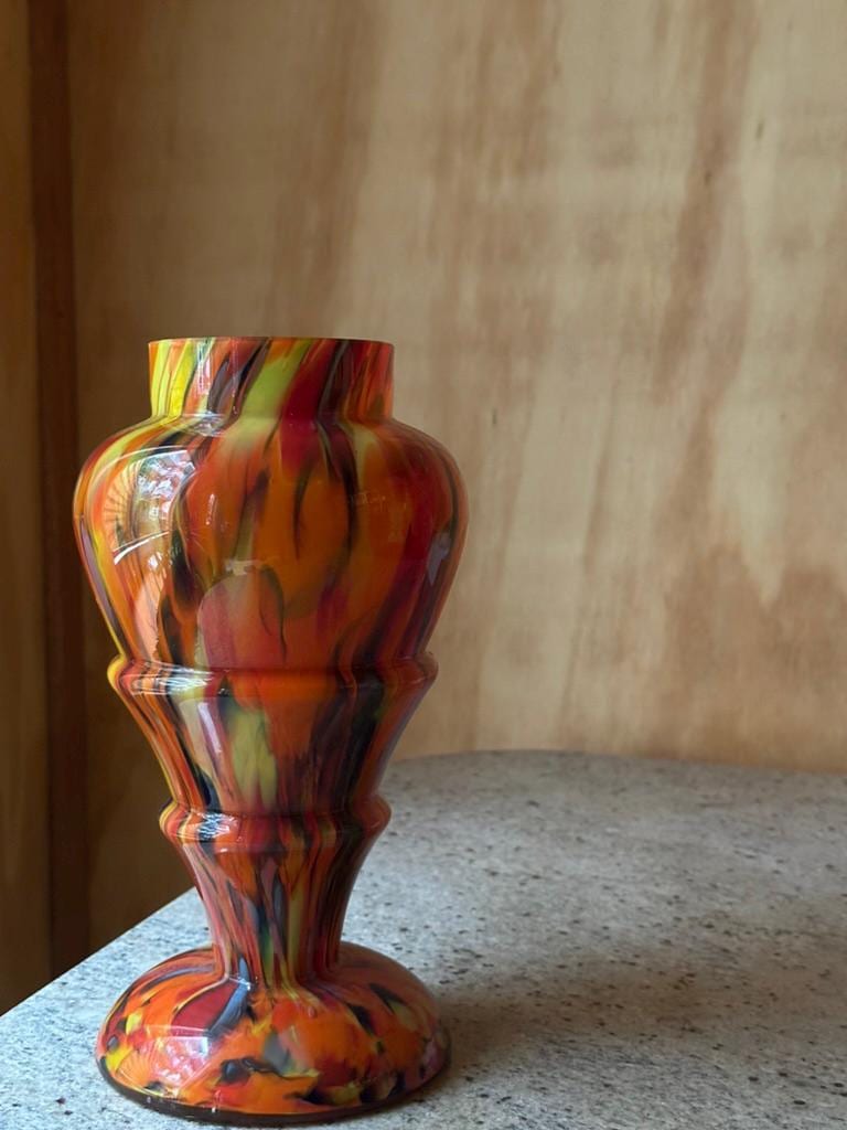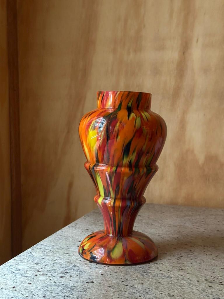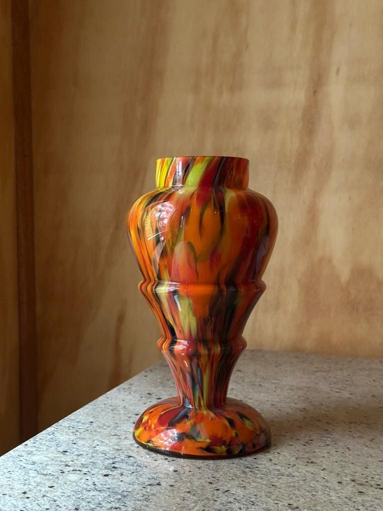 Crafted on a warm dark amber base, this vase incorporates molten glass remnants from previous work, resulting in a truly one-of-a-kind pattern.