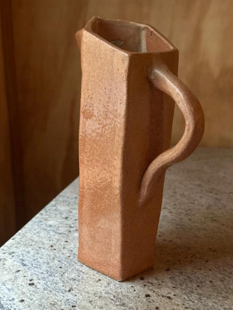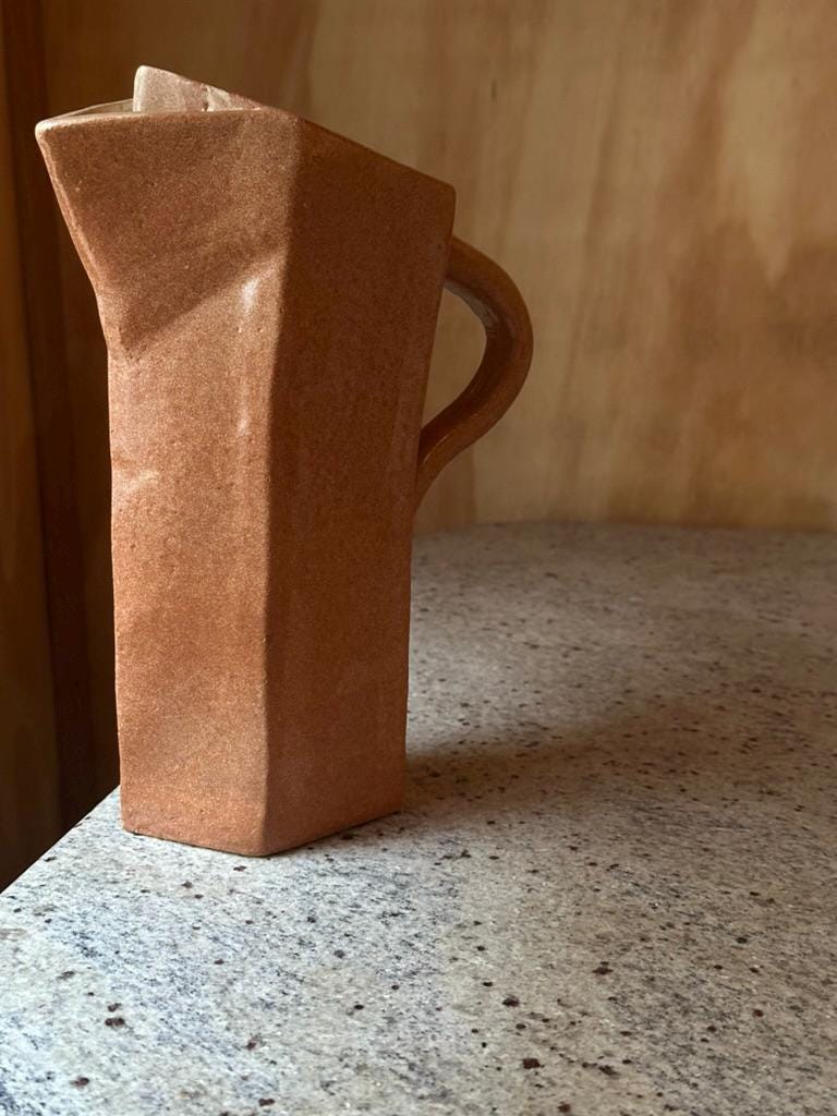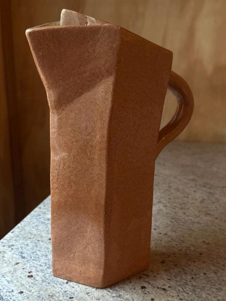 Hand-built from stoneware clay, its angular silhouette feels like folded paper turned to earth: geometric, asymmetrical, and quietly confident. The warm terracotta surface has a matte, tactile character that beautifully catches light—subtle variations created by the firing process reveal the artist’s hand.