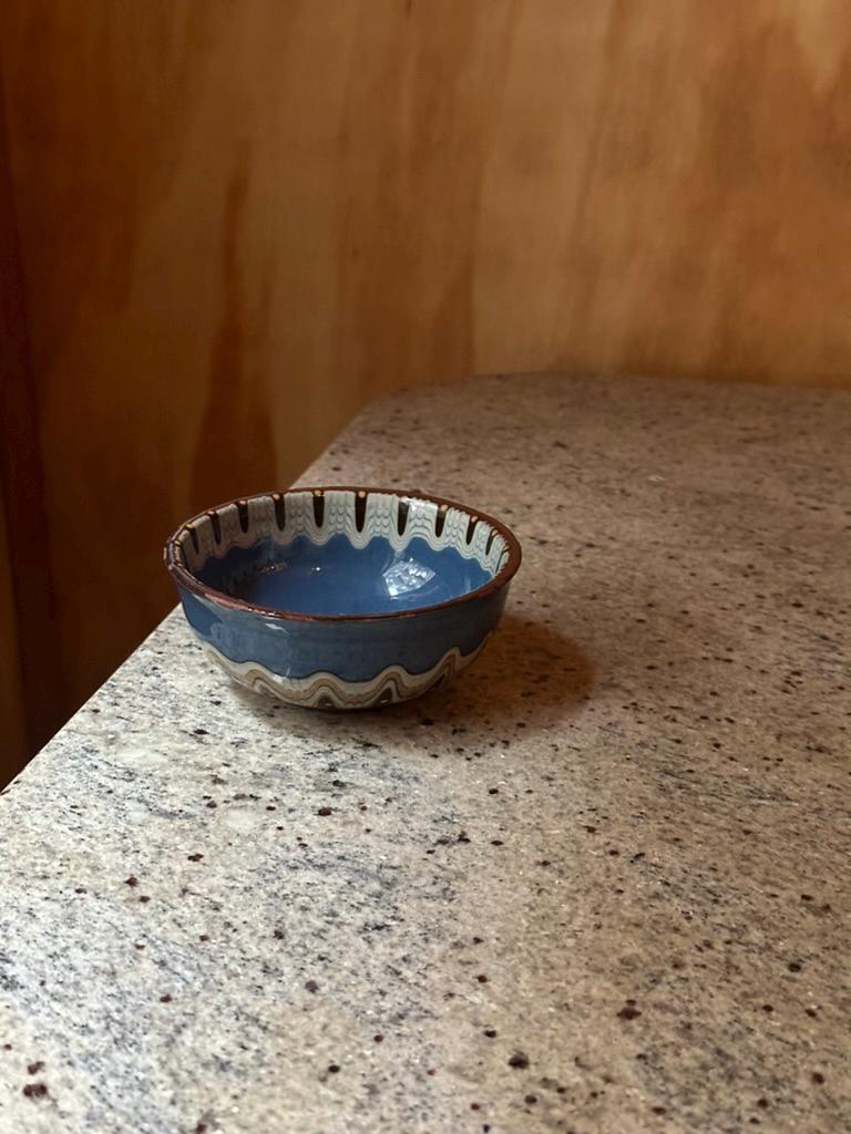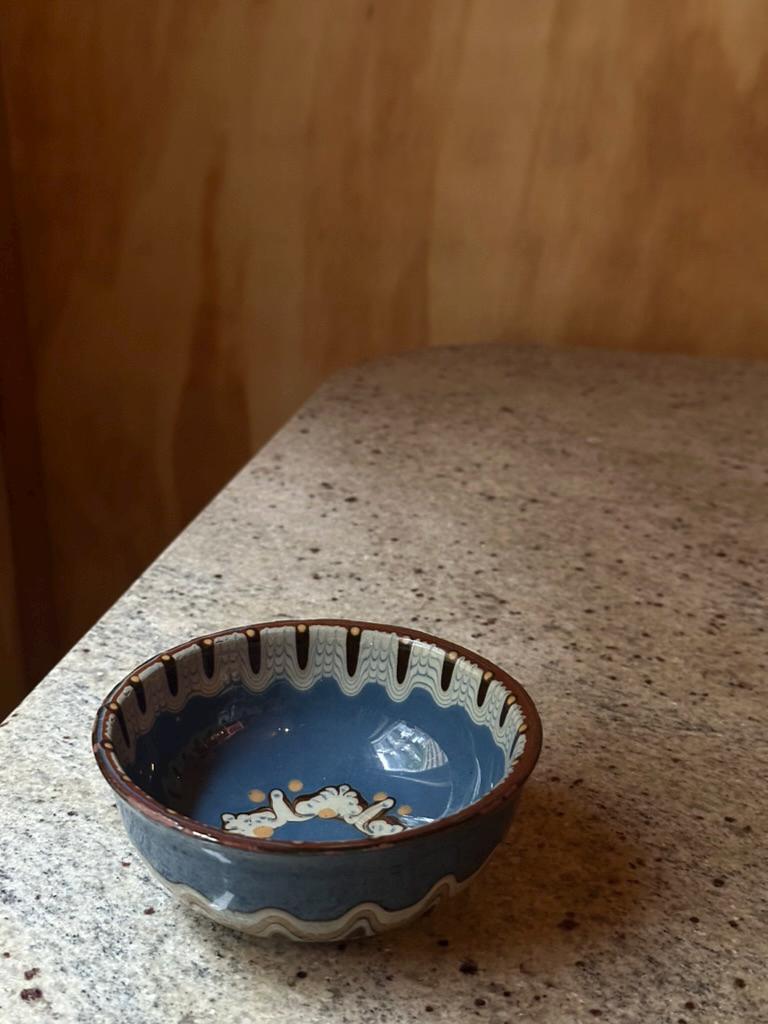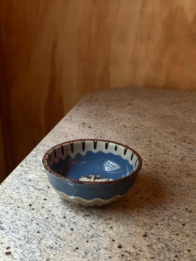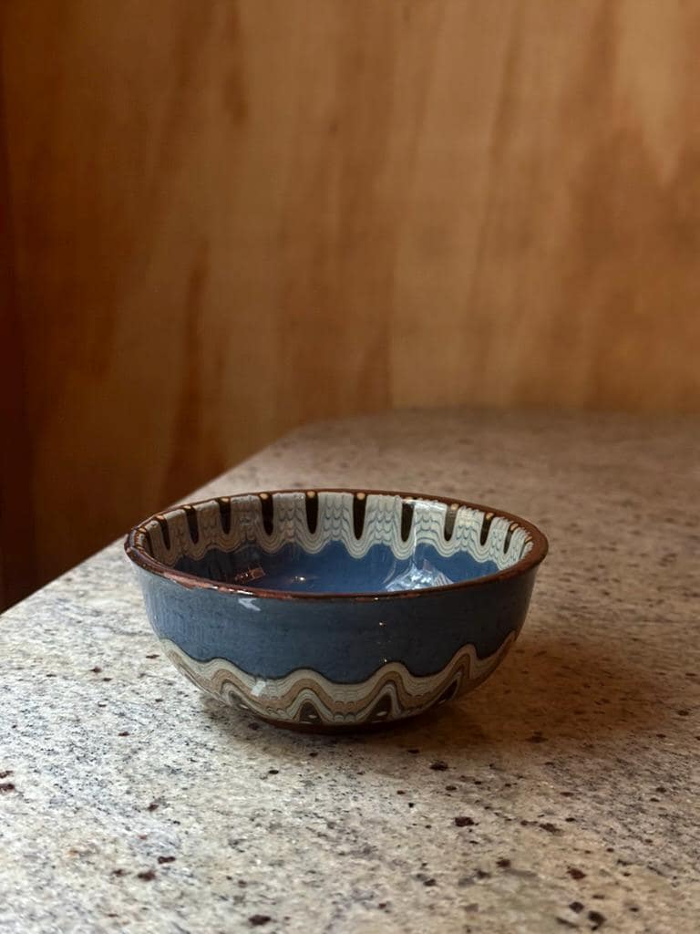 Its blue glaze carries the calm of twilight; the cream slip details dance like gentle waves around the rim.