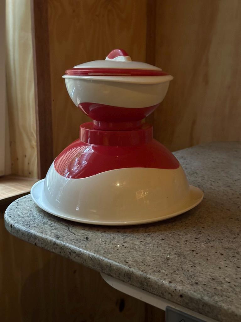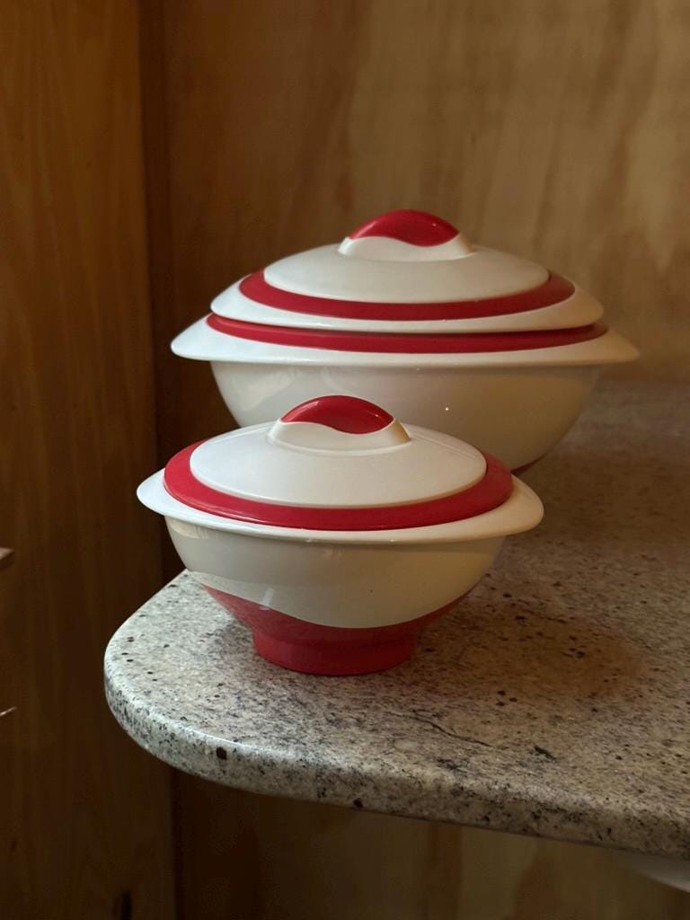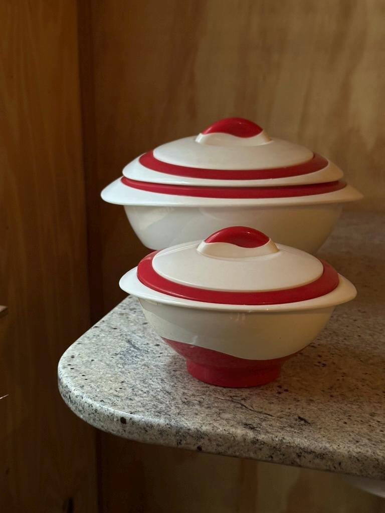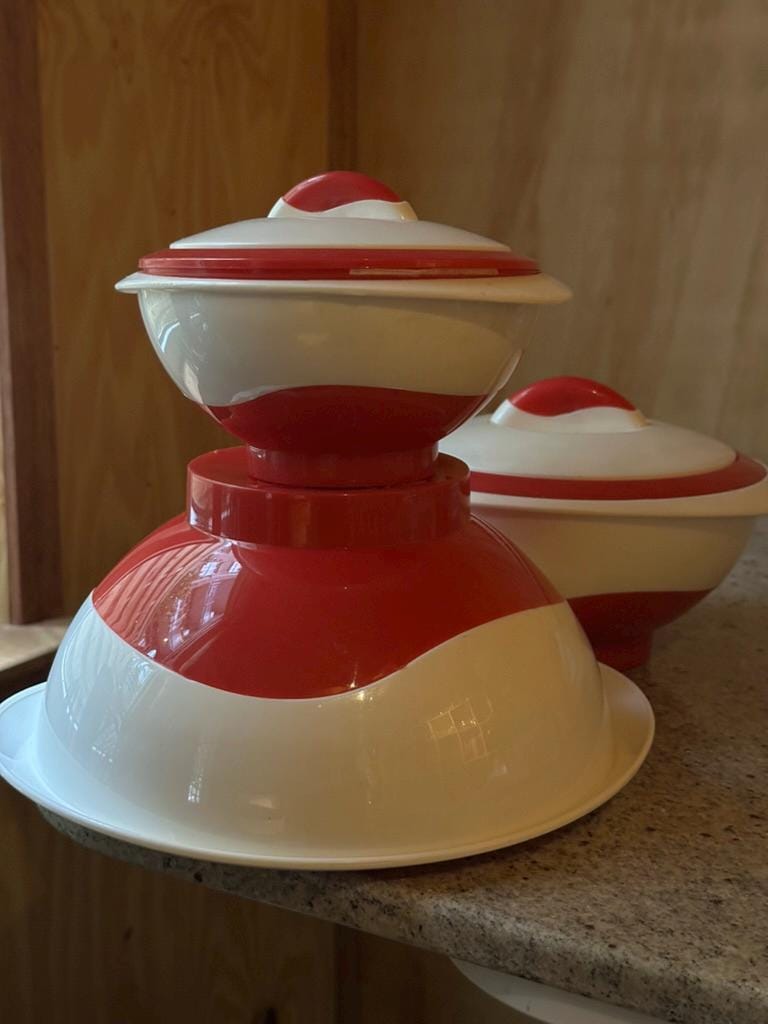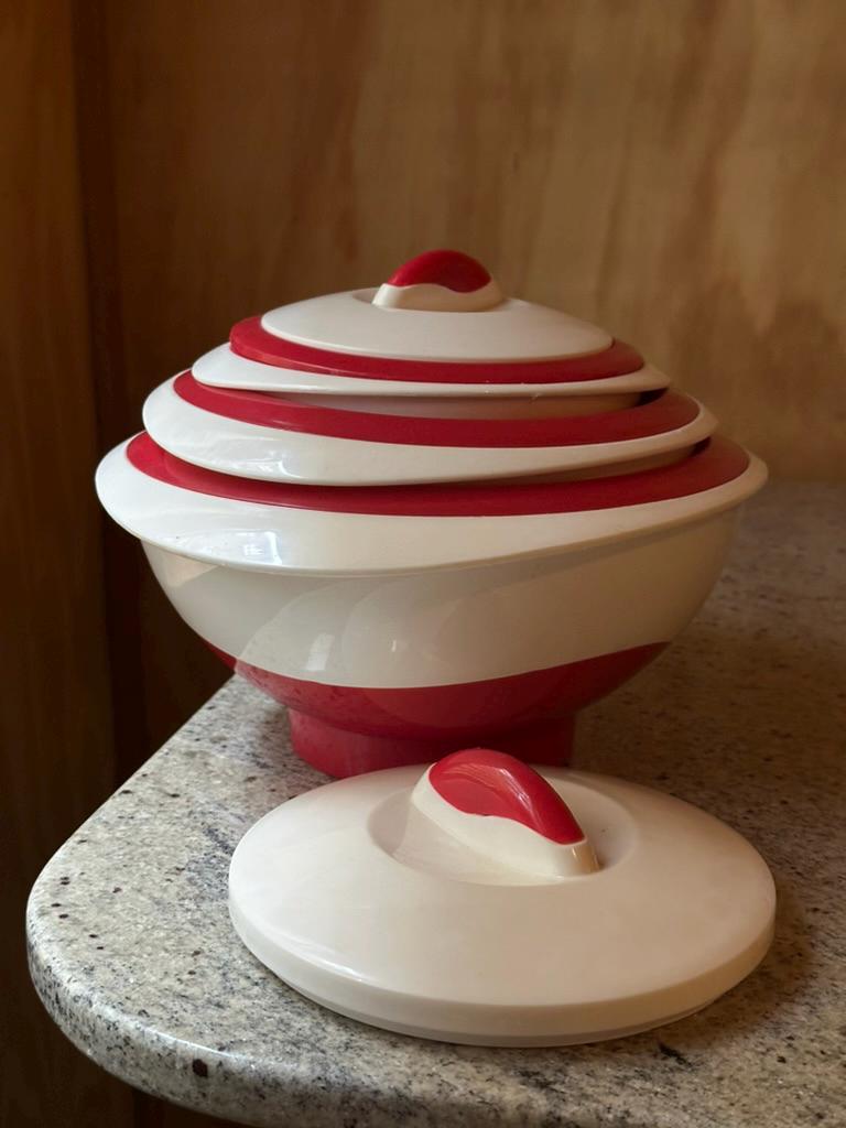 Bright, cheerful and practical — this vintage Cassetti Italy thermoware set brings playful 1970s style straight to the table. Designed in bold red and cream white with modern curved shapes, these insulated bowls keep food warm longer and add a nostalgic pop of color to everyday meals, picnics, or festive gatherings.