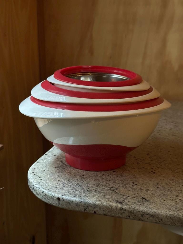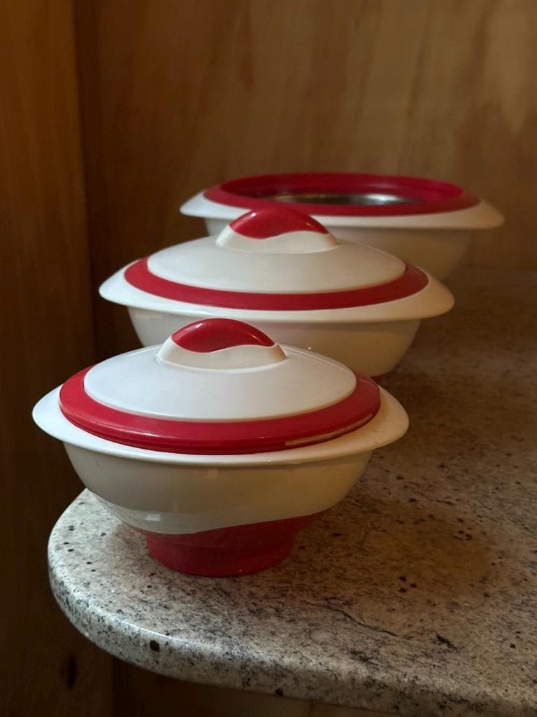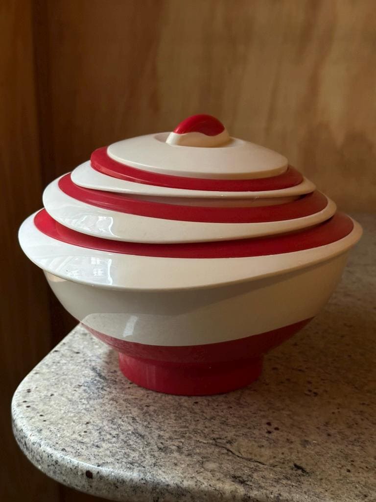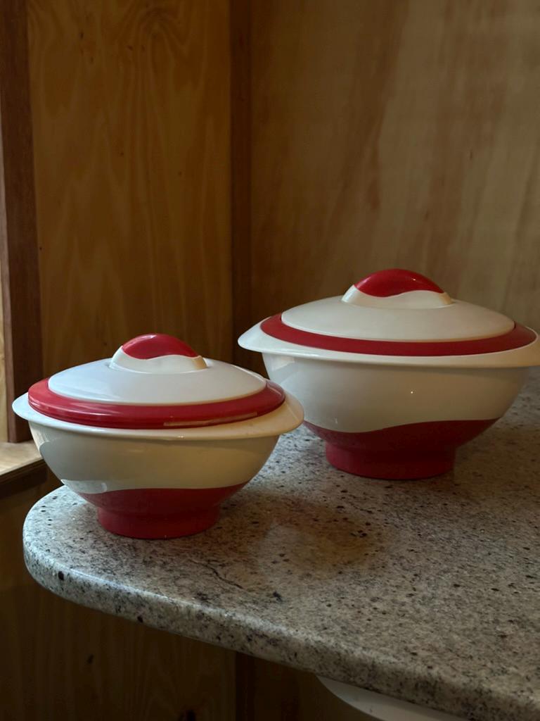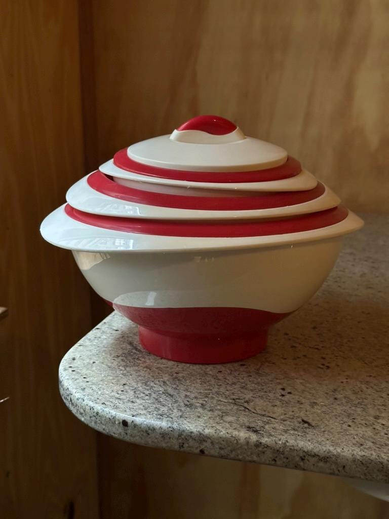 Bright, cheerful and practical — this vintage Cassetti Italy thermoware set brings playful 1970s style straight to the table. Designed in bold red and cream white with modern curved shapes, these insulated bowls keep food warm longer and add a nostalgic pop of color to everyday meals, picnics, or festive gatherings.