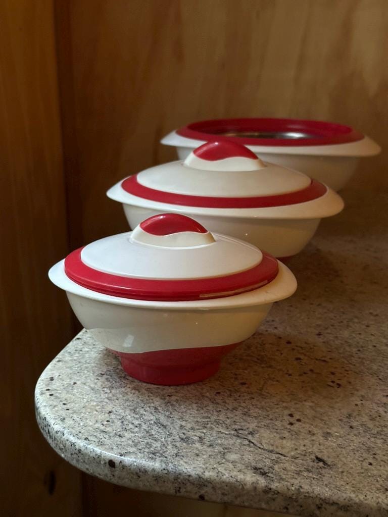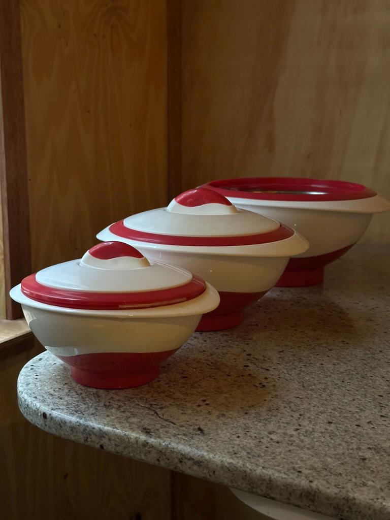Cassetti Italy Thermoware Set (3) • Red & White Insulated Serving Bowls • Vintage Mid-Century Kitchen • Two Lids