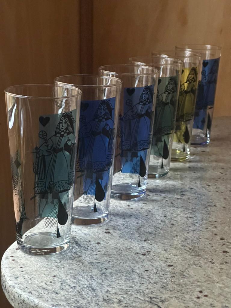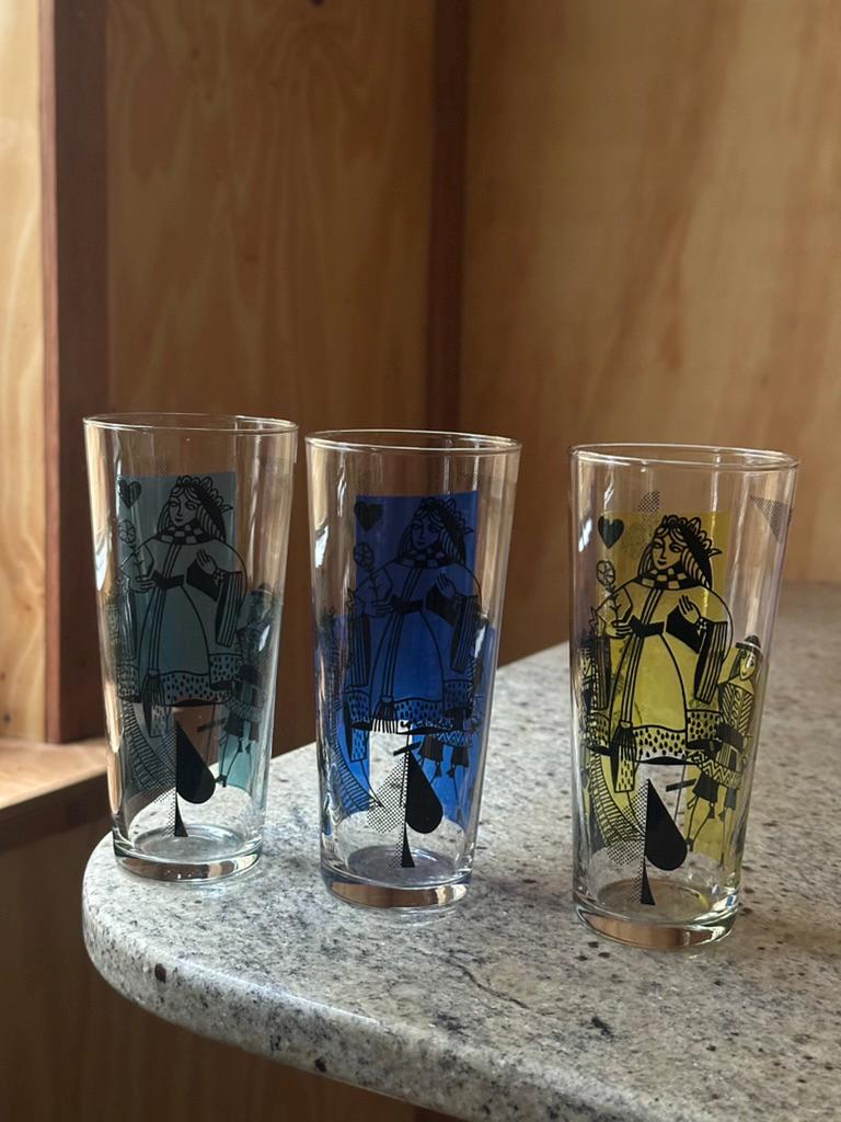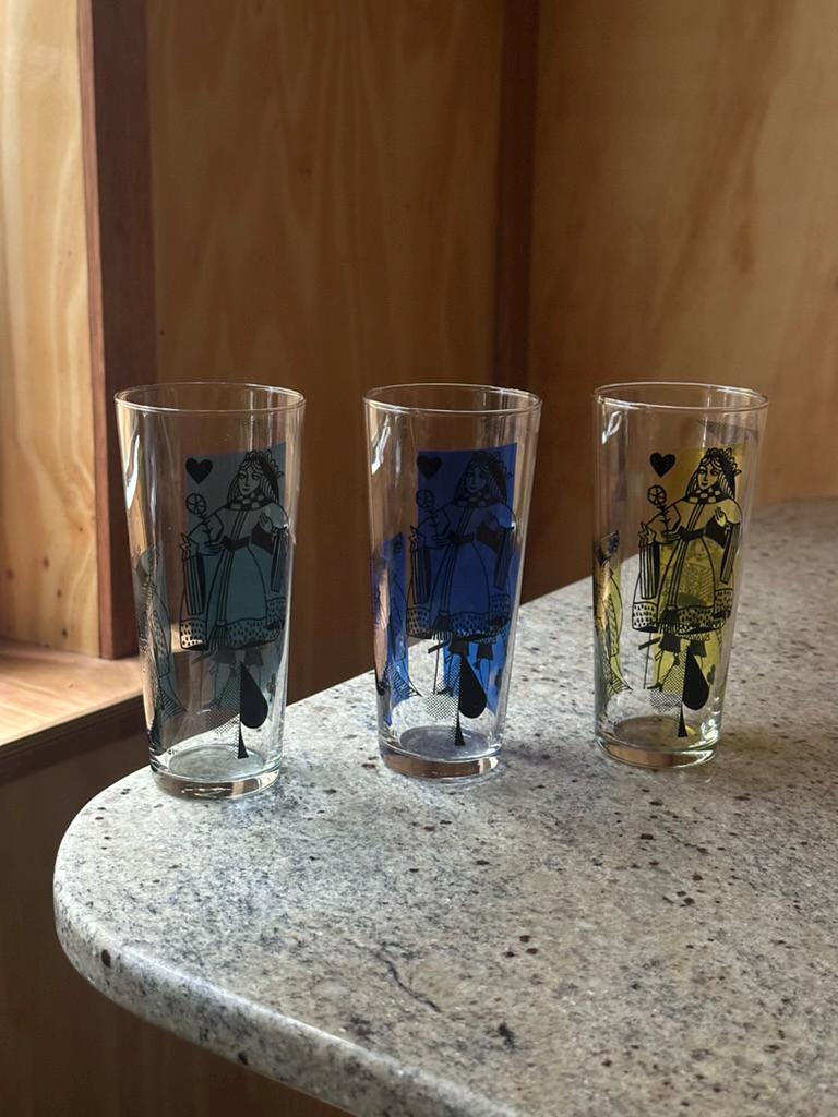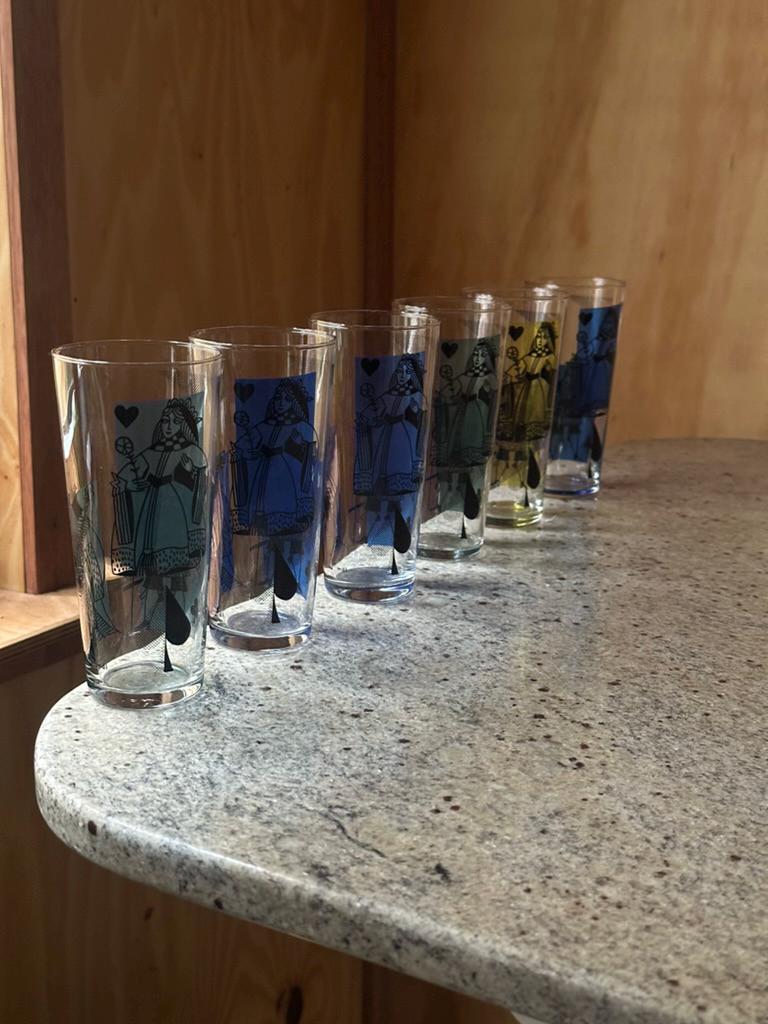 Mid-century inspired, retro barware, Queen of Hearts / Spades motif, colorful glass set.