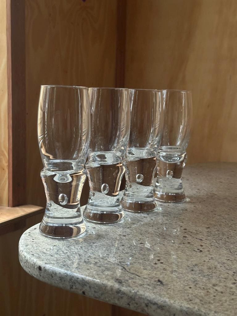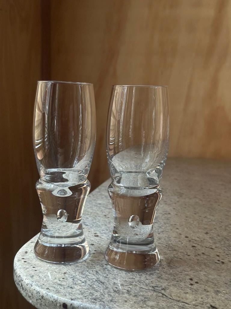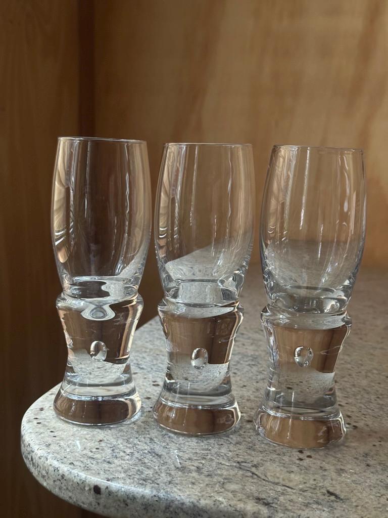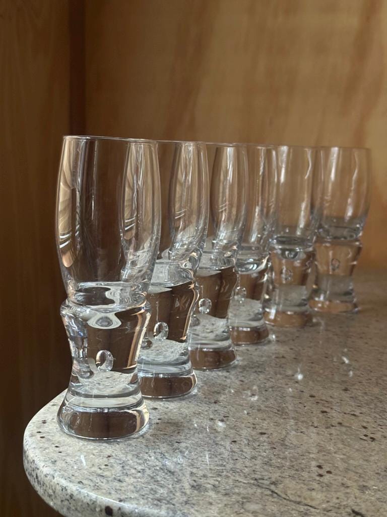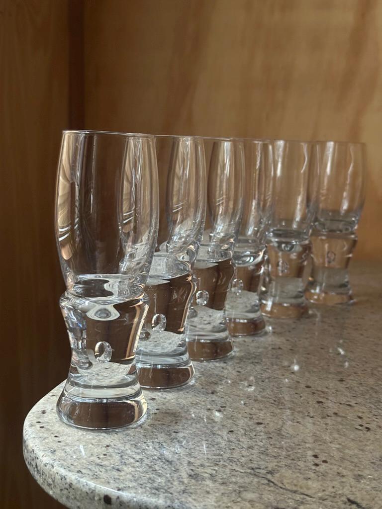 Elegant set of Italian art glass liqueur glasses, crafted in a Murano-style design featuring tall clear bowls and sculptural solid bases with internal bubble inclusions. At 18 cm tall, these glasses have a striking silhouette and exceptional clarity, making them ideal for schnapps, digestifs, aperitifs, limoncello, or decorative display.