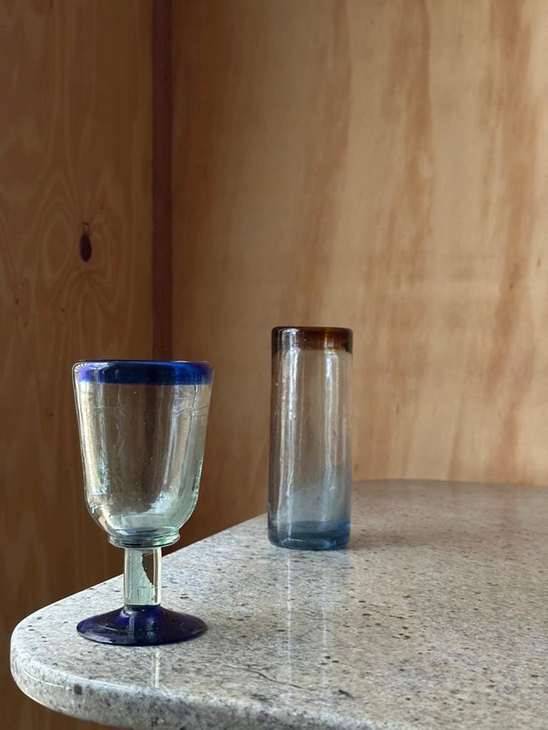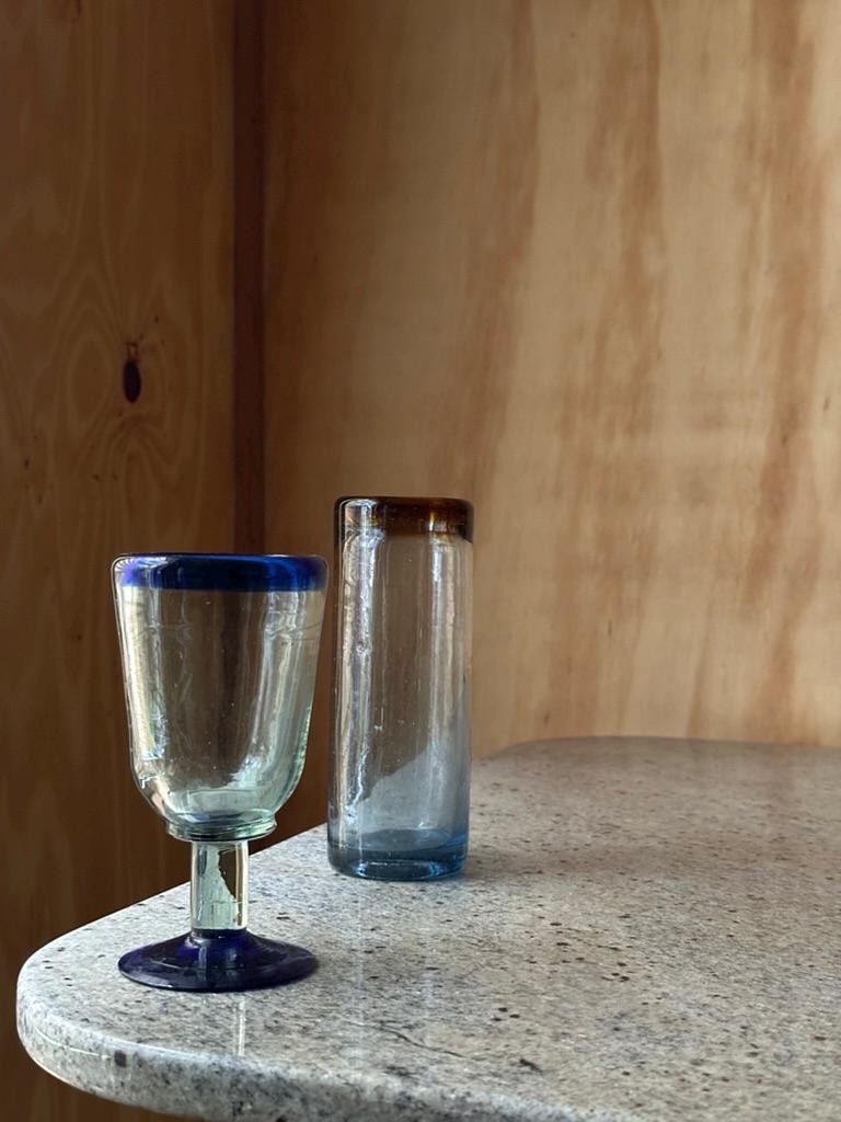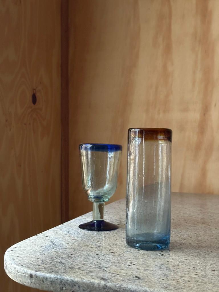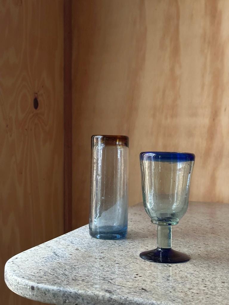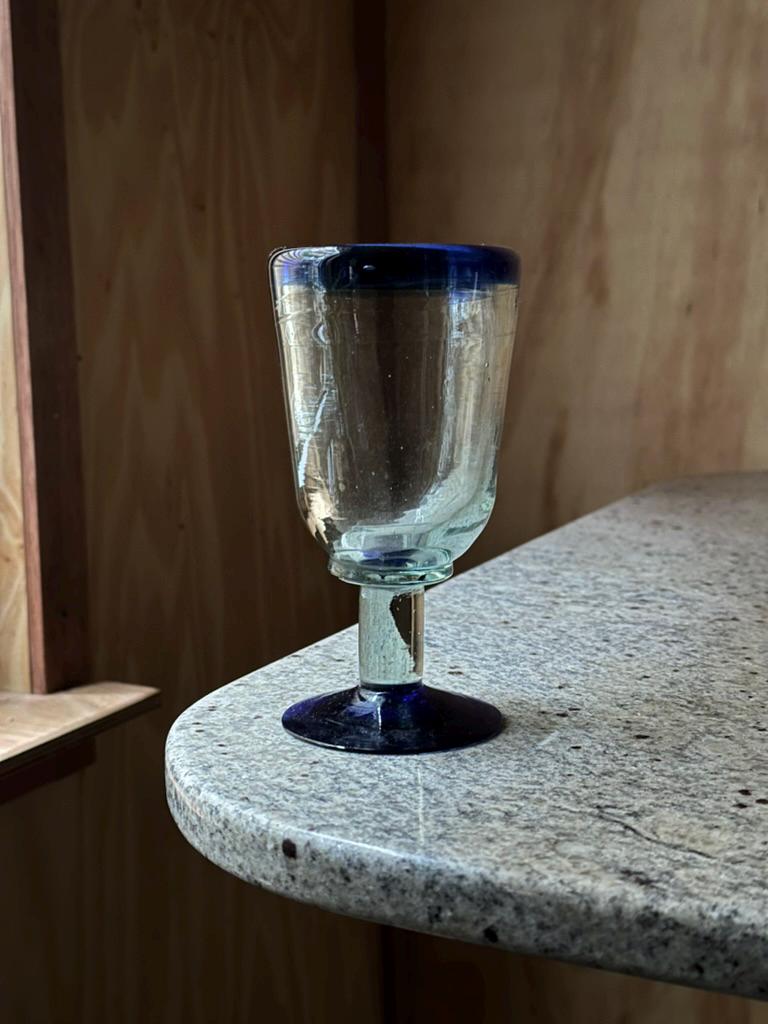The goblet is crafted in transparent glass with a striking cobalt-blue rim and matching blue foot. The stem shows slight irregularities from hand forming, giving it an authentic studio feel. This piece works beautifully as a decorative goblet, small chalice, or accent display piece.