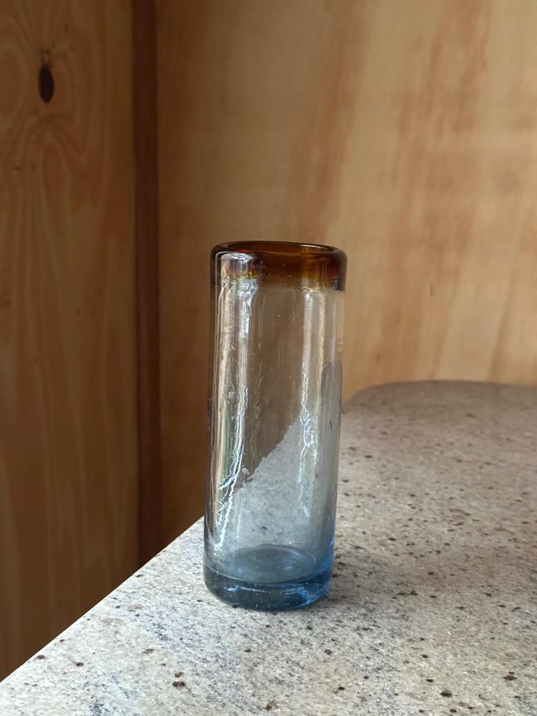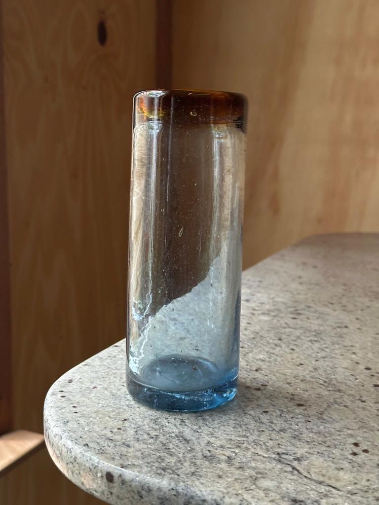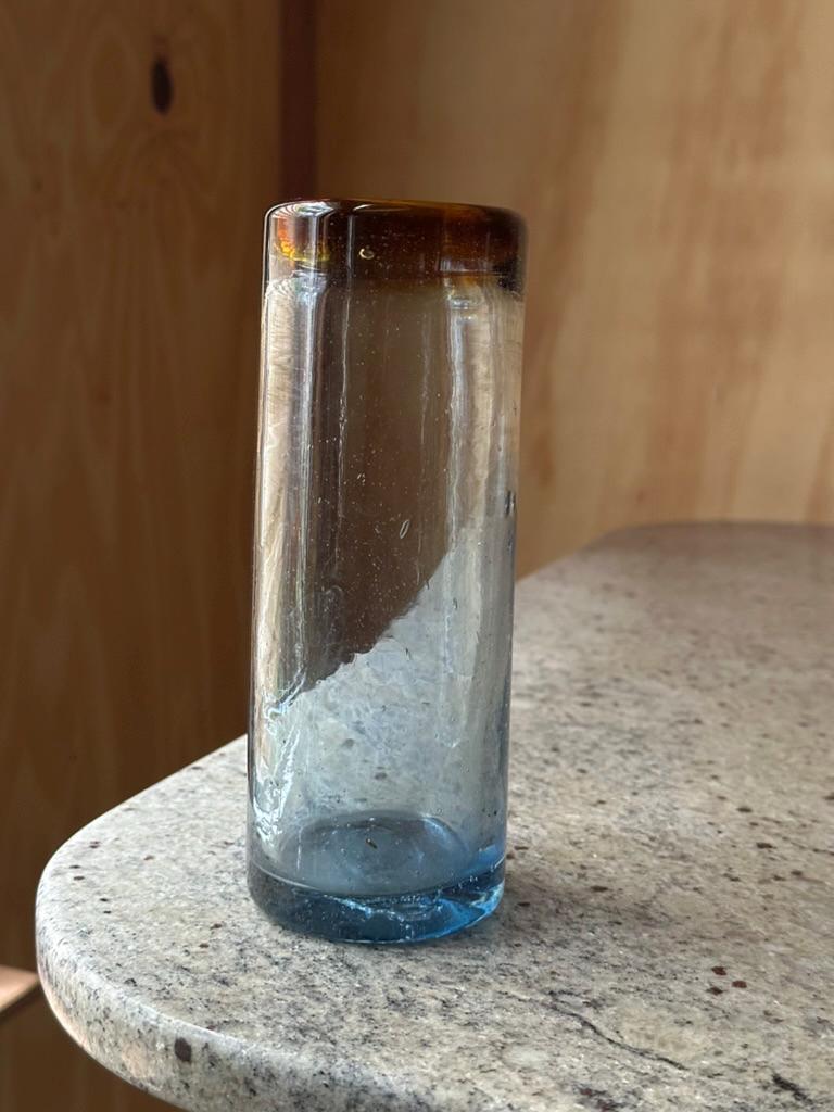 The bud vase features a warm brown rim that fades softly into clear glass and transitions to a blue-tinted base. This gradient finish is reminiscent of Italian mid-century Empoli and Murano influences.