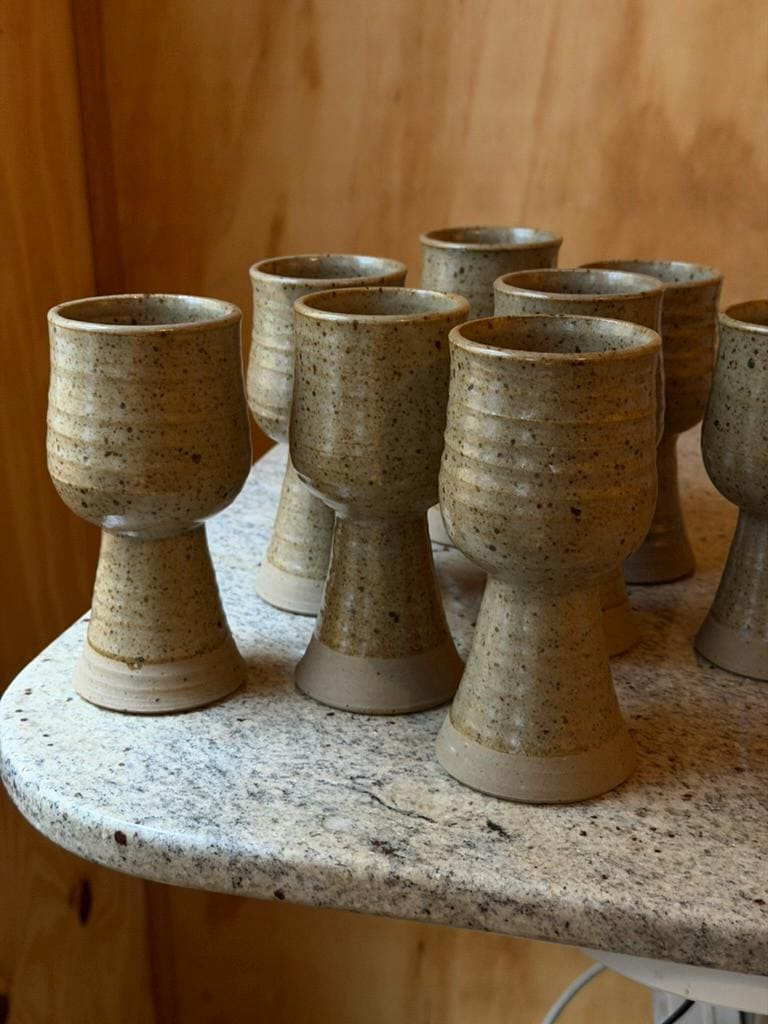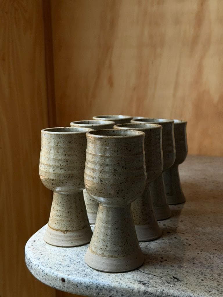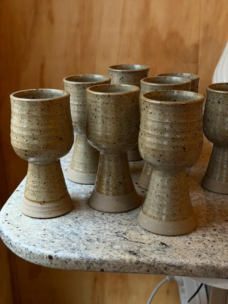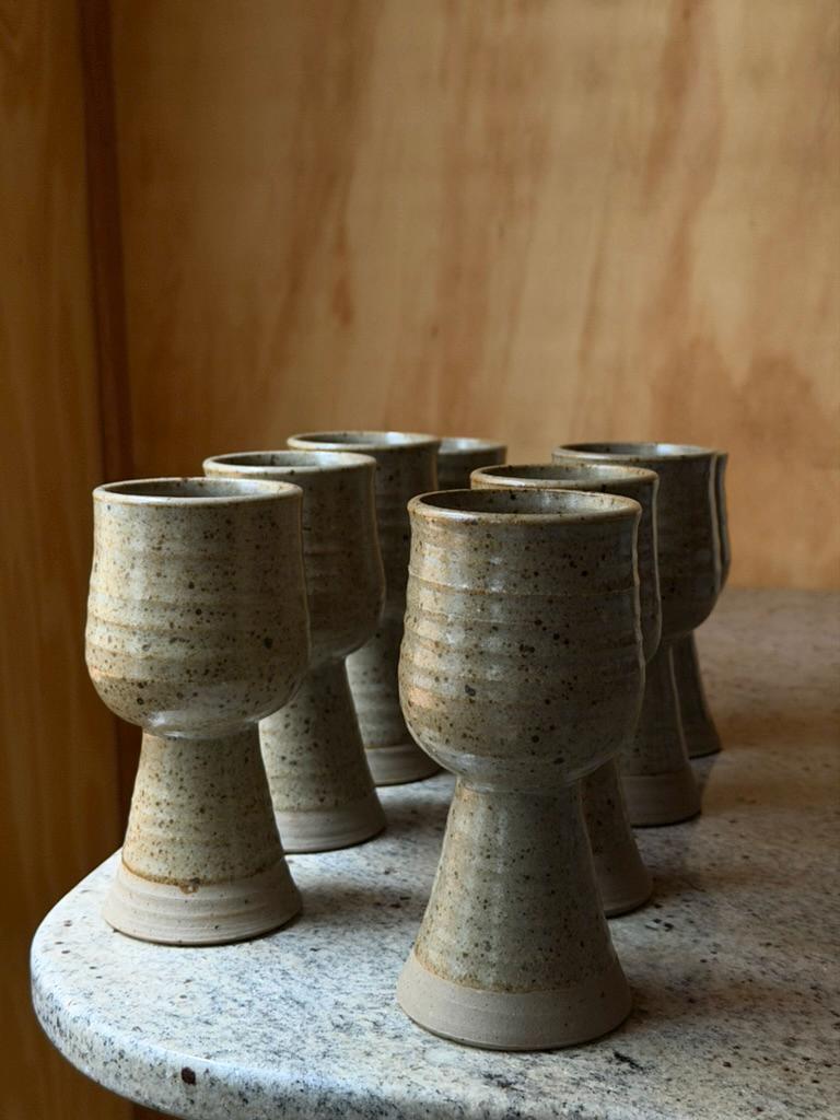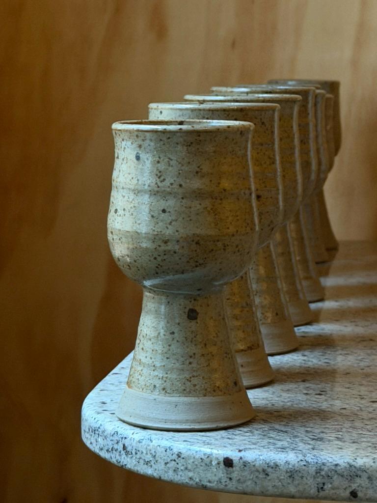 Minimal, earthy, and timeless. This set of eight handmade ceramic goblets is wheel-thrown from durable stoneware and finished with a natural speckled glaze. Designed for wine, water, or everyday use, they bring warmth and quiet character to the table.
