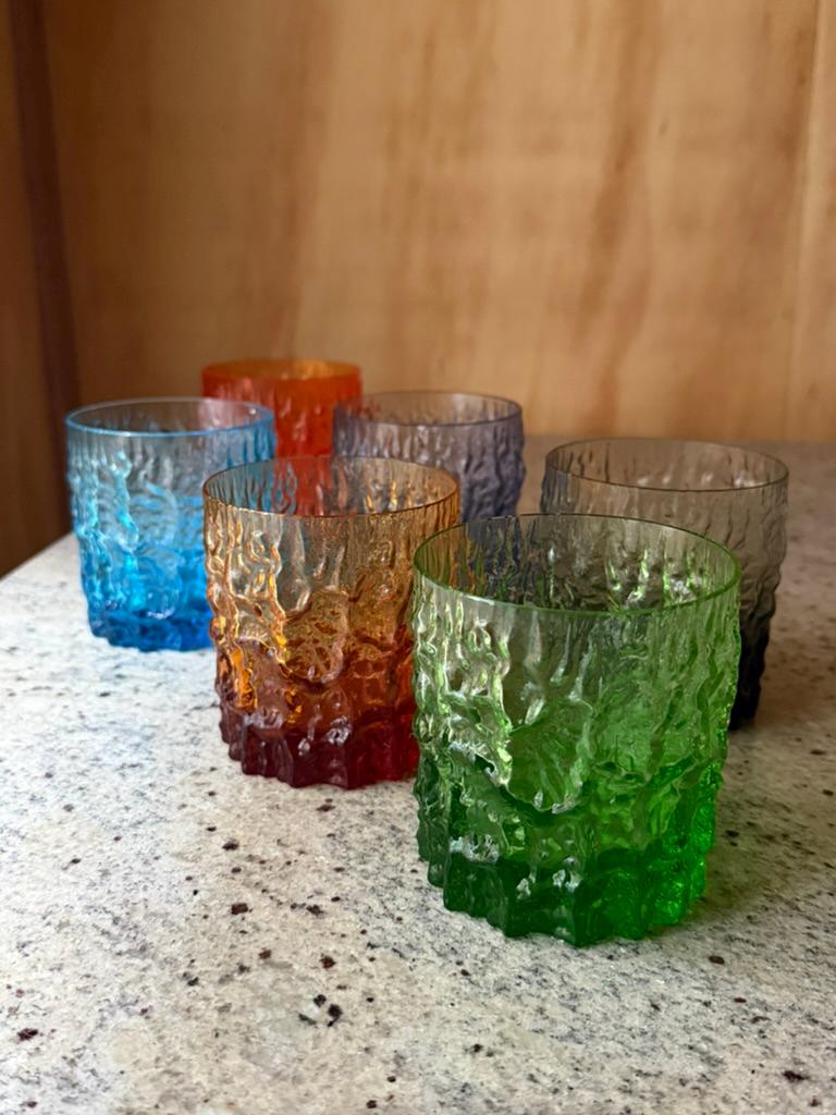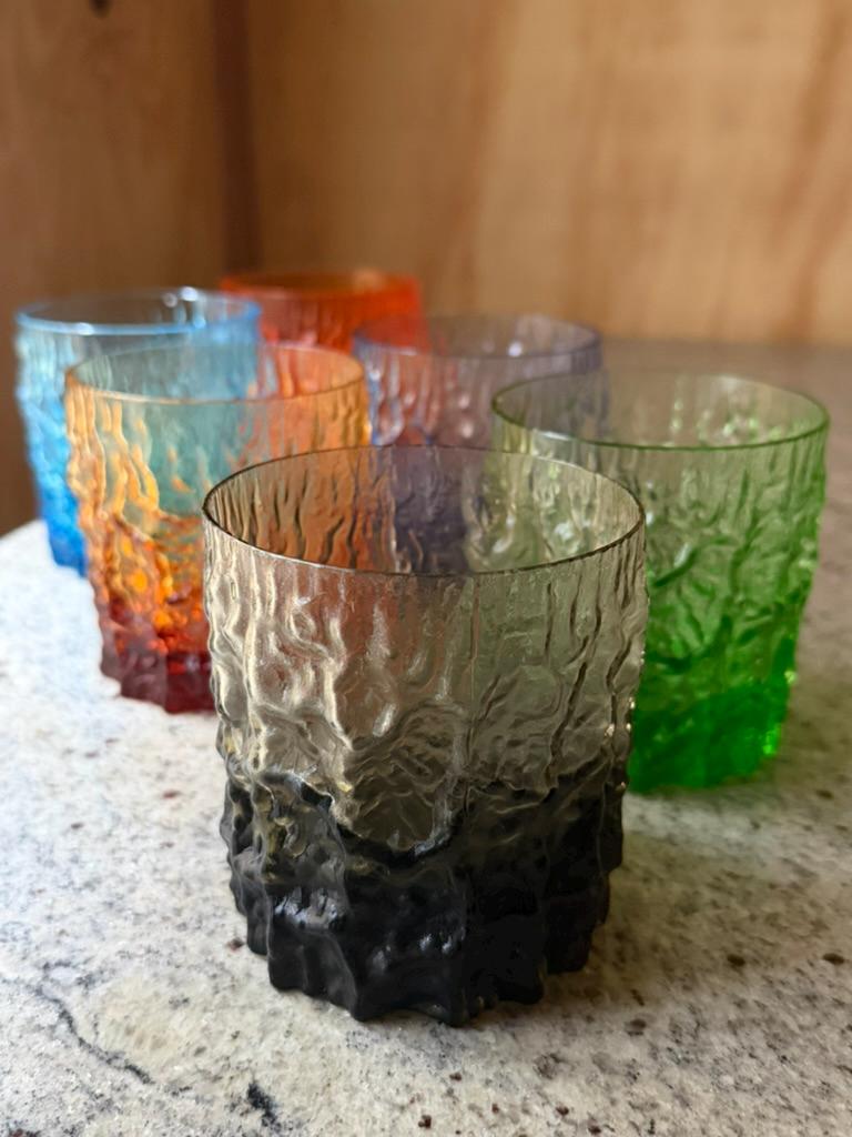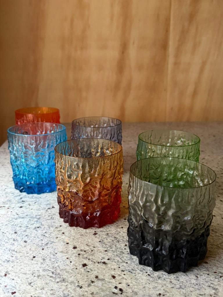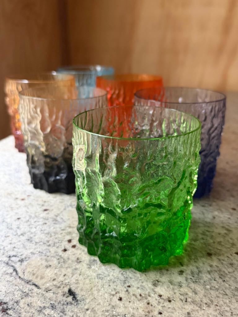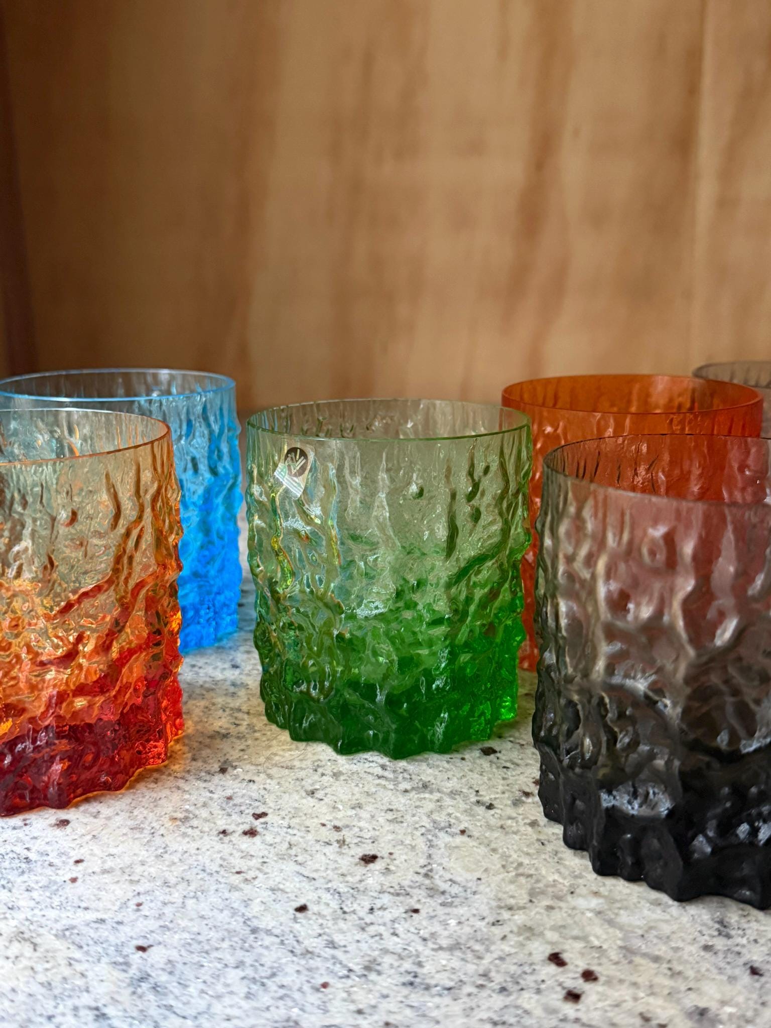 Six multicoloured rocks glasses in the 'Bark' texture in the style of Geoffrey Baxter (Whitefriars). Italy - Circa 1960's.
