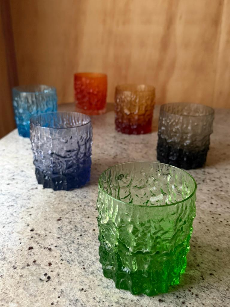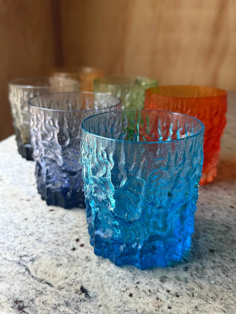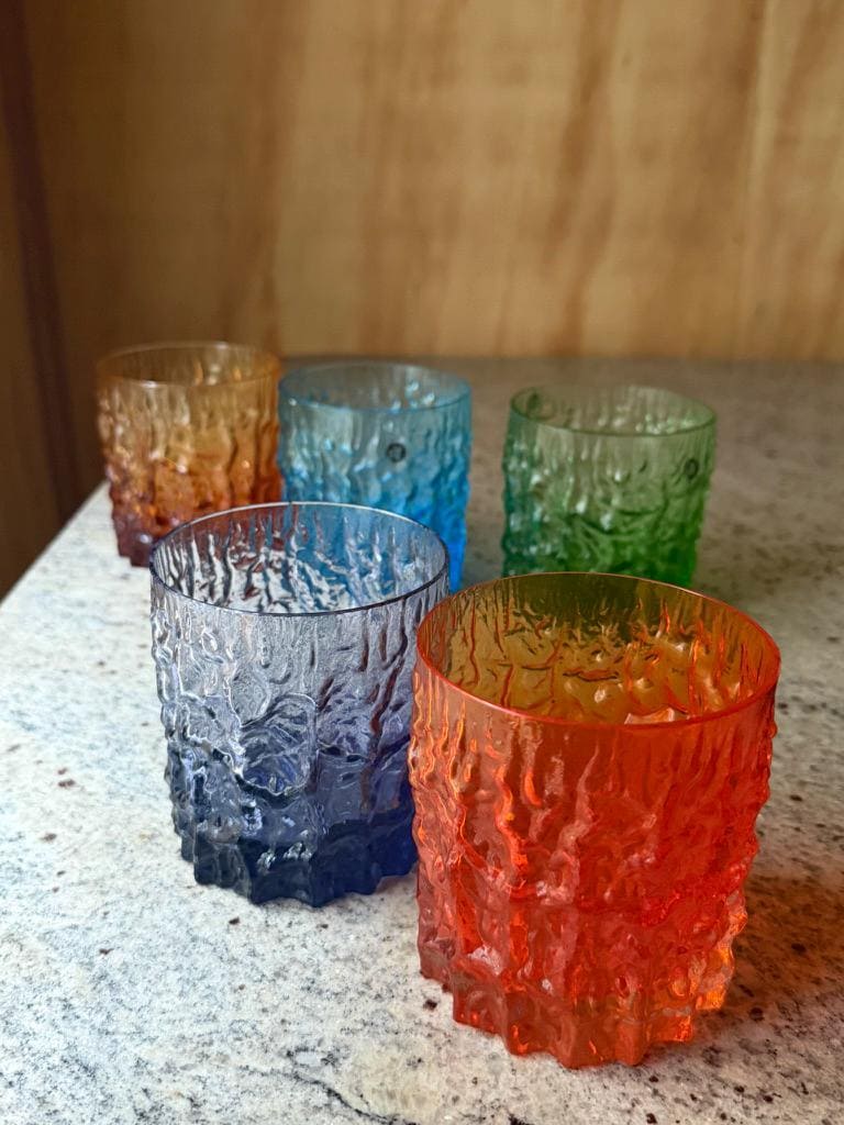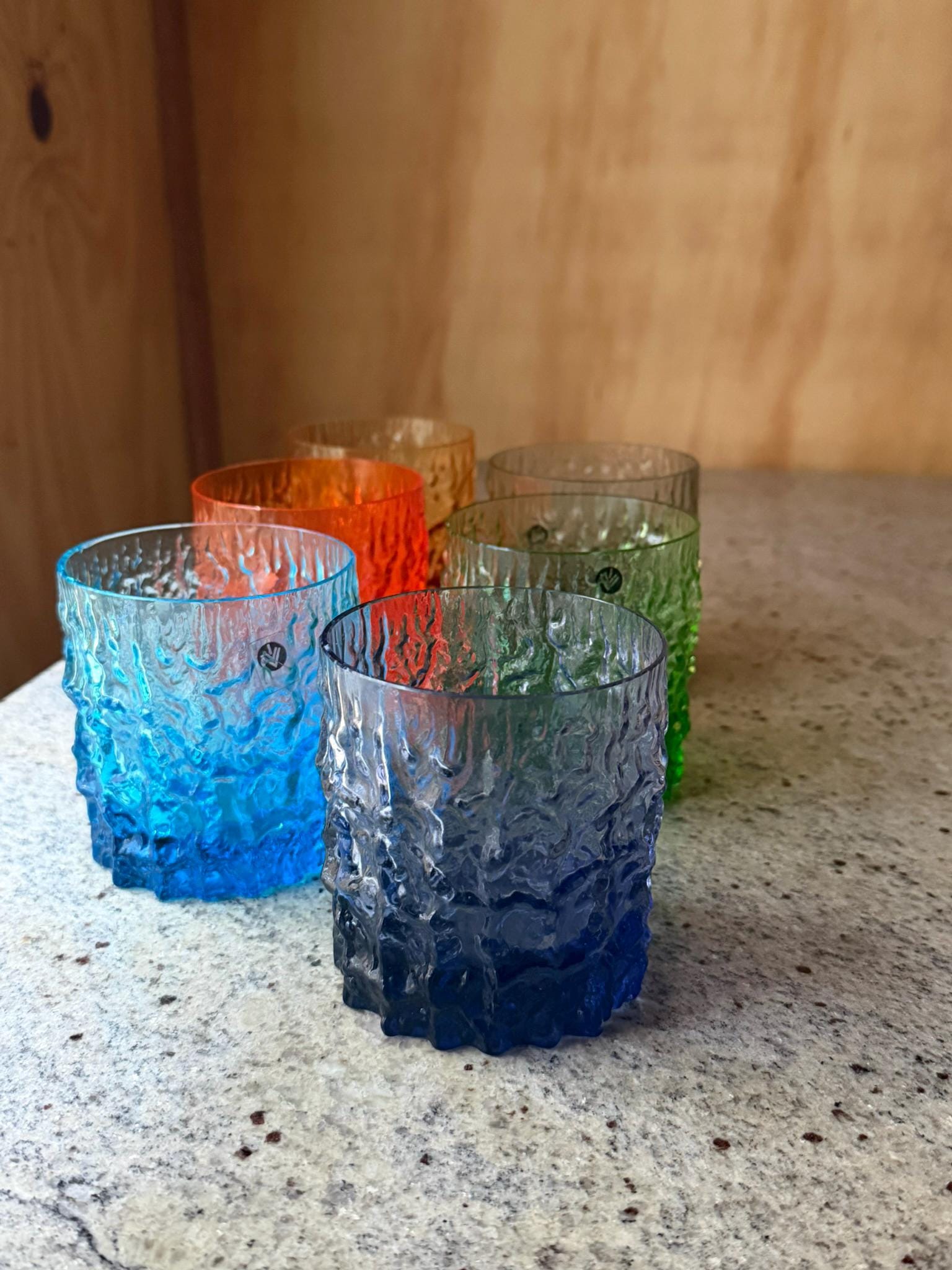Six multicoloured rocks glasses in the 'Bark' texture in the style of Geoffrey Baxter (Whitefriars). Italy - Circa 1960's.