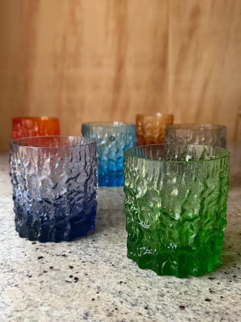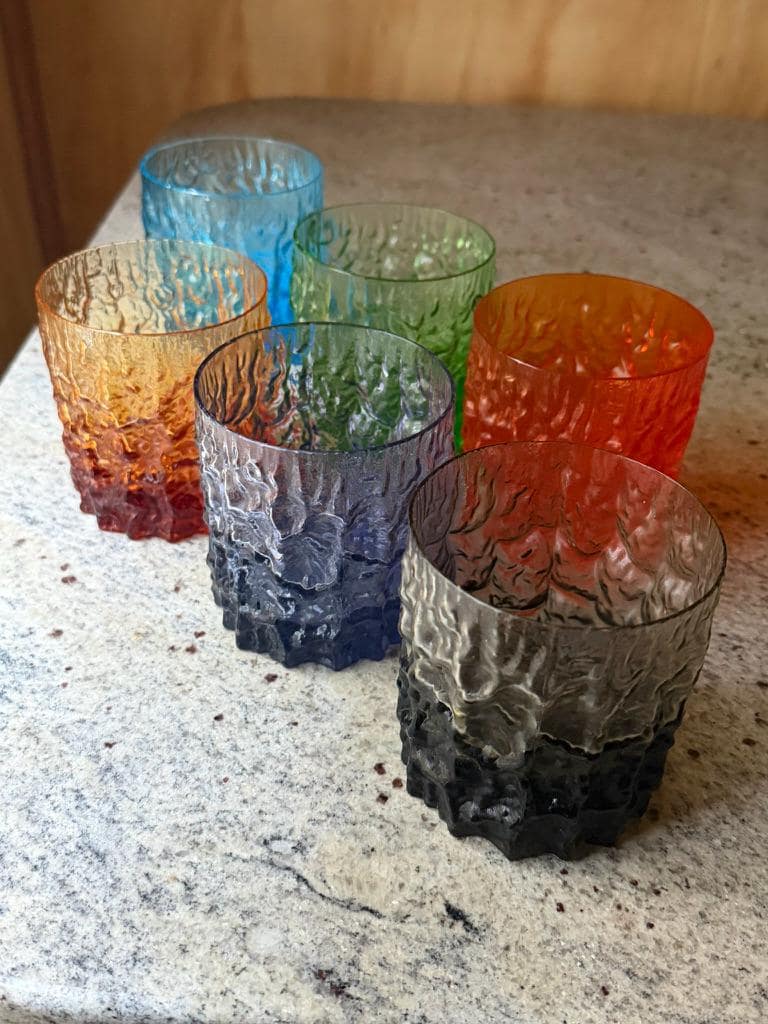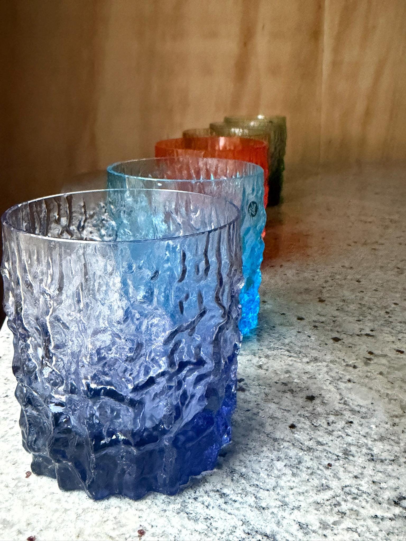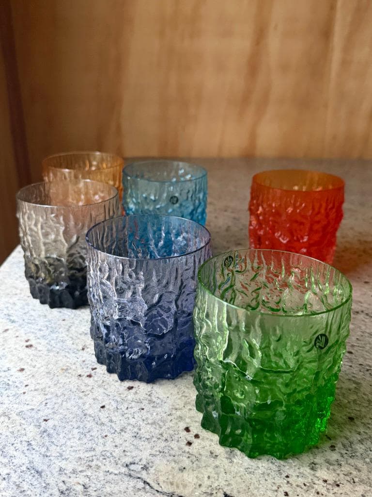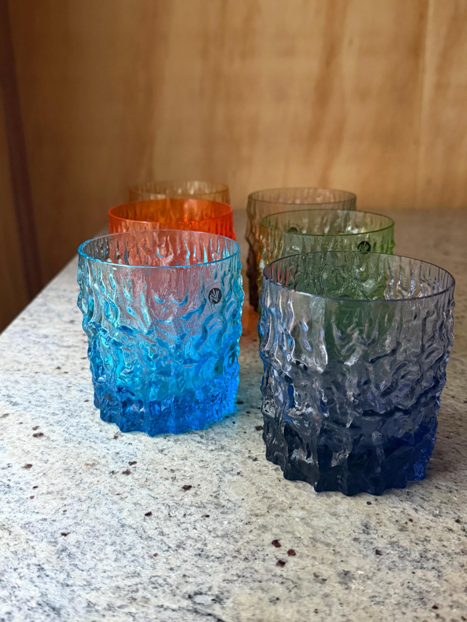 Six multicoloured rocks glasses in the 'Bark' texture in the style of Geoffrey Baxter (Whitefriars). Italy - Circa 1960's.