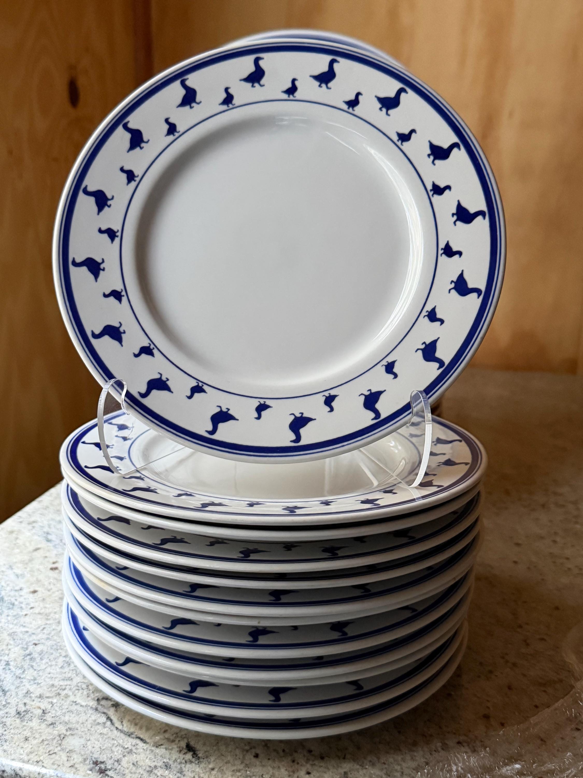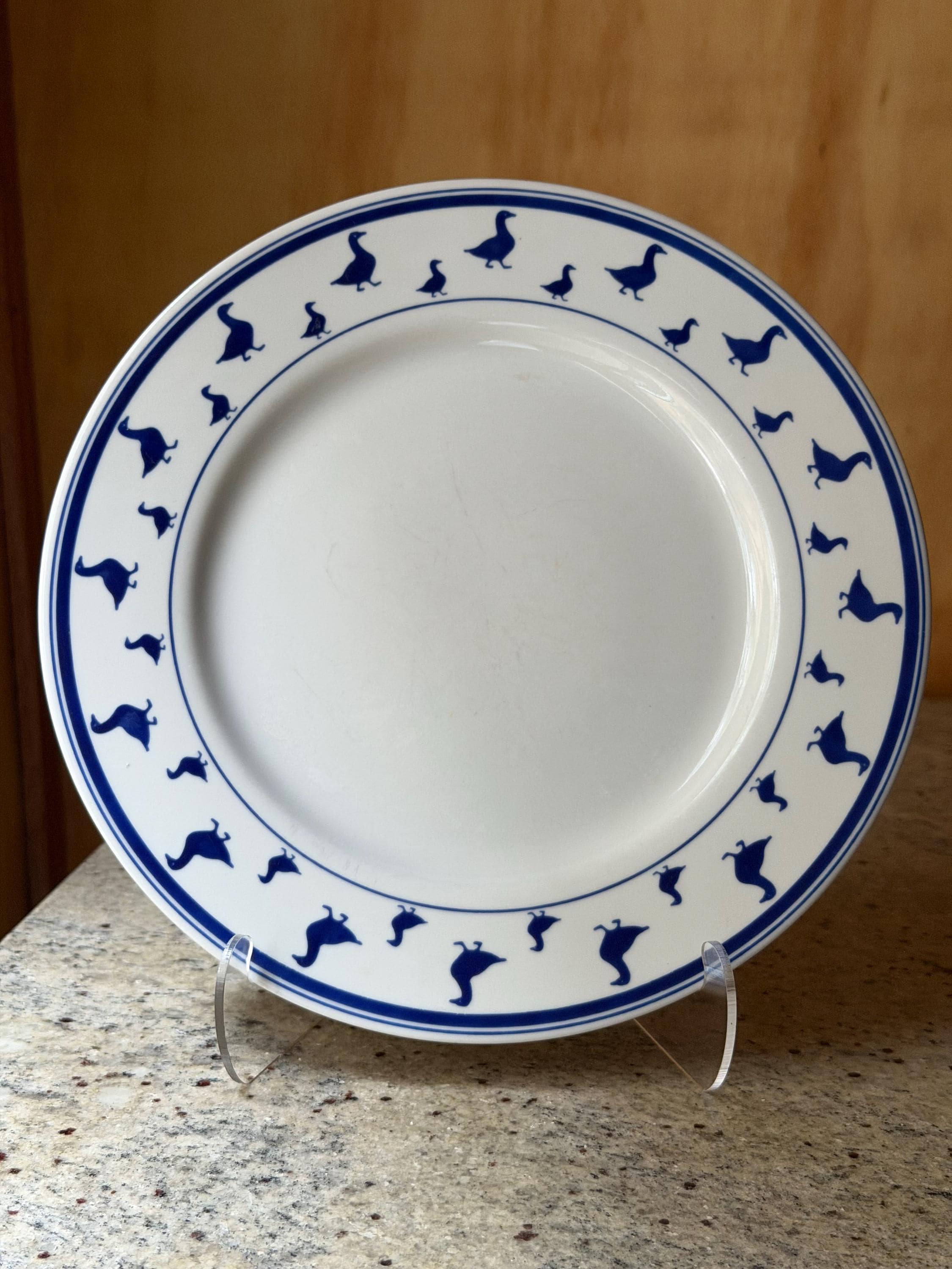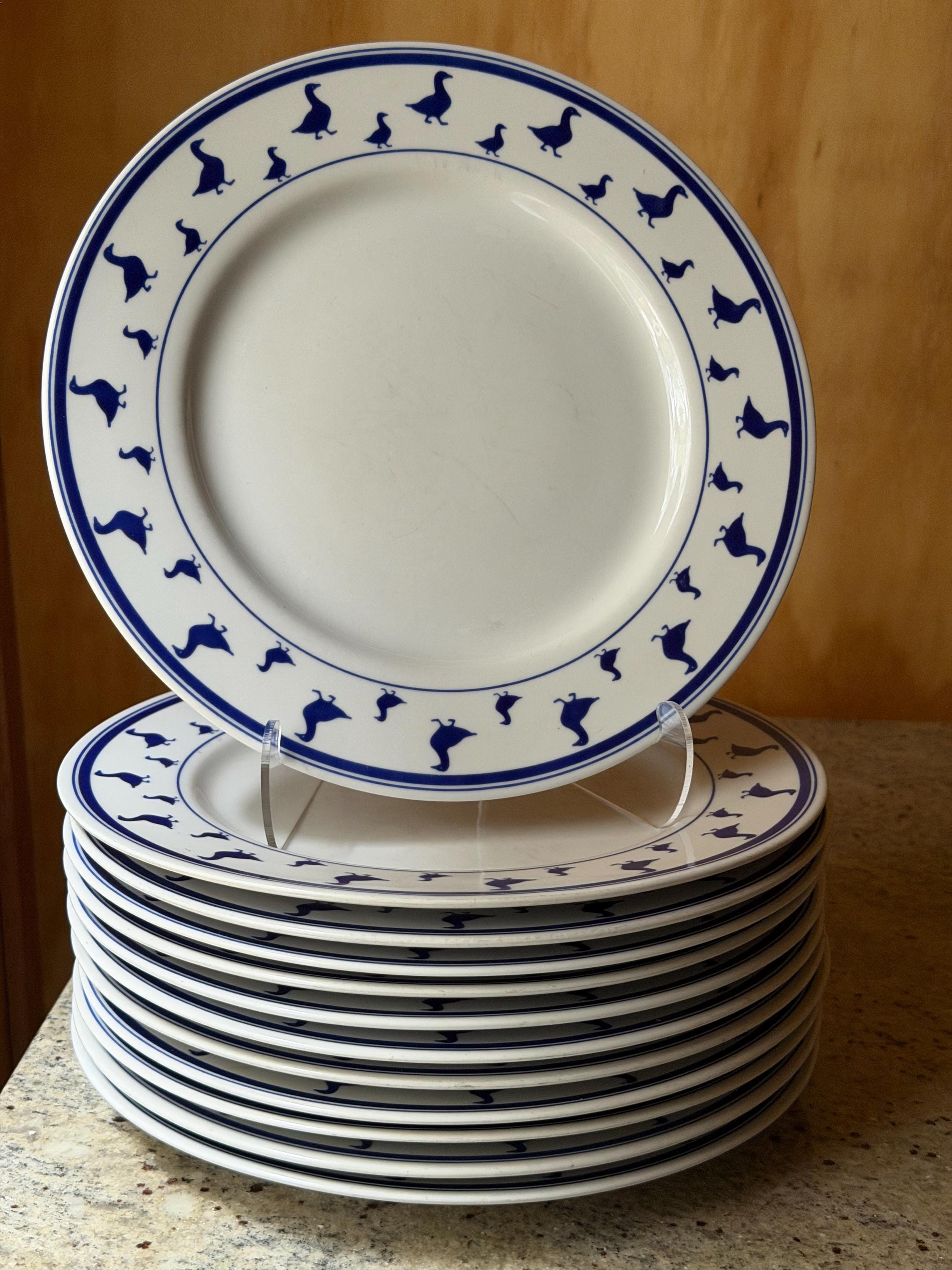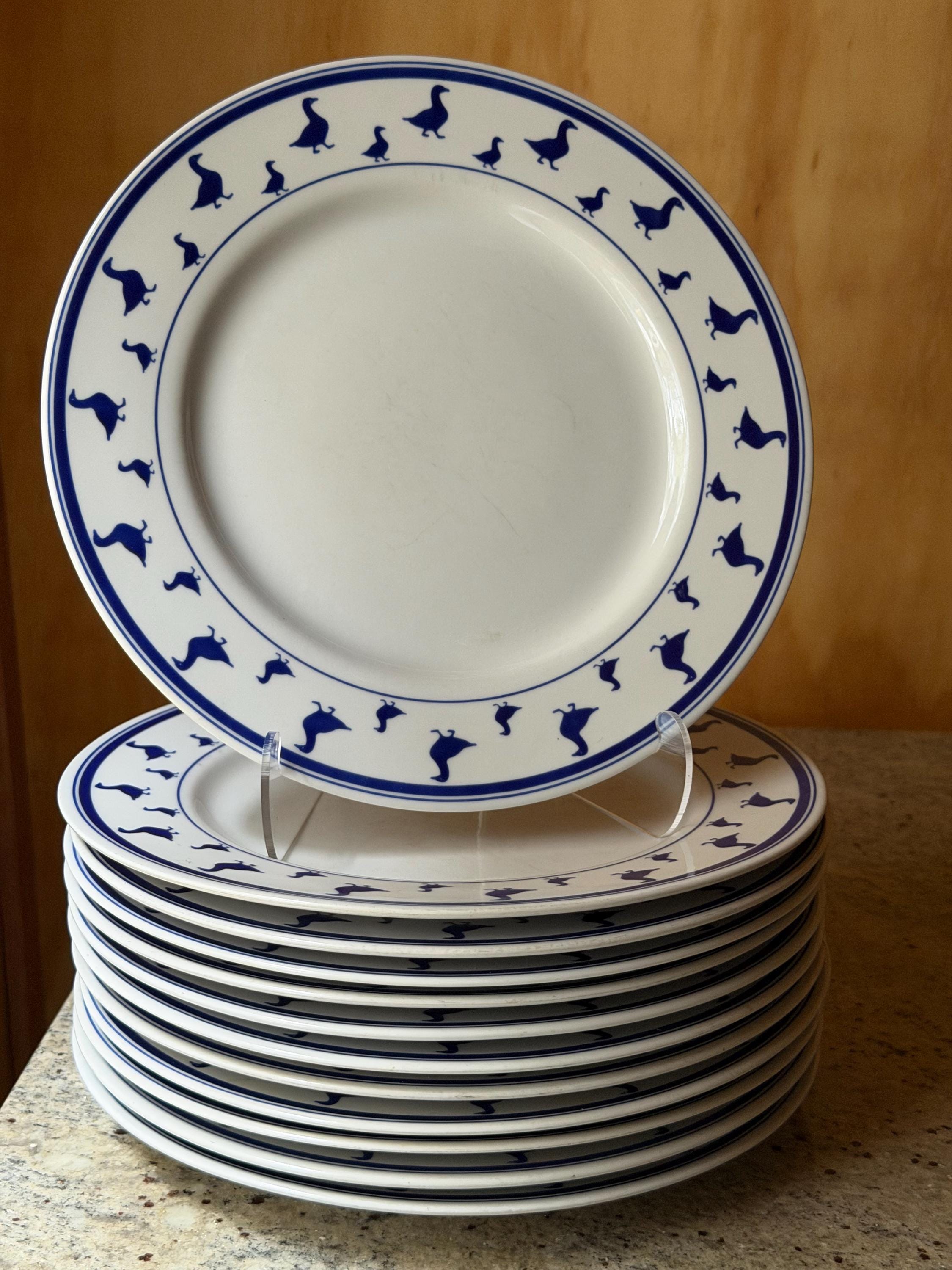 Each plate features a crisp white porcelain body with a charming cobalt blue bird motif encircling the rim, framed by double blue lines. The repeating birds give the set a light, elegant rhythm that feels both traditional and welcoming — perfect for French bistro, farmhouse, or classic European tables.