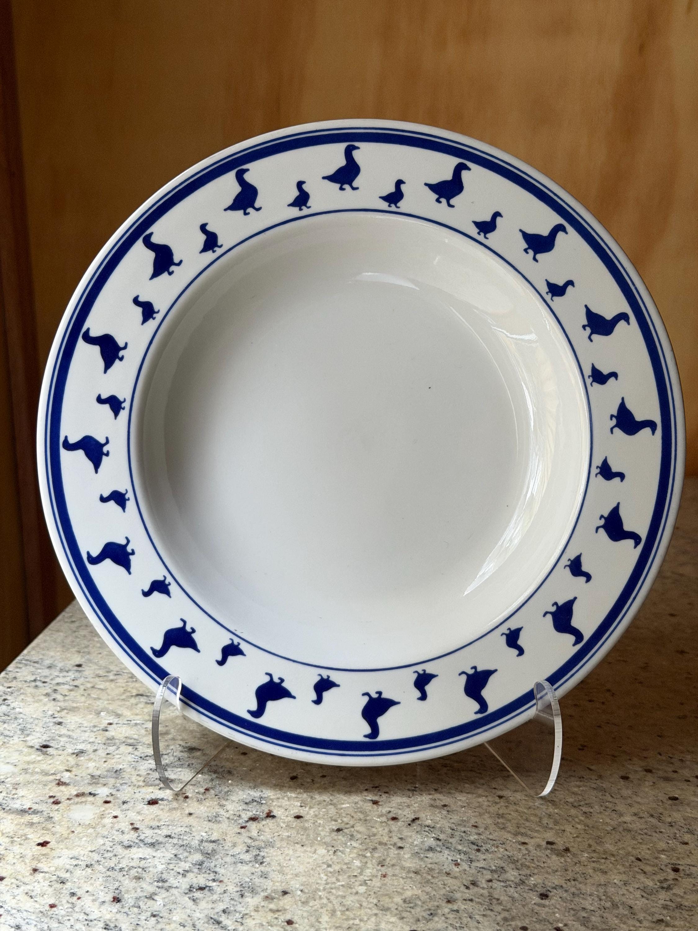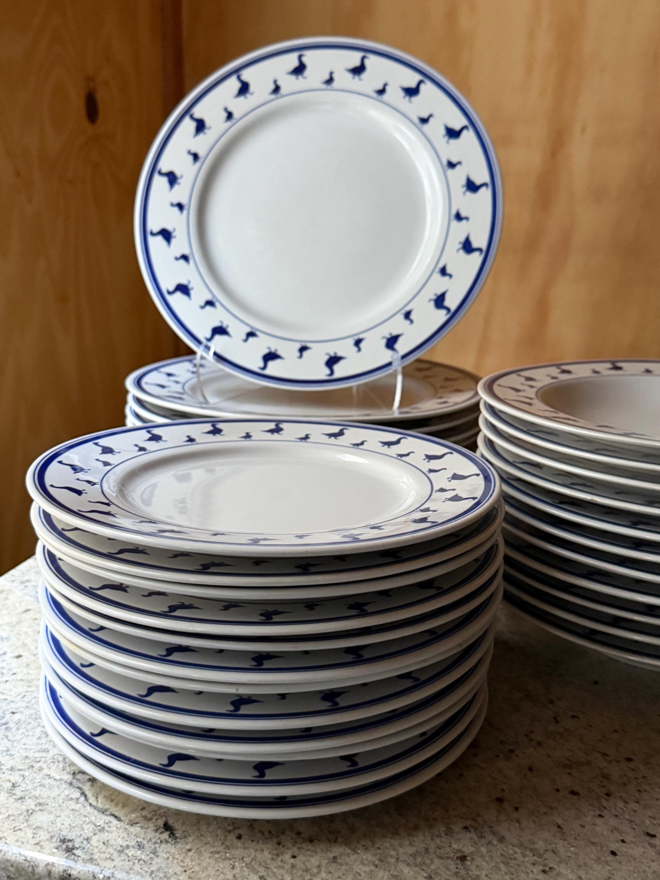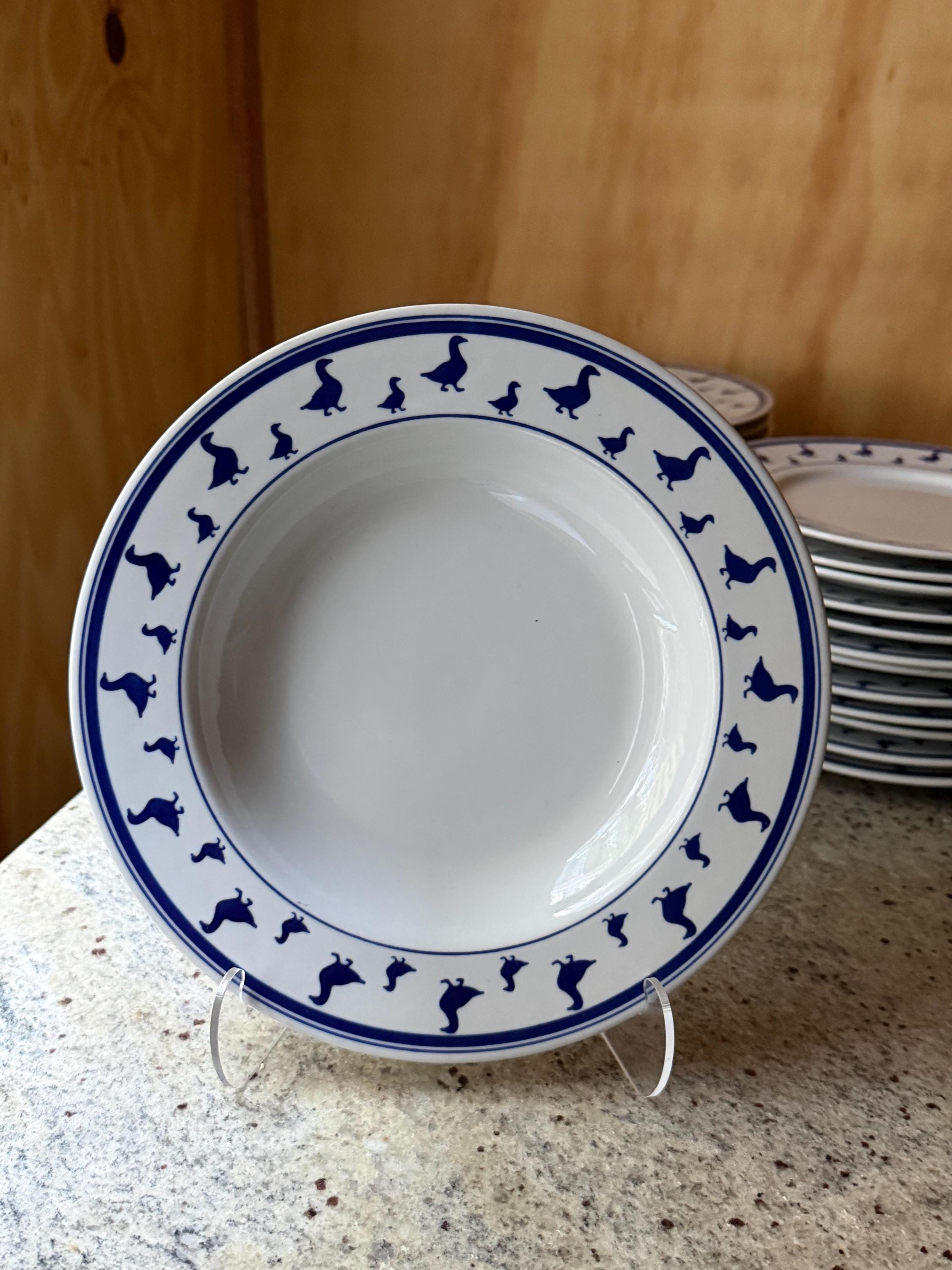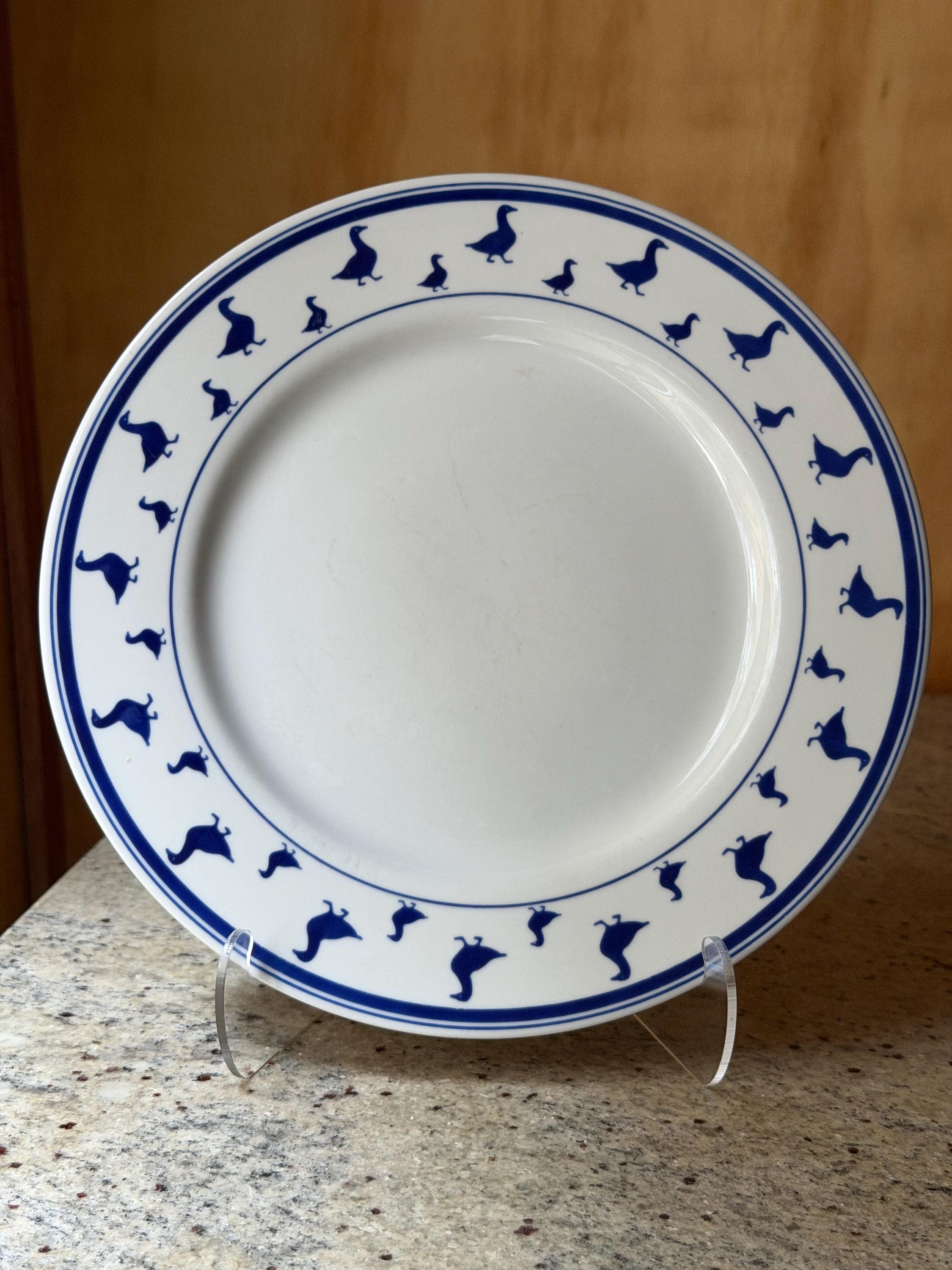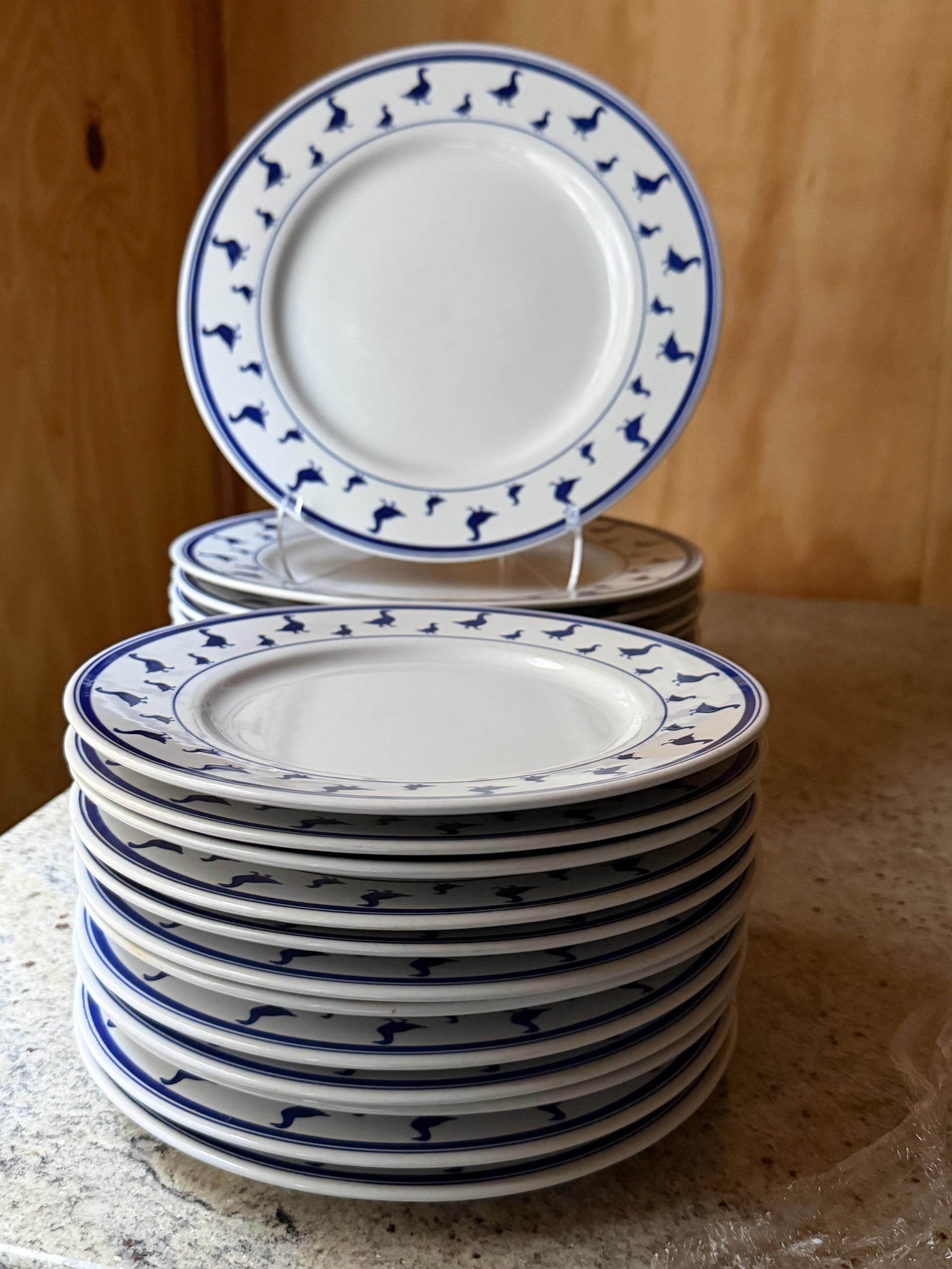 Each plate features a crisp white porcelain body with a charming cobalt blue bird motif encircling the rim, framed by double blue lines. The repeating birds give the set a light, elegant rhythm that feels both traditional and welcoming — perfect for French bistro, farmhouse, or classic European tables.