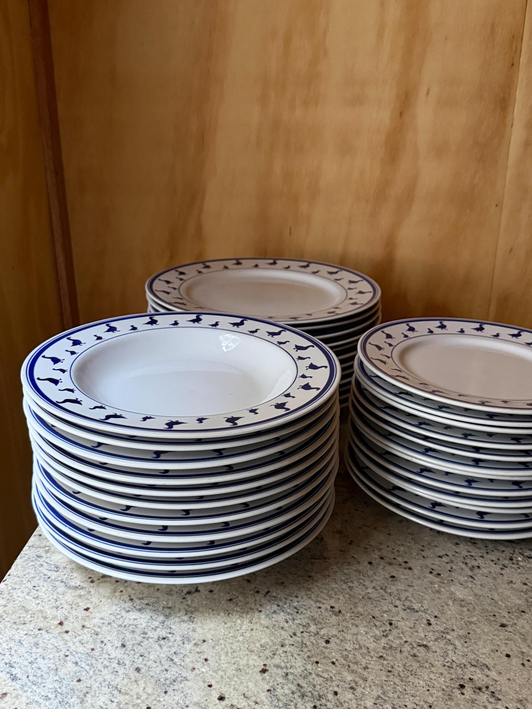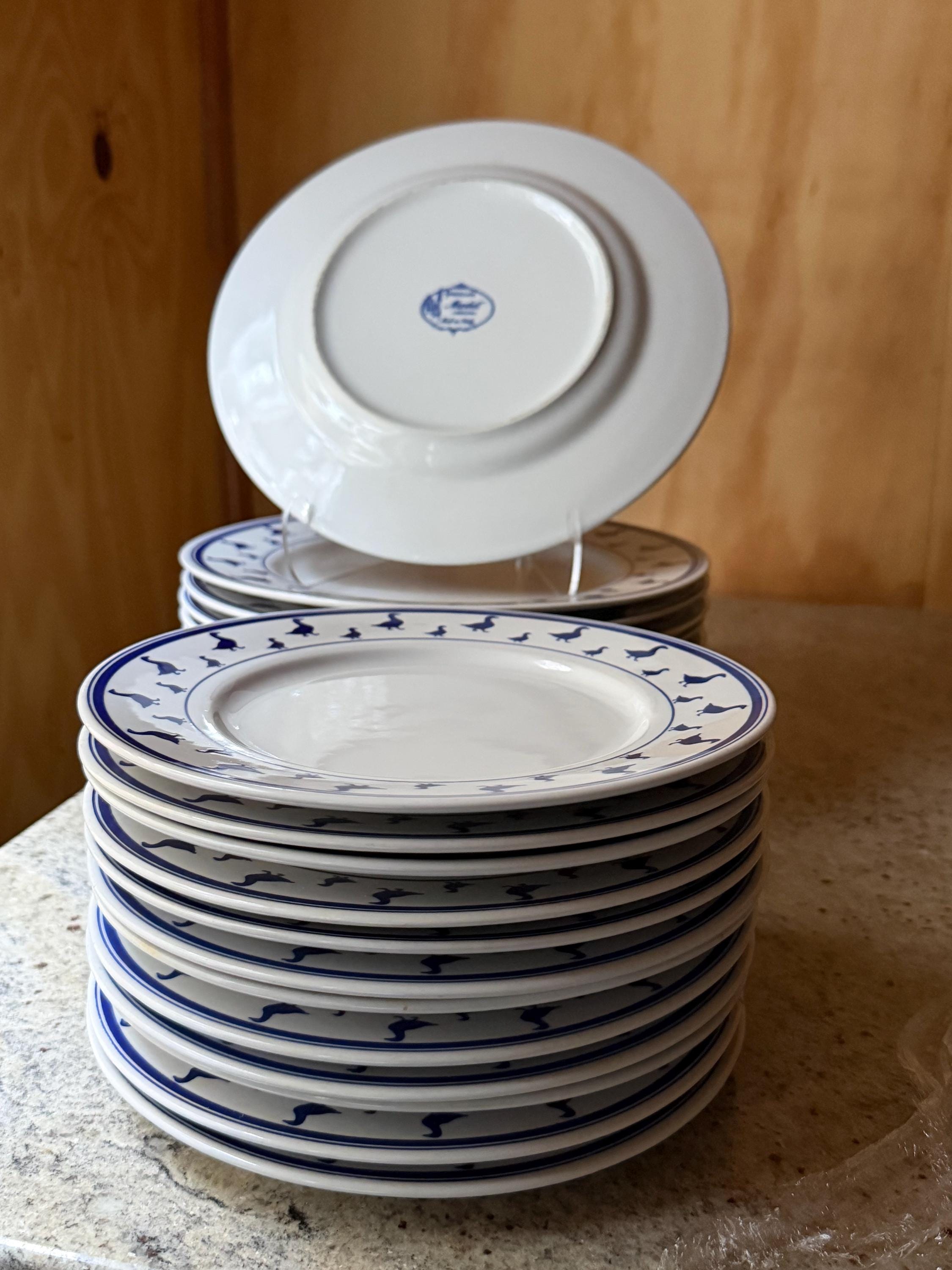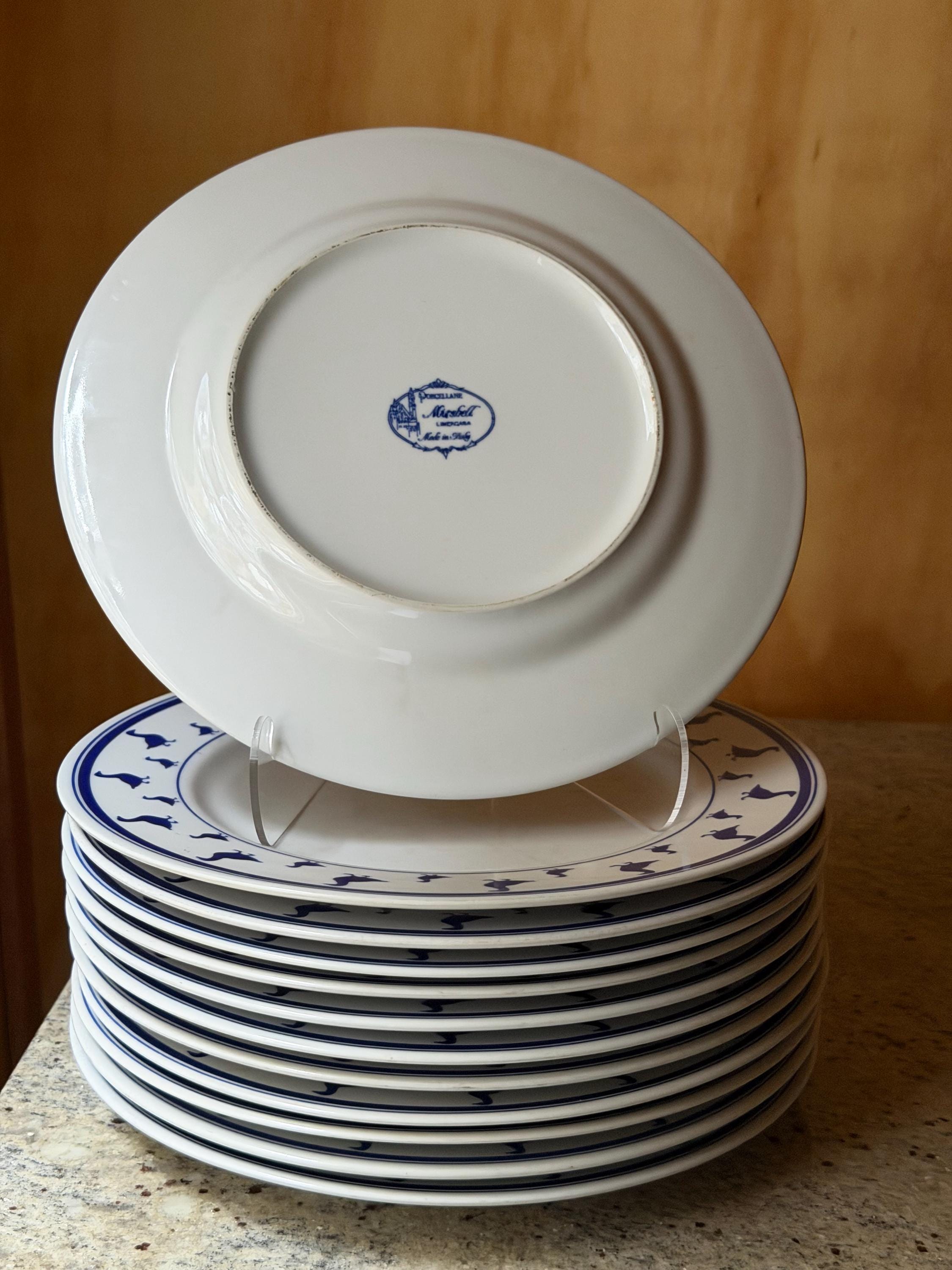 Large vintage Mirabell Porcellane plate set of 31 pieces, made in Italy. Fine white porcelain with cobalt blue bird border in classic Limoges style European tableware.