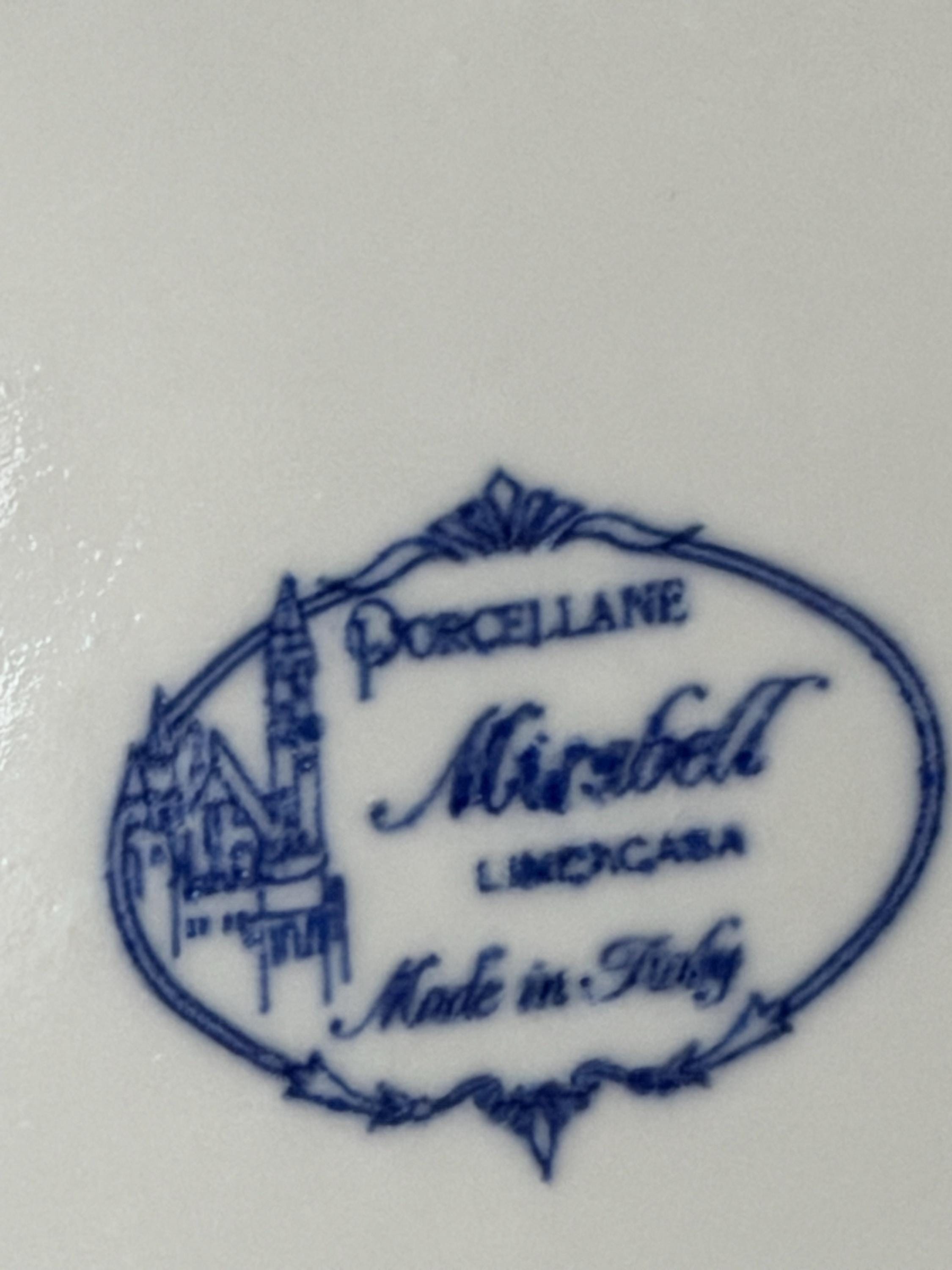 A beautiful and substantial set of 31 vintage porcelain plates by Mirabell Porcellane, made in Italy and finished in a classic blue-and-white Limoges-style design.