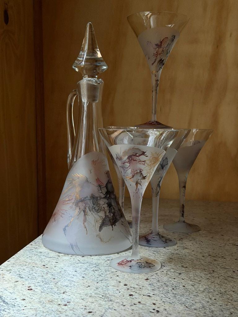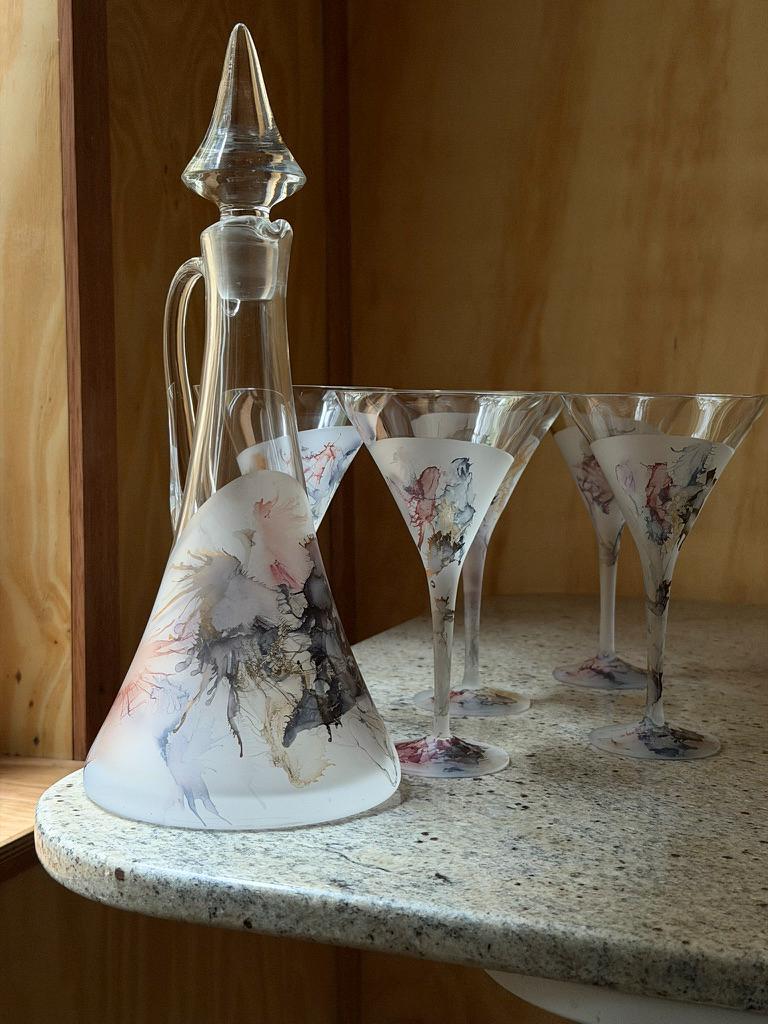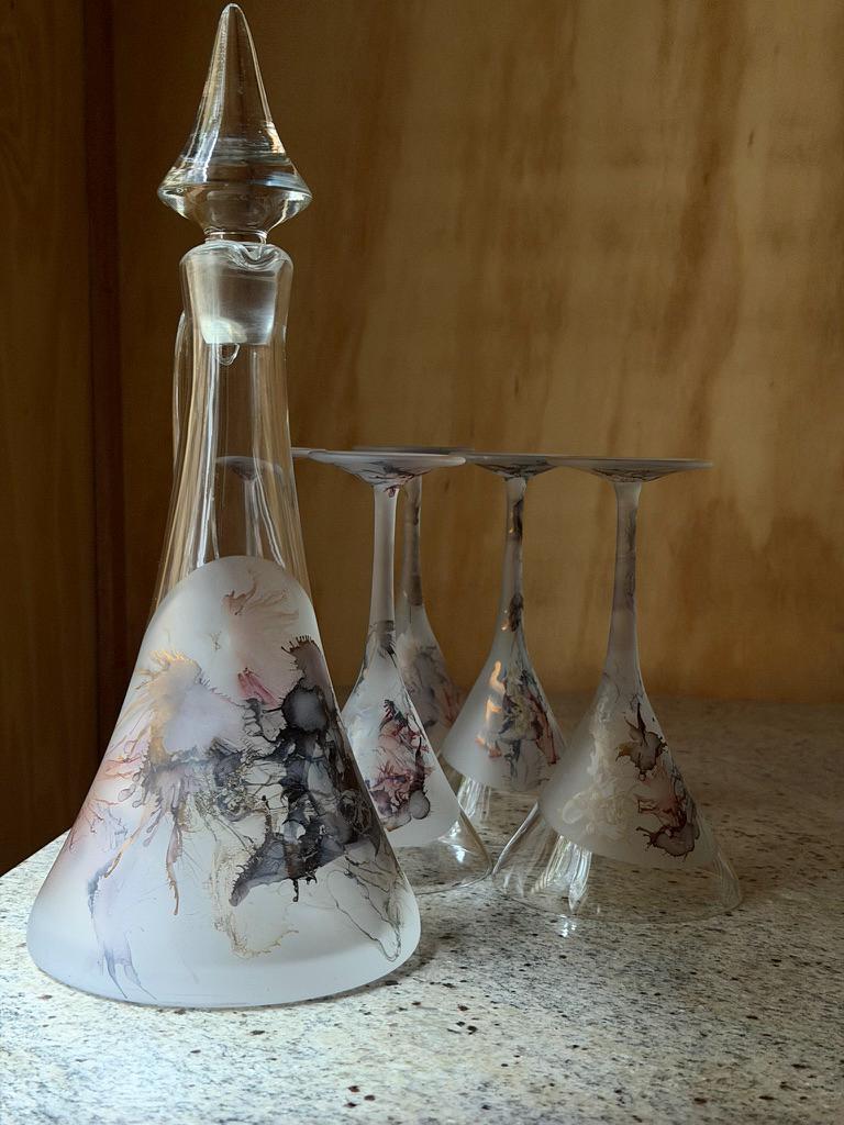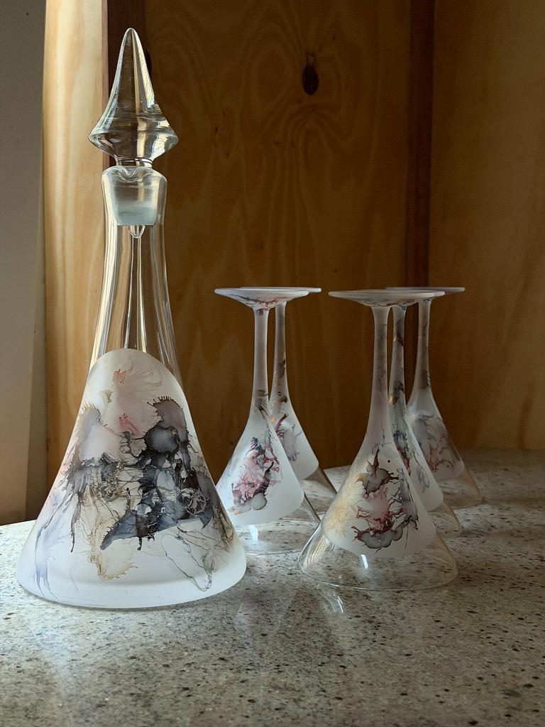 Frosted Art Glass Decanter Set – Painted Cocktail Glasses – Modern Barware – 5 Piece Set