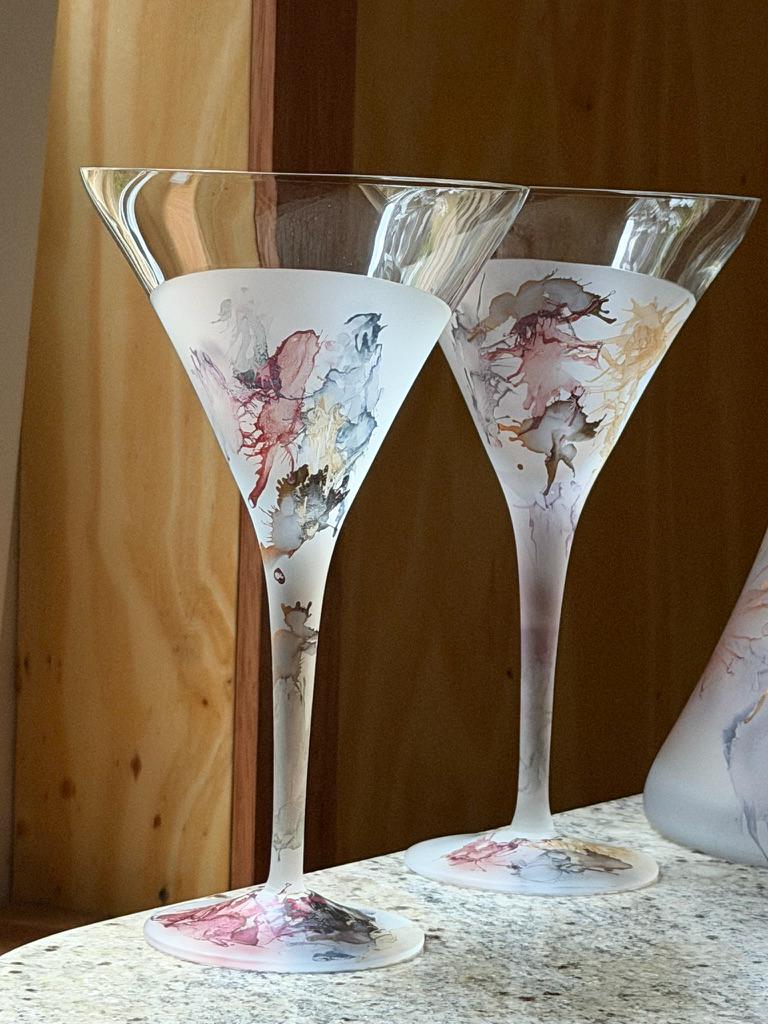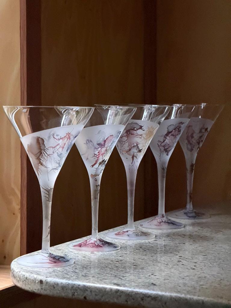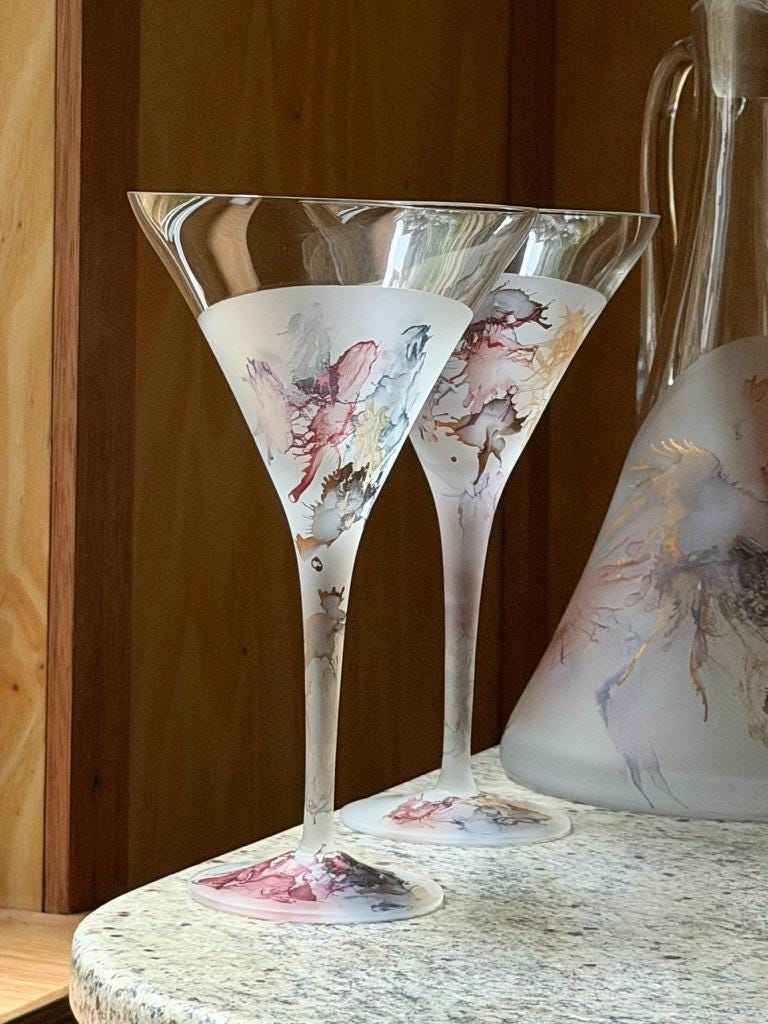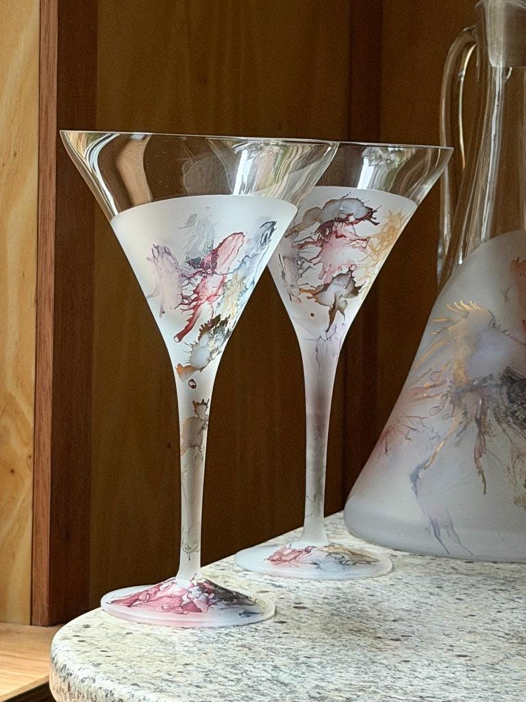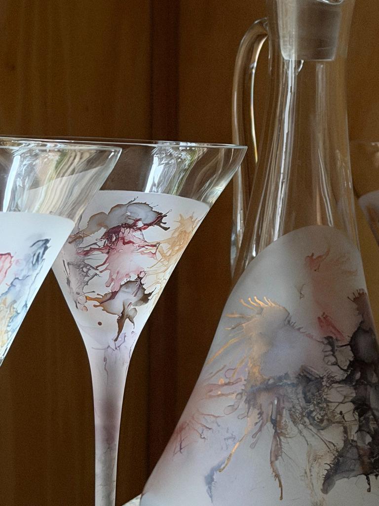 Frosted Art Glass Decanter Set – Painted Cocktail Glasses – Modern Barware – 5 Piece Set