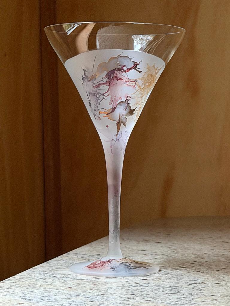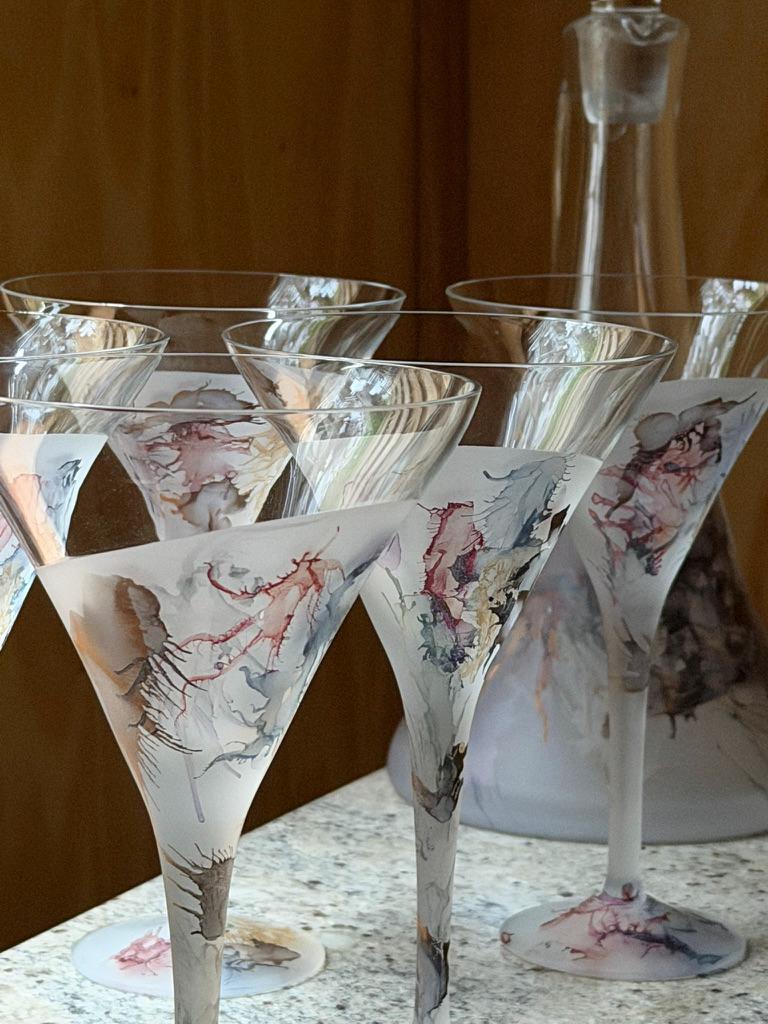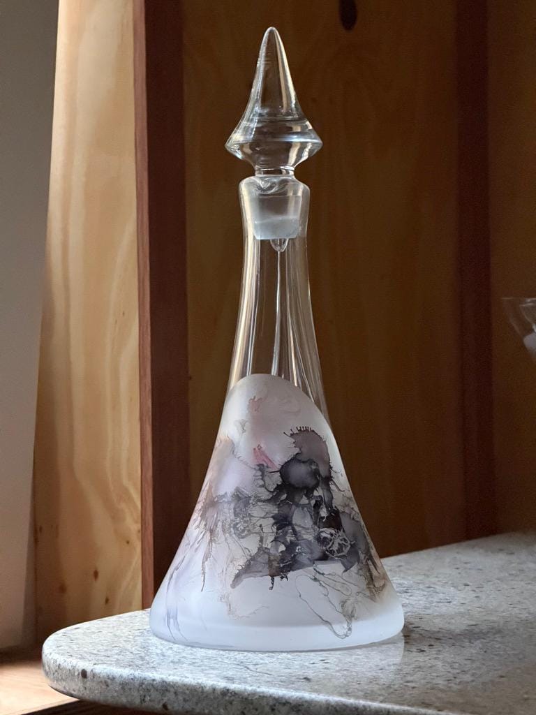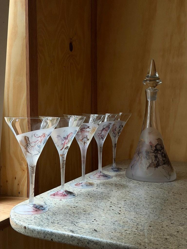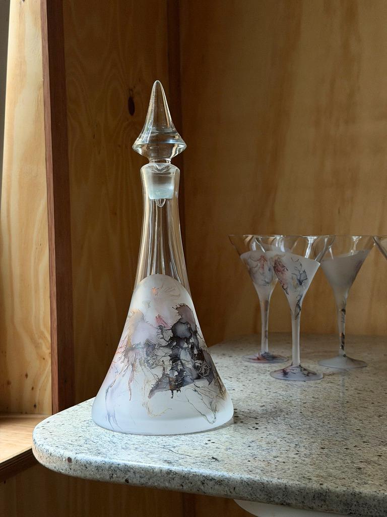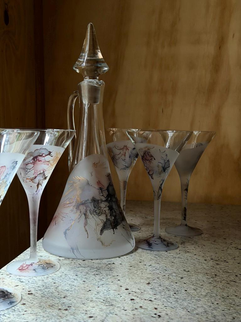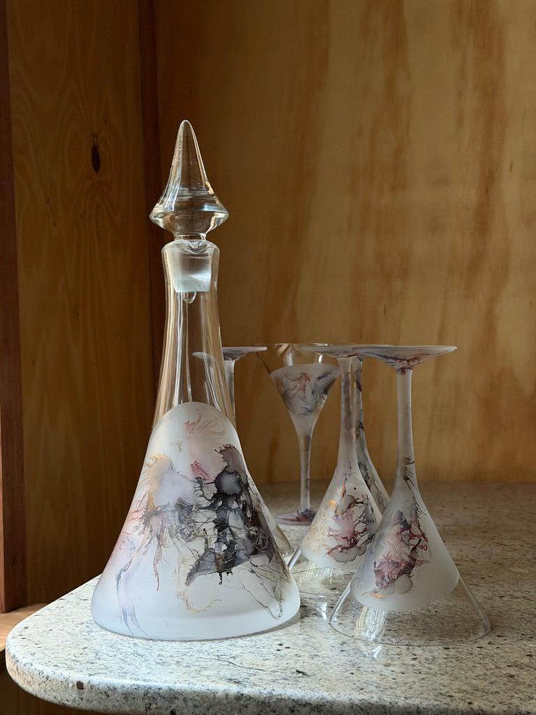 Softly frosted glass, dreamy abstract brushwork, and a tall sculptural stopper that feels almost fairytale-like — this vintage decanter and matching stemware set turns an ordinary evening drink into a small ceremony.