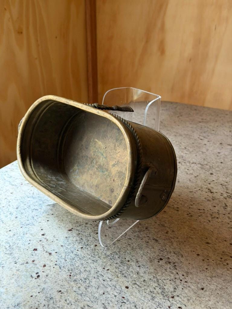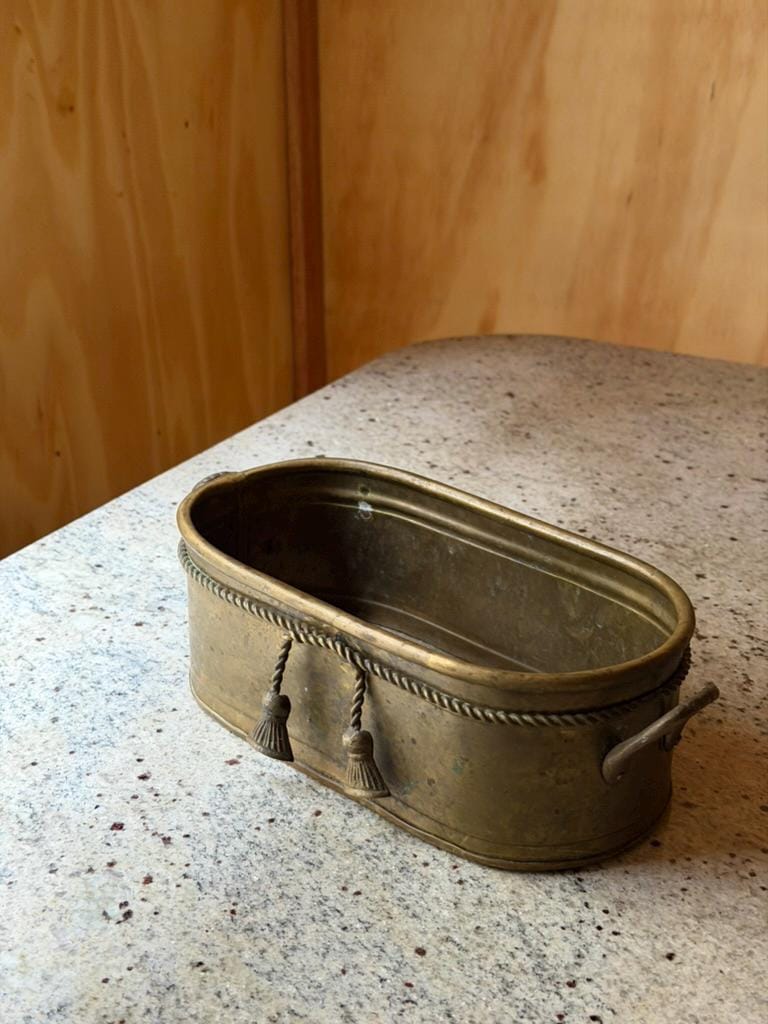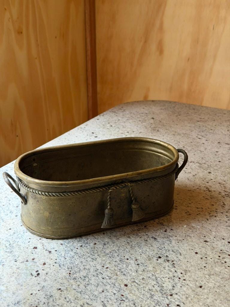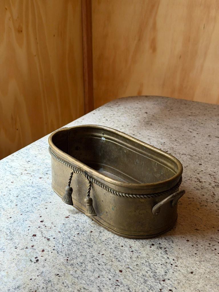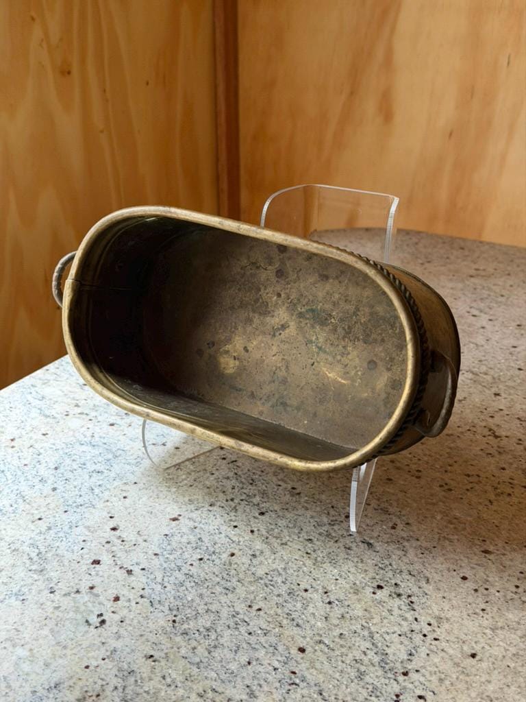 Charming antique brass jardinière featuring a beautifully crafted oval form with elegant neoclassical detailing. The rim is adorned with intricate rope edging, highlighting the fine craftsmanship and timeless character of this vintage piece.