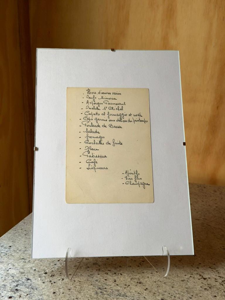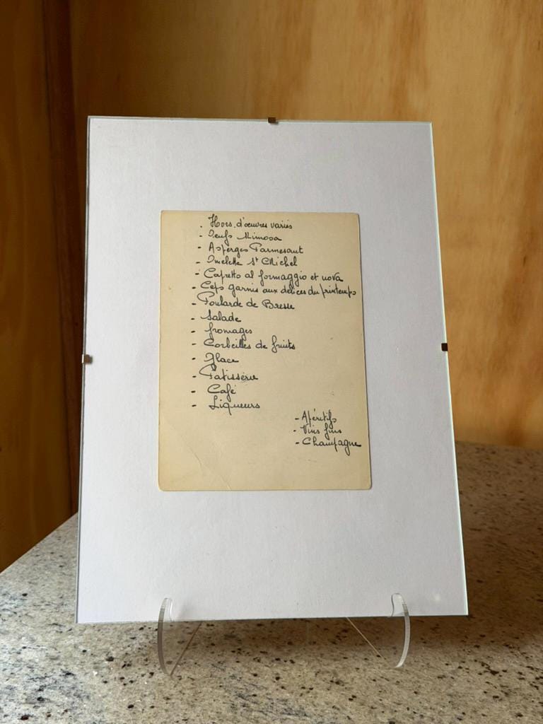 A charming vintage handwritten French menu, beautifully presented in a large mat frame. The elegant cursive handwriting lists a classic multi-course meal typical of traditional French dining, giving the piece a refined and authentic bistro atmosphere.
