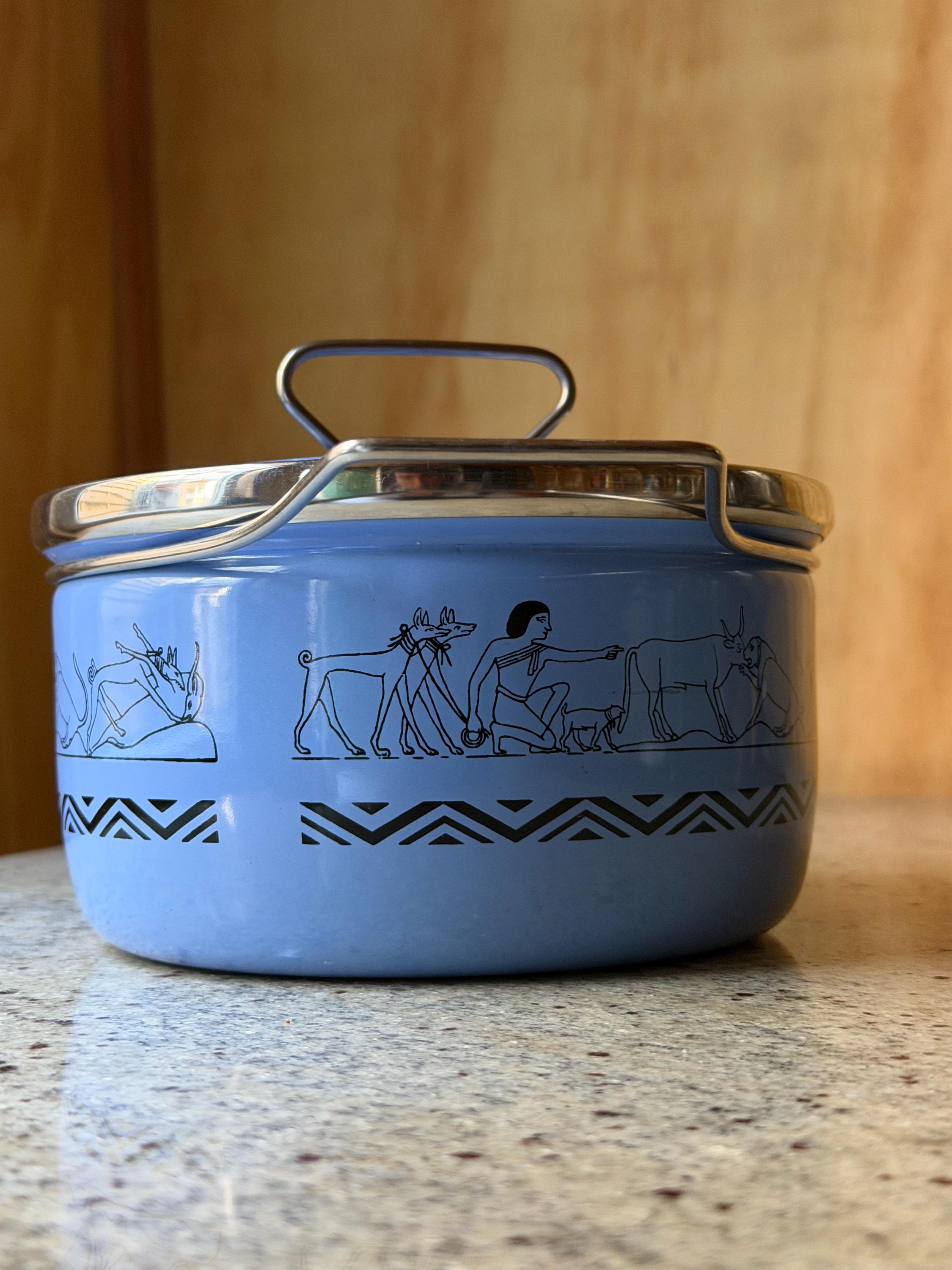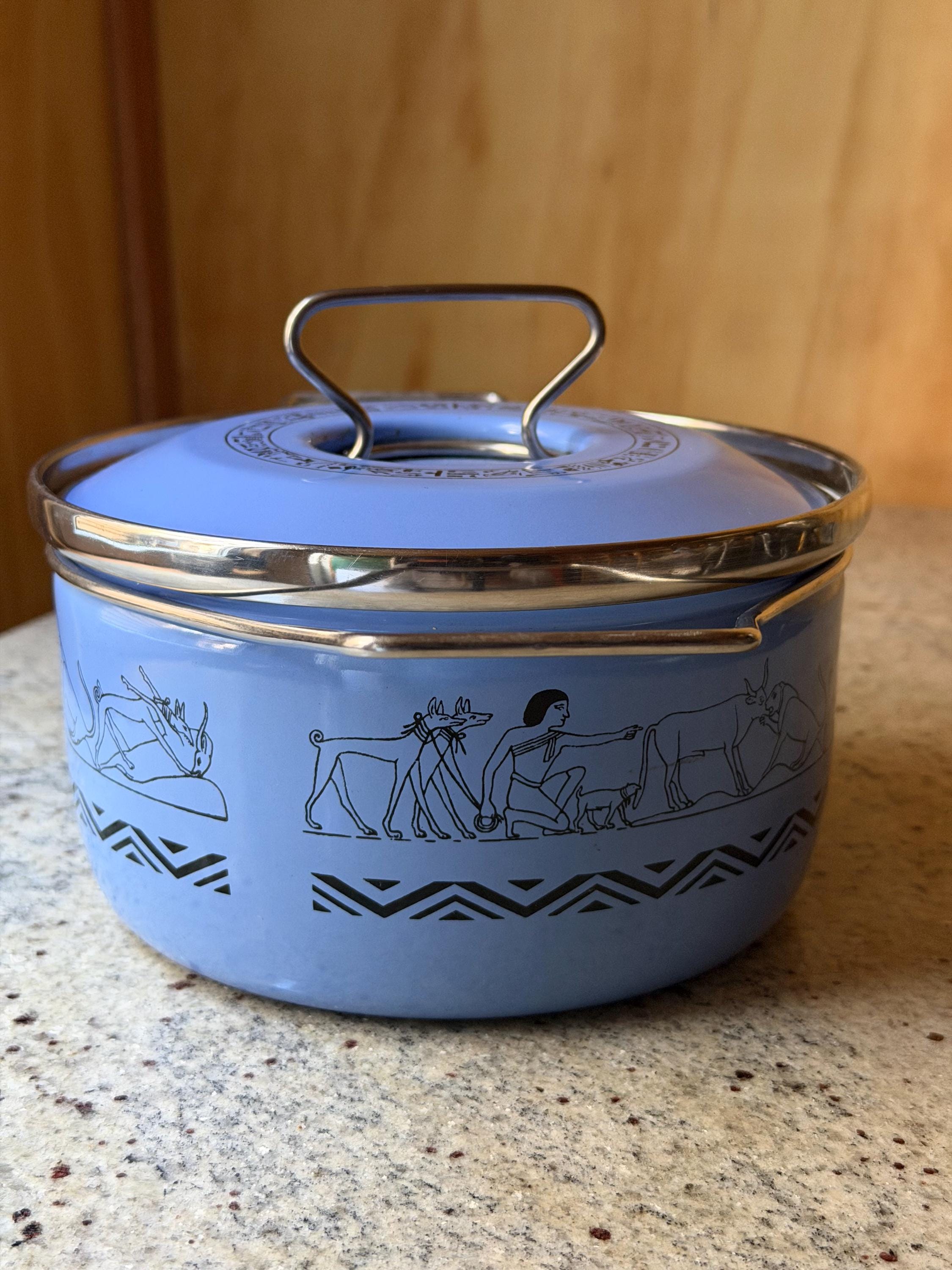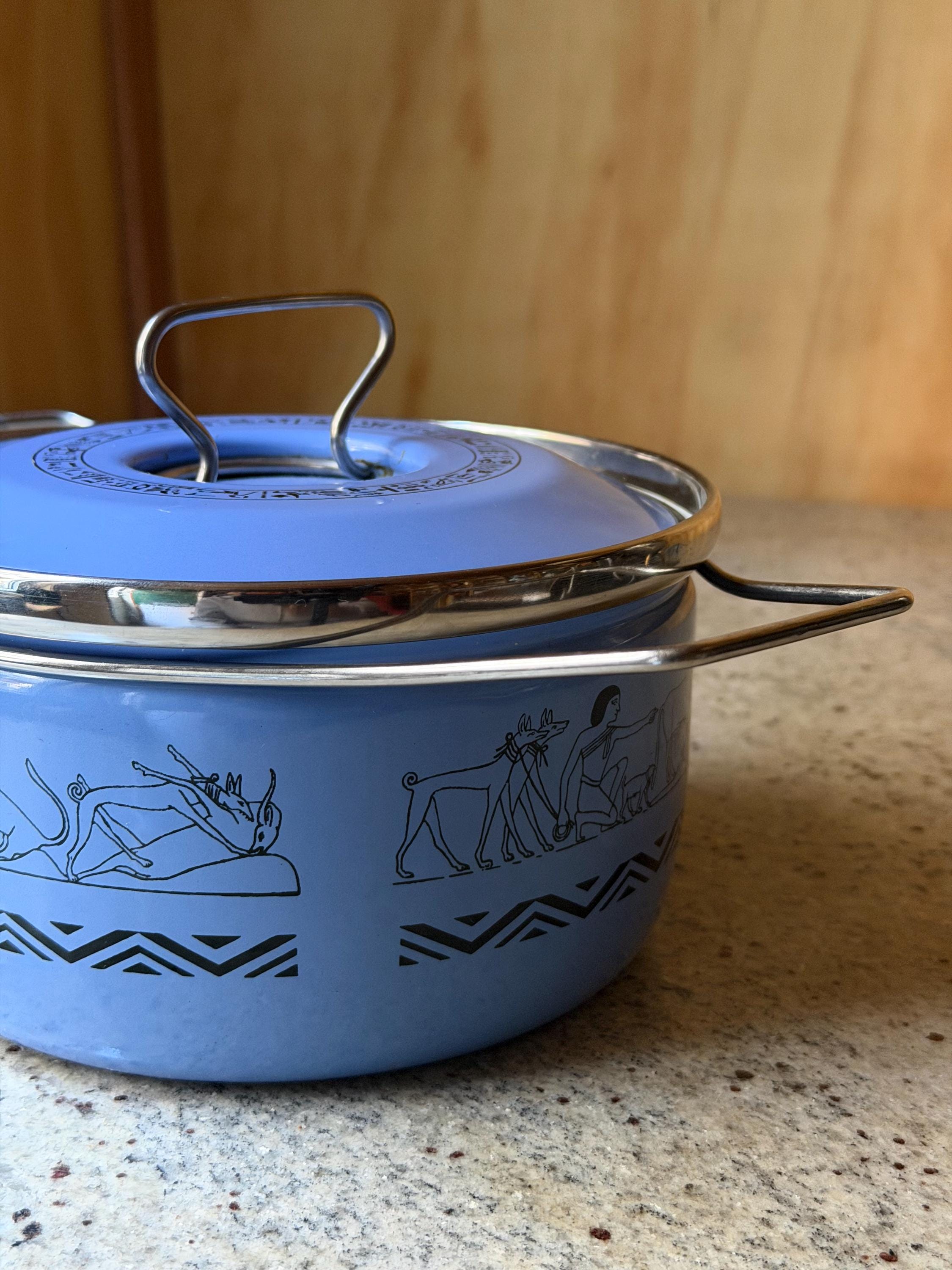 Rare Vintage Siltal Italy Enamel Casserole Pot – Egyptian Motif – Mid-Century Modern Cookware – Blue Enamel Pot with Lid - Italian Design