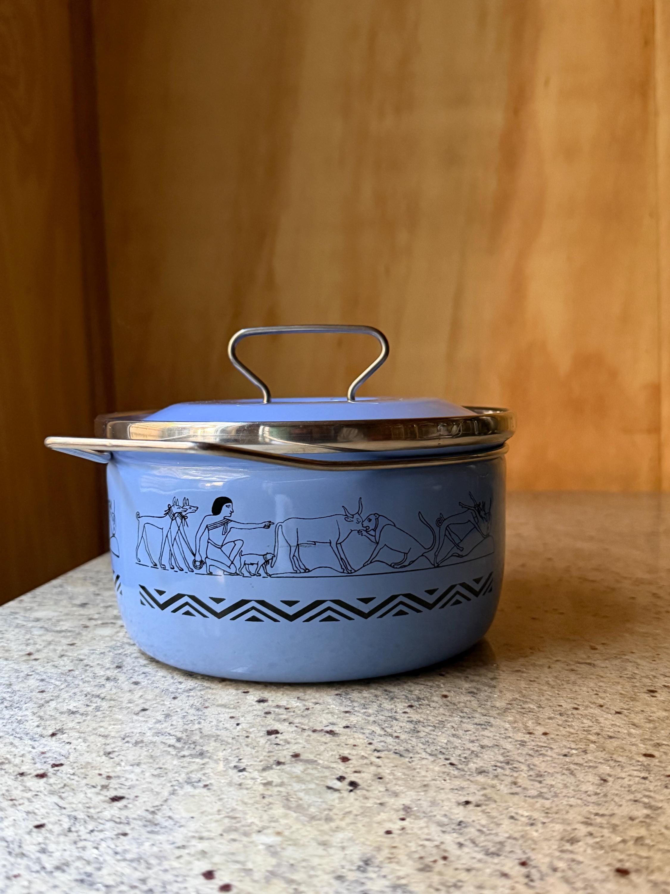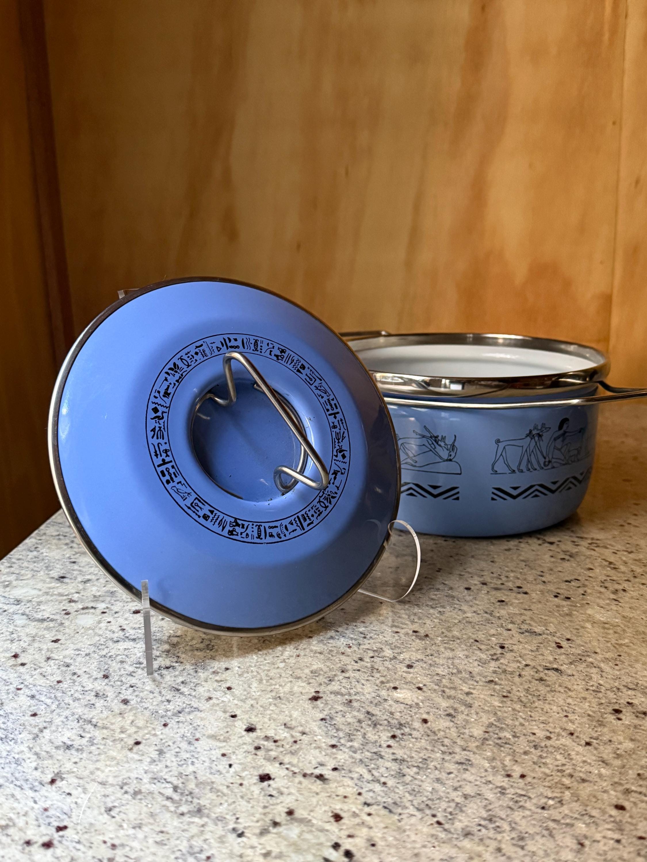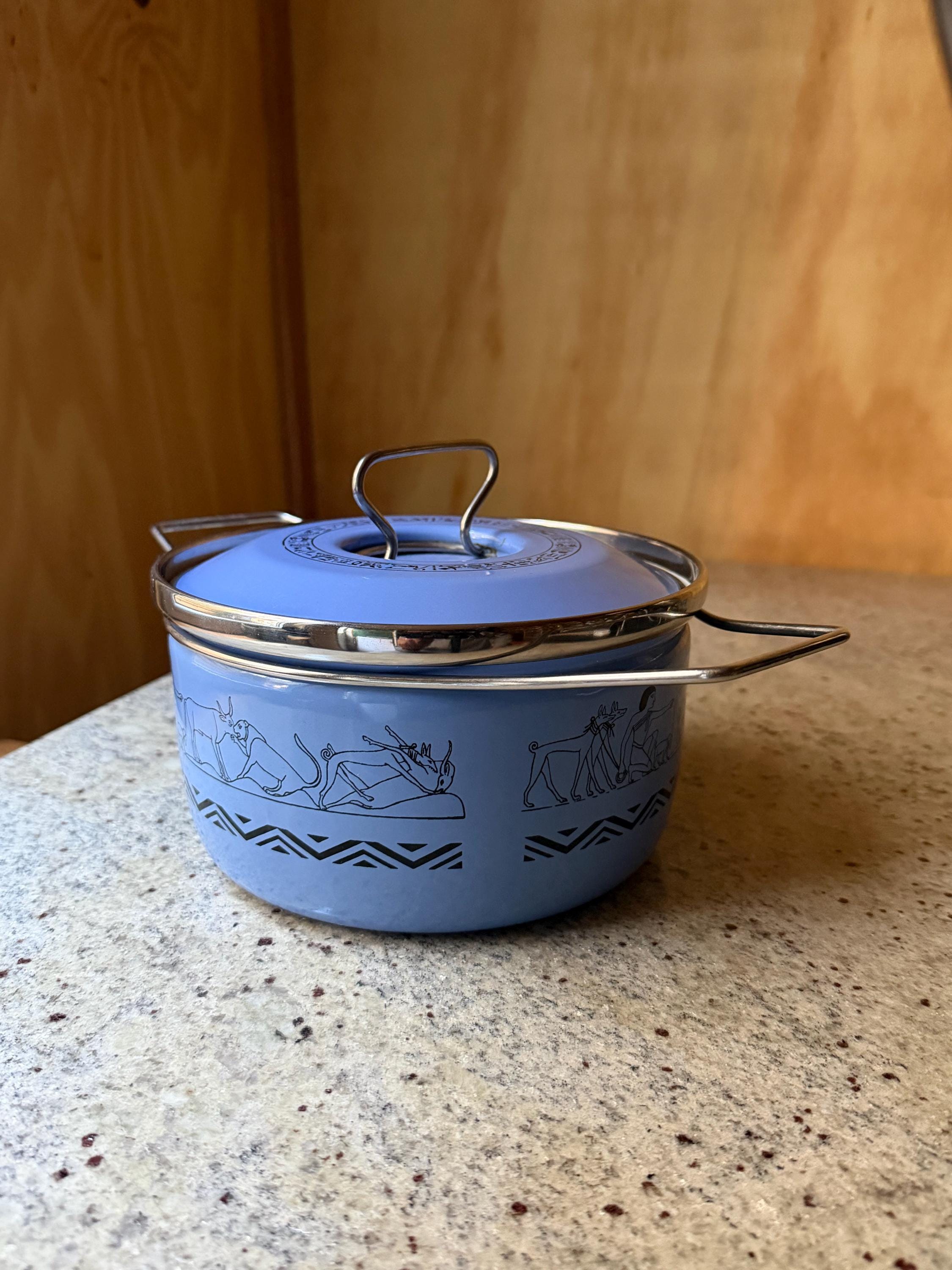 Rare Vintage Siltal Italy Enamel Casserole Pot – Egyptian Motif – Mid-Century Modern Cookware – Blue Enamel Pot with Lid - Italian Design