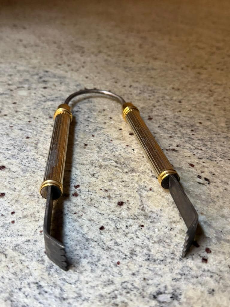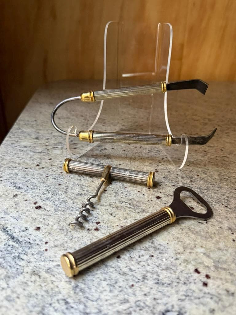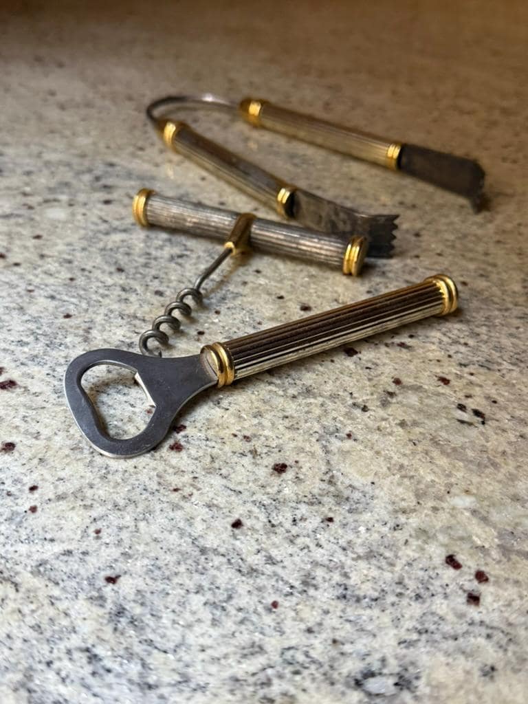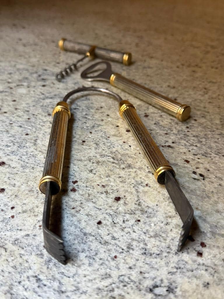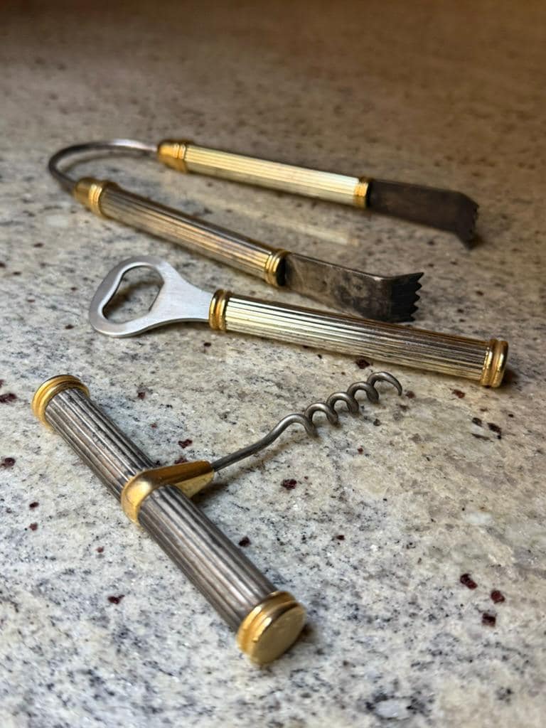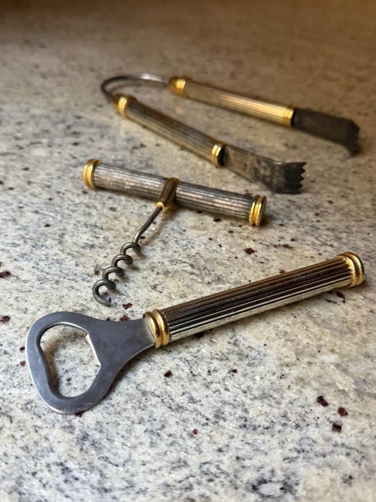 Vintage Bar Tool Set – 3 Pieces – Corkscrew, Bottle Opener & Ice Tongs – Mid Century Brass Barware