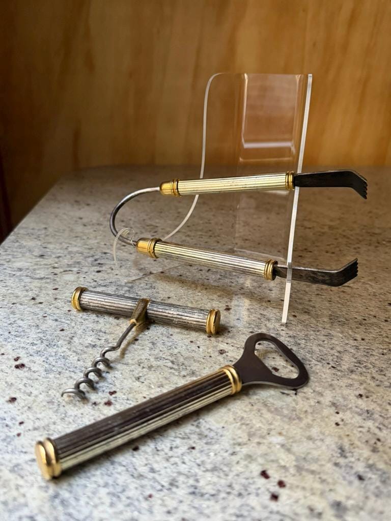 Stylish vintage 3-piece bar tool set featuring elegant ribbed metal handles with brass accents. The set includes essential tools for any cocktail lover and reflects the refined design typical of mid-century European barware.
