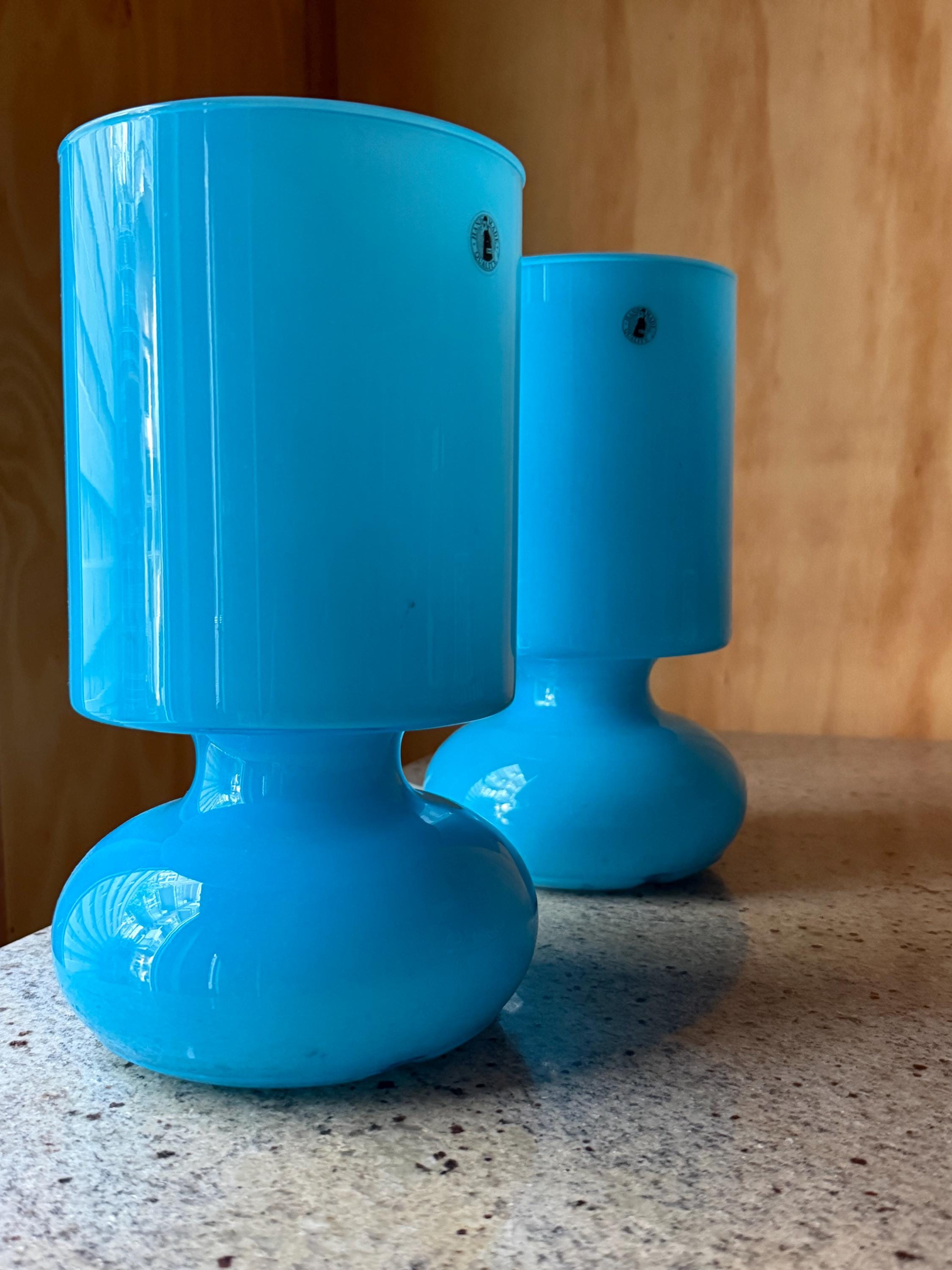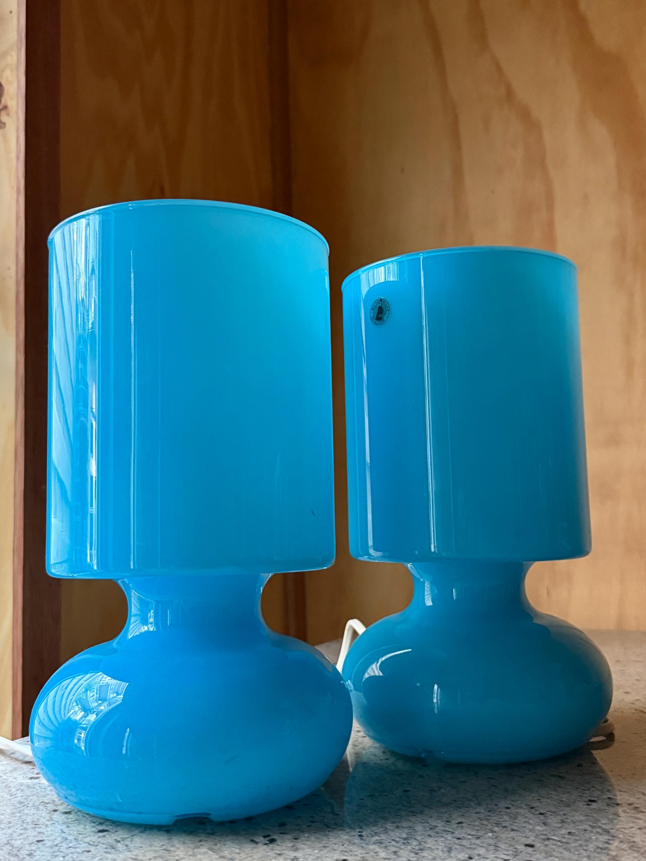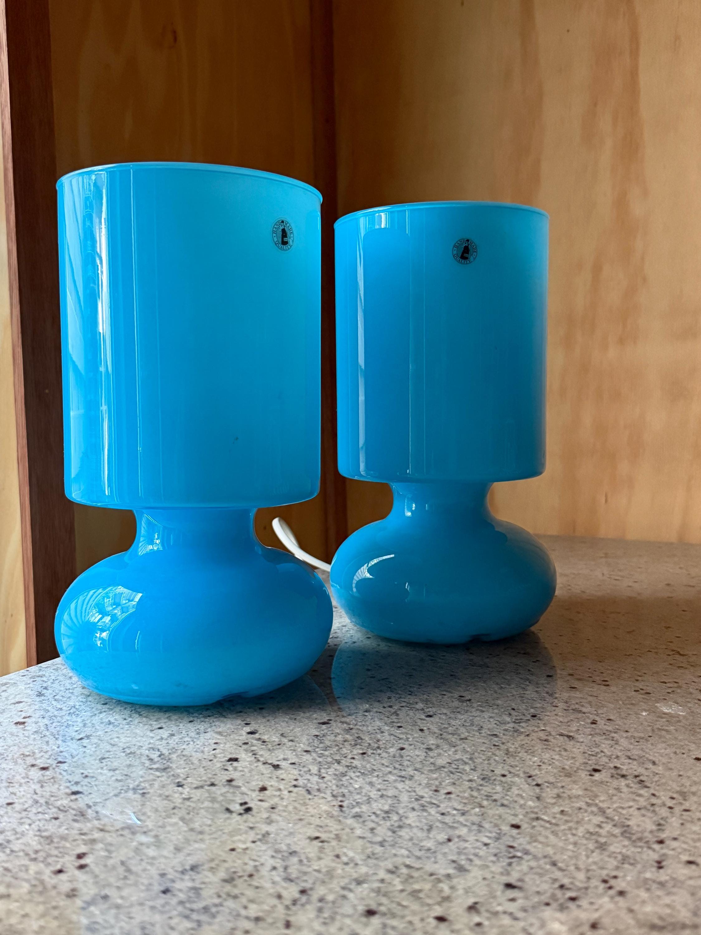 Their sculptural shape and vibrant blue color make them both functional lighting and decorative statement pieces for **retro, mid-century inspired, or modern interiors**.