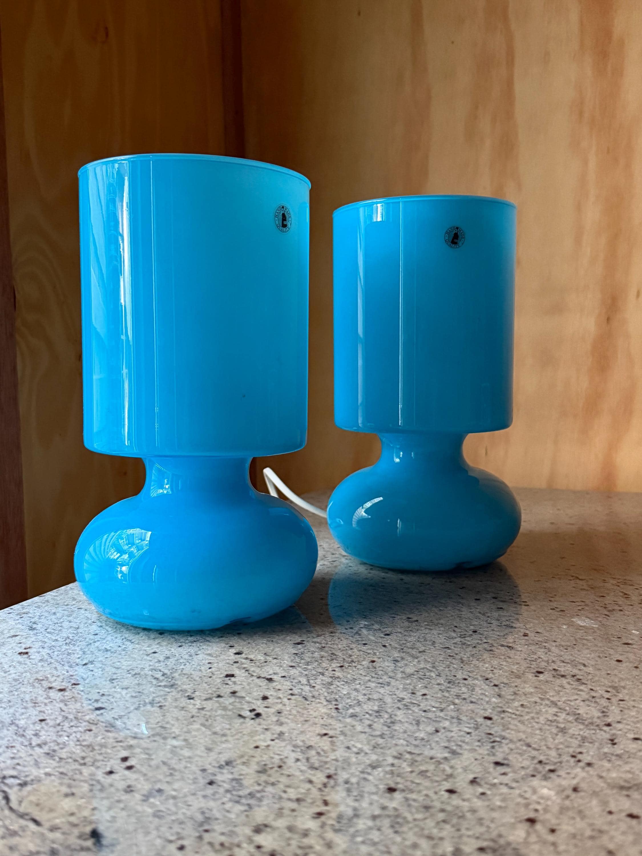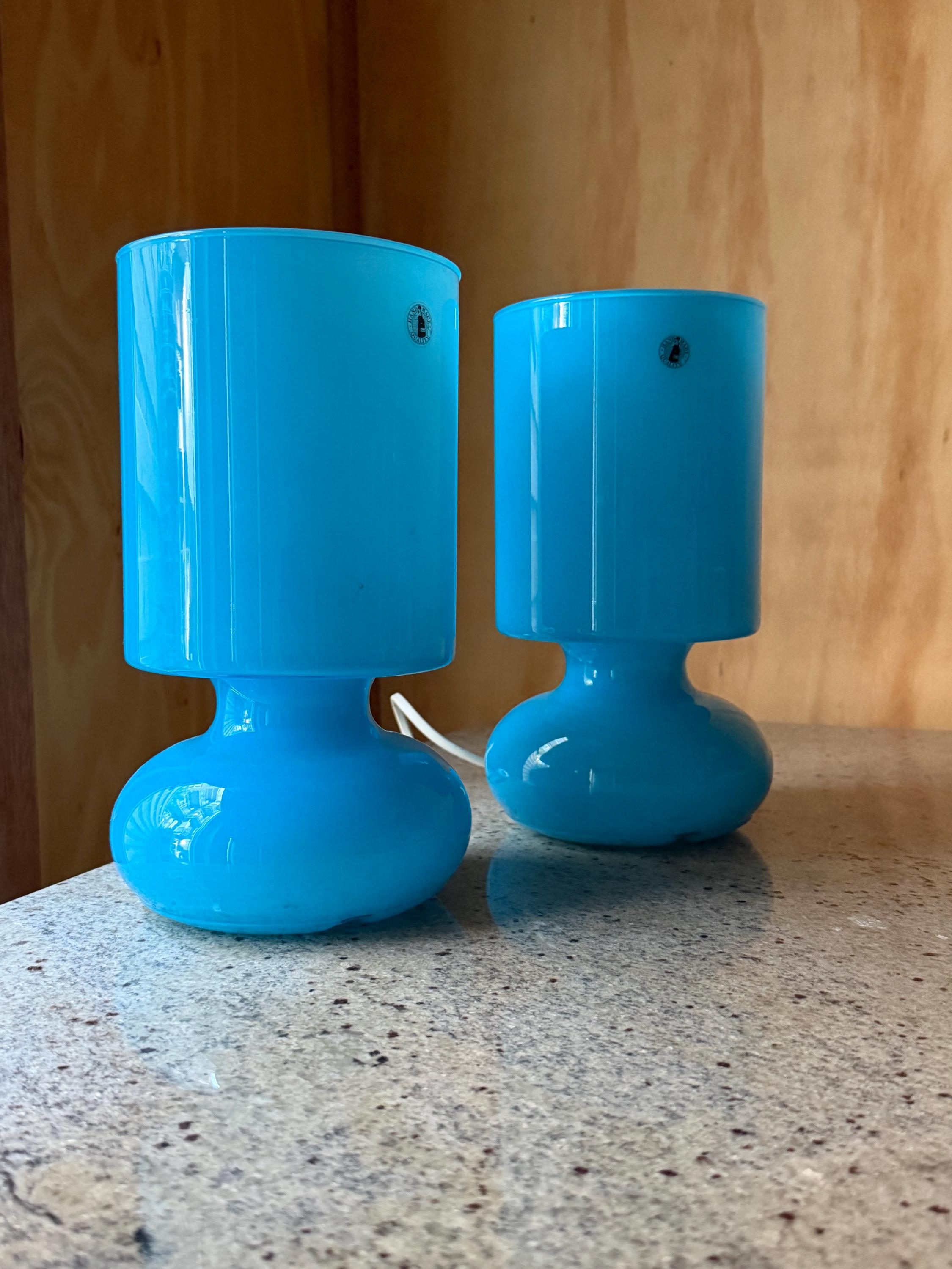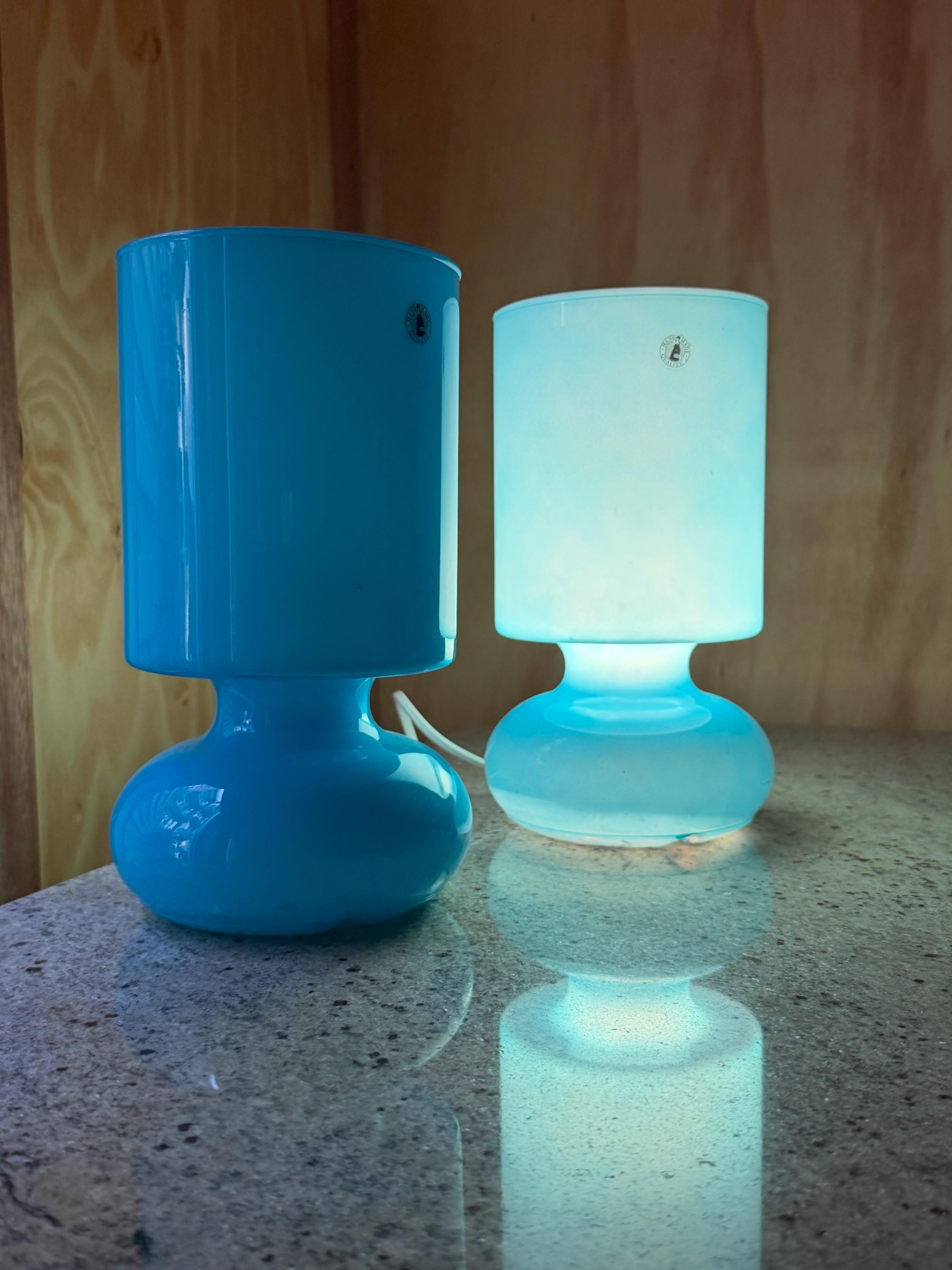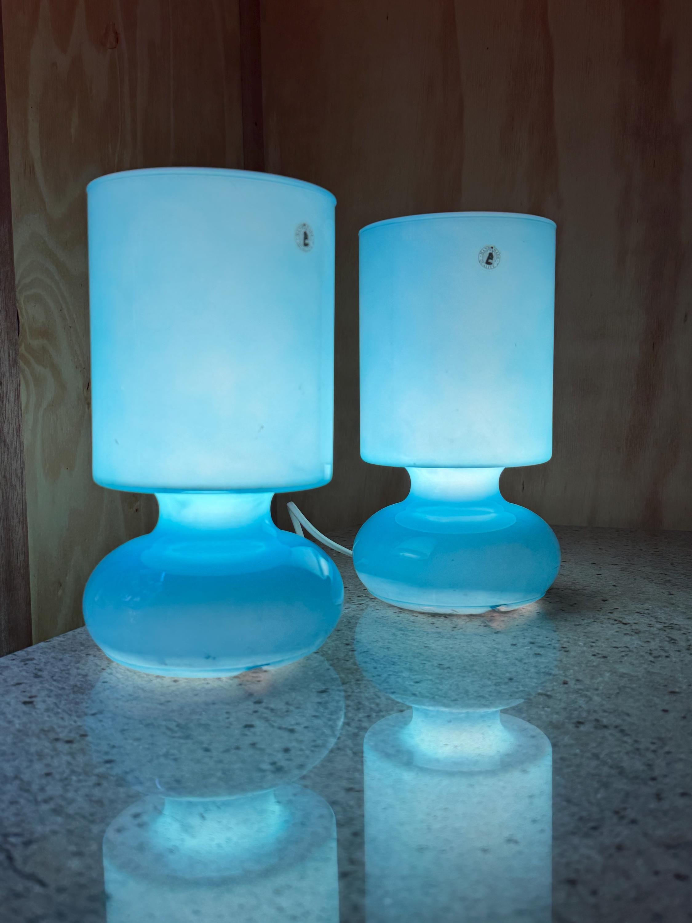 Their sculptural shape and vibrant blue color make them both functional lighting and decorative statement pieces for **retro, mid-century inspired, or modern interiors**.