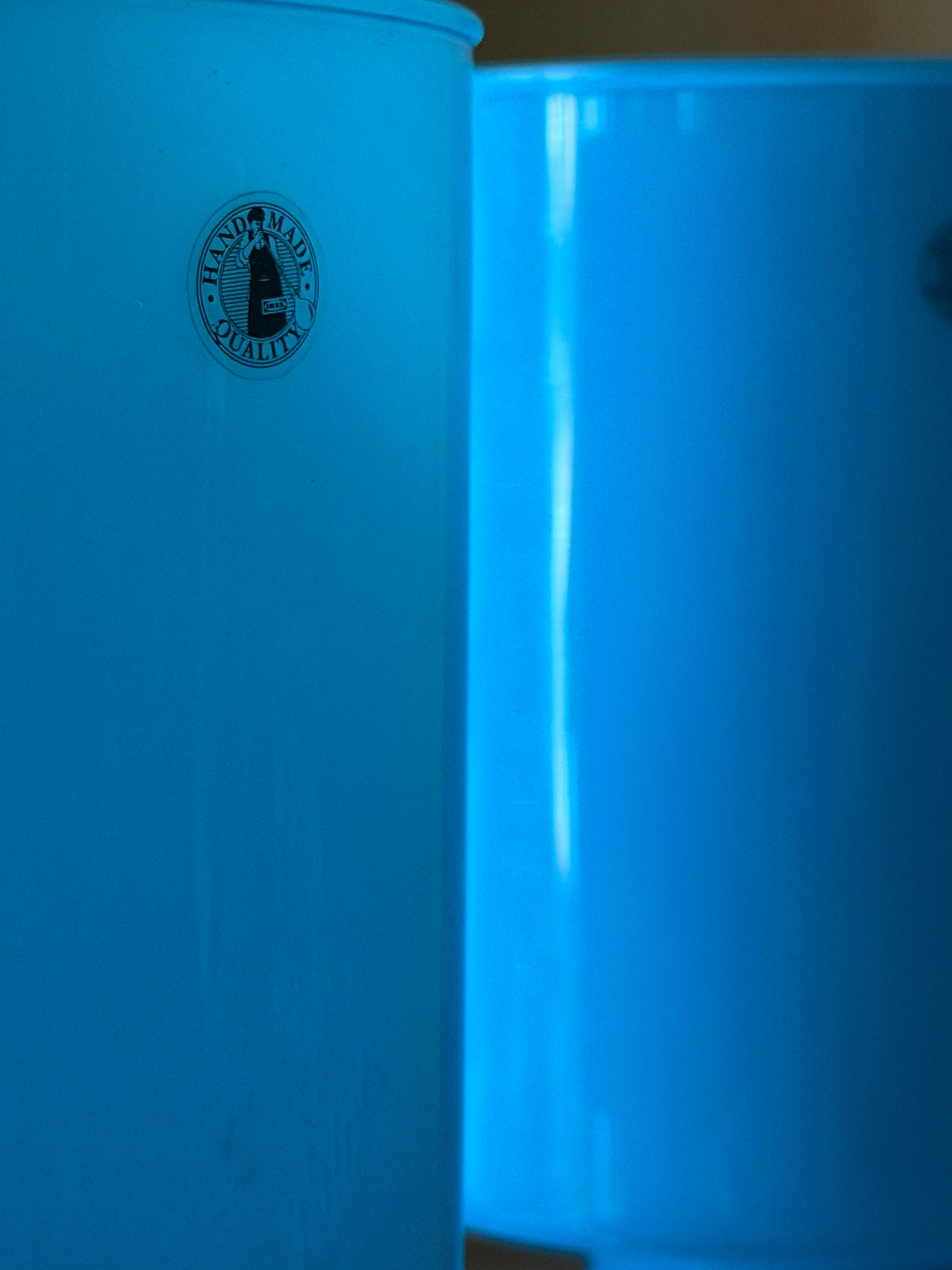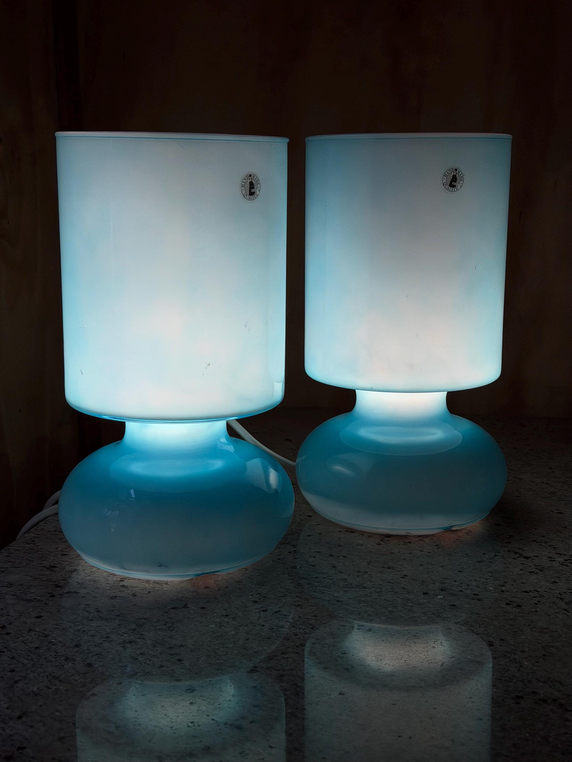 Beautiful **set of two vintage IKEA Lykta mushroom lamps** from the 1990s in a stunning soft blue opaline glass. These iconic lamps feature the classic rounded “mushroom” silhouette that perfectly captures the playful **space age aesthetic** and clean Scandinavian design IKEA became known for.